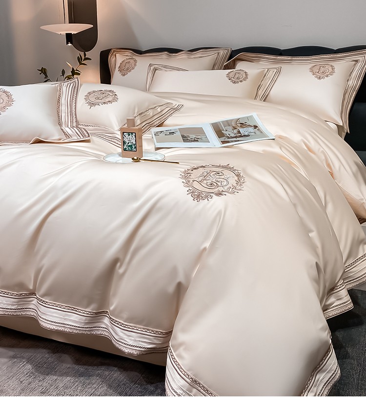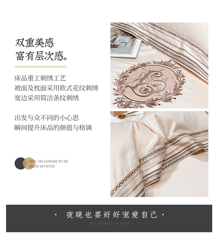 柔觉家纺 天丝刺绣贡缎提花全棉四件套,伊贝尔-本白