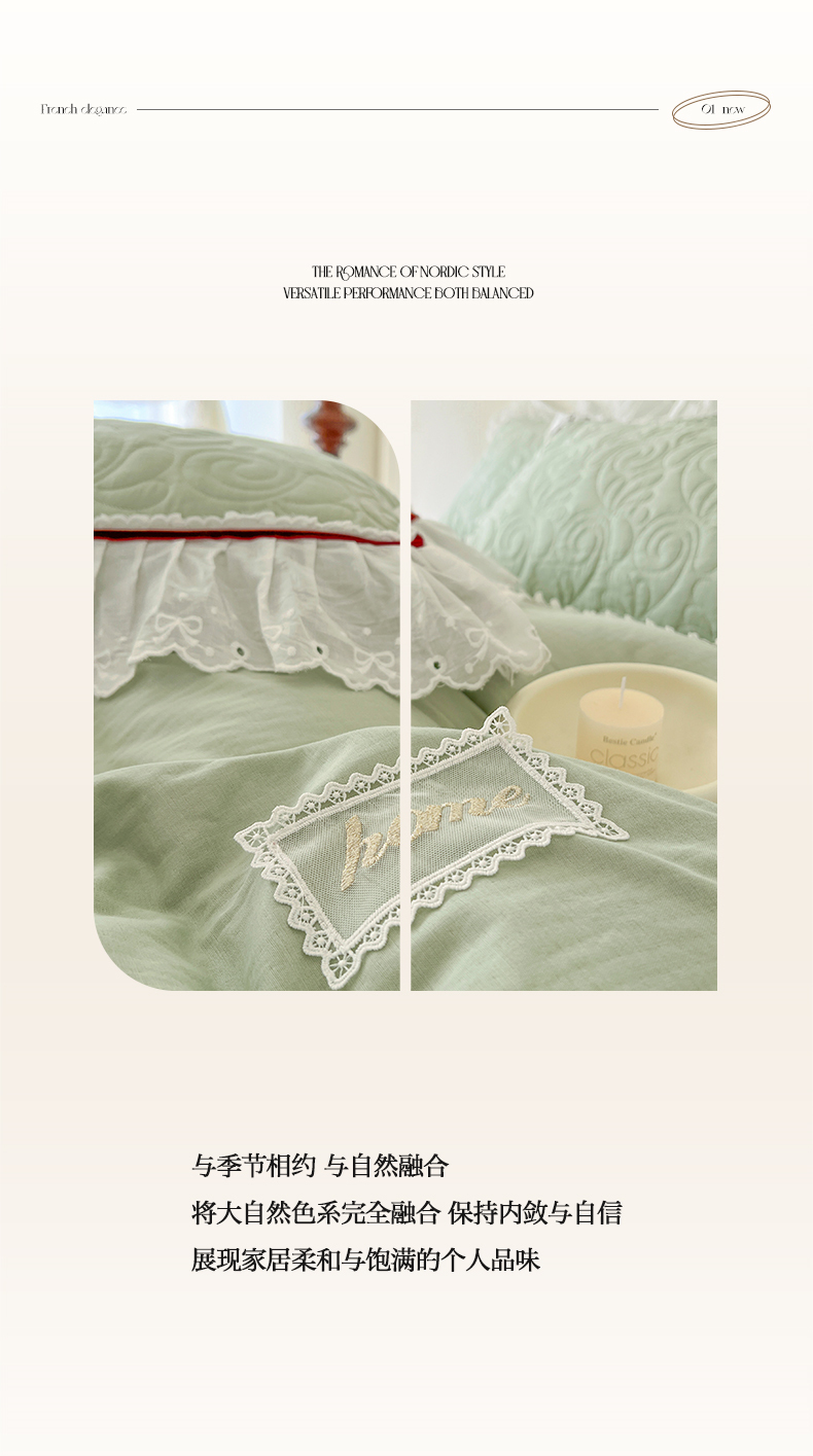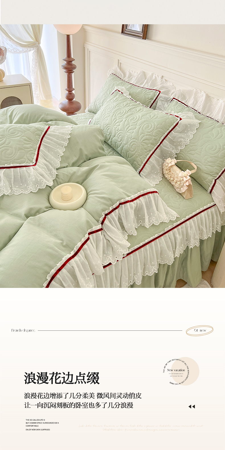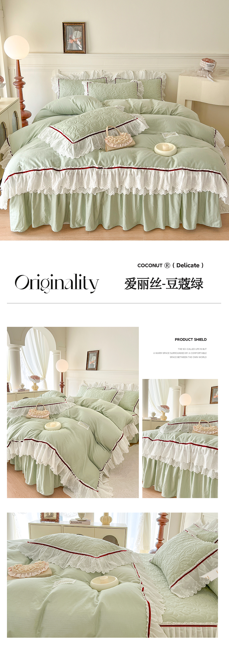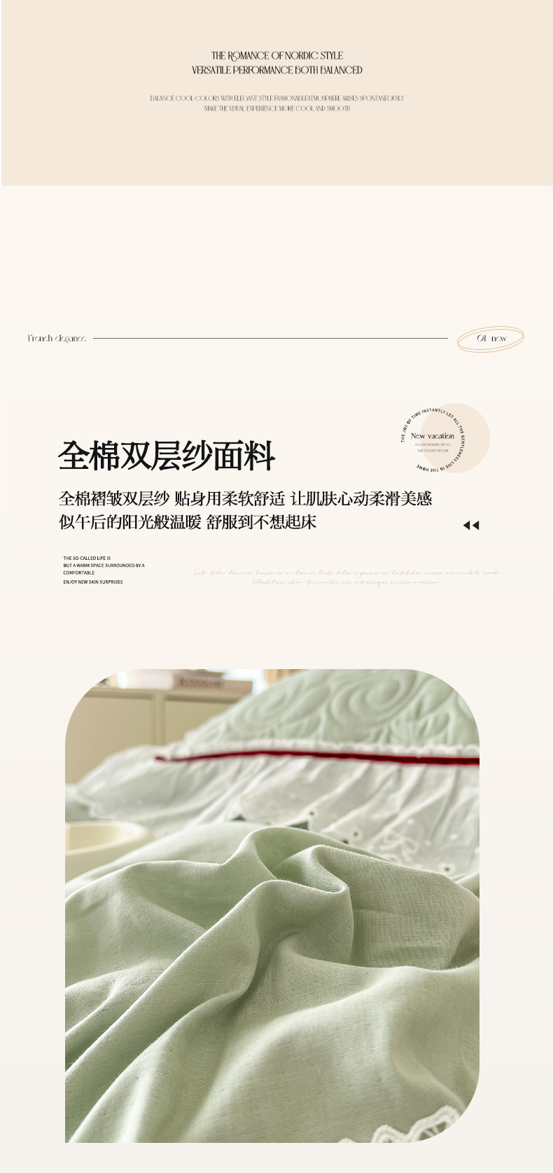 当前位置: 91家纺网 > 商品网购 > 床品套件 > 四件套 > 双层纱四件套 > 麒豆豆 2024新款全棉双层纱花边款爱丽丝系列四件套 豆蔻绿