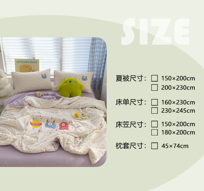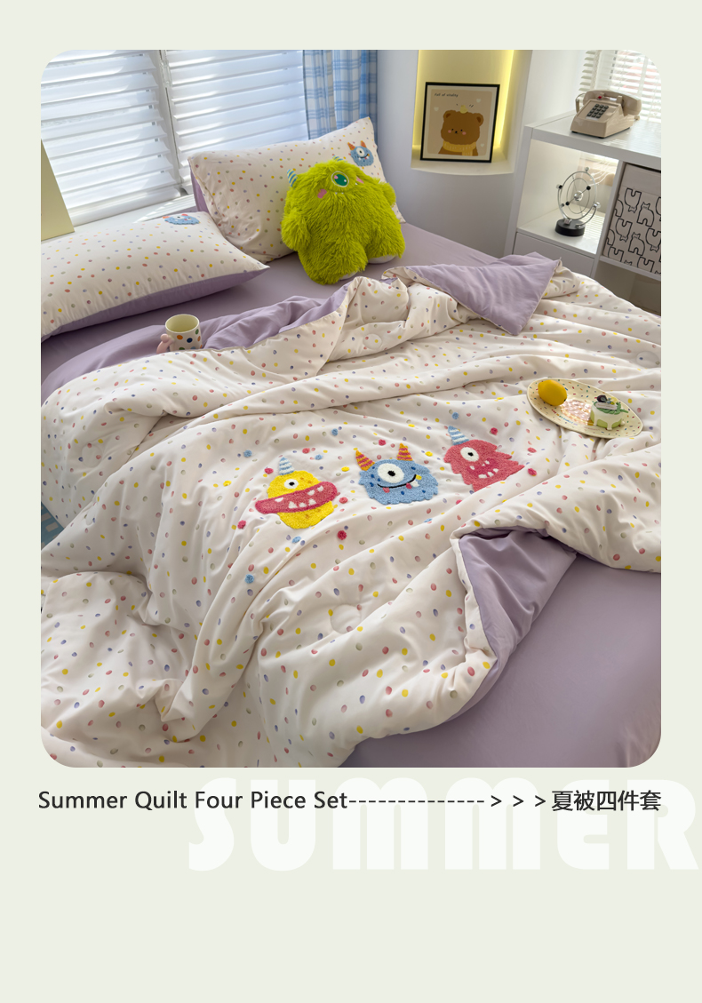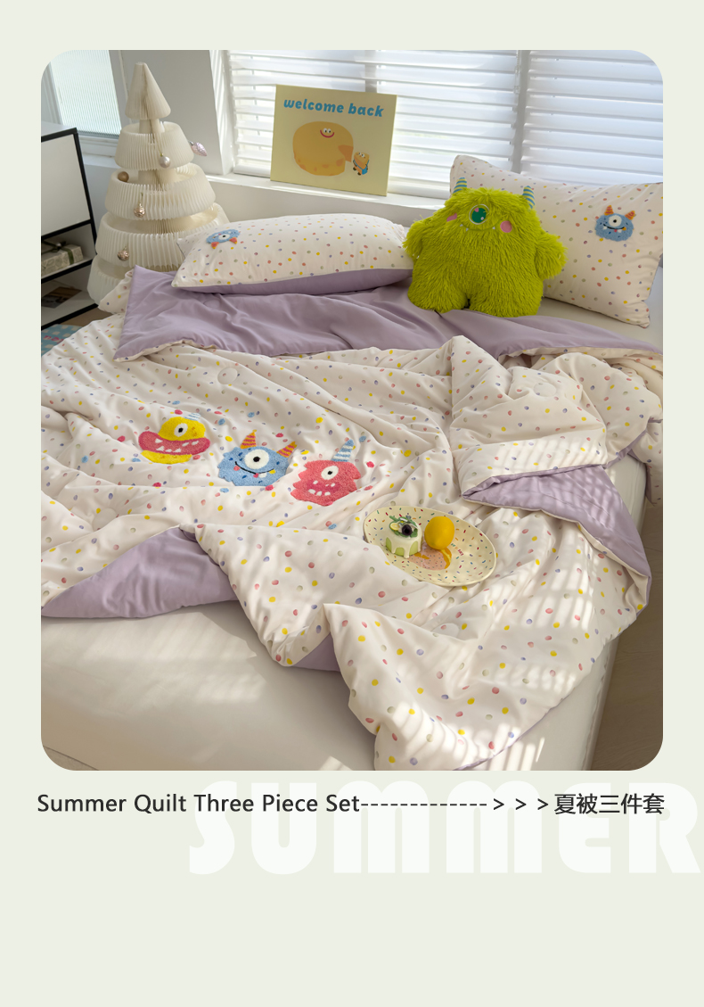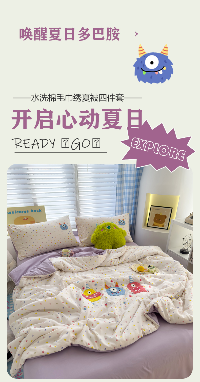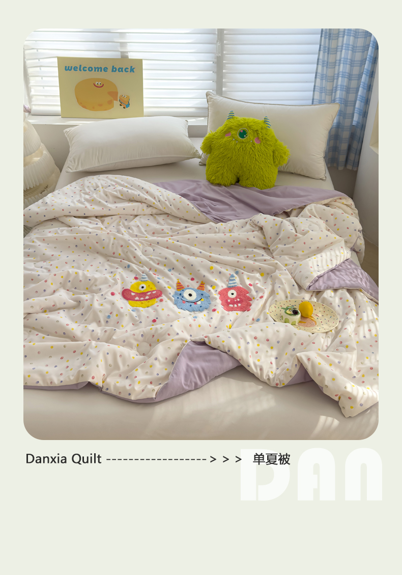• 91家纺网 家纺一手货源 找家纺 曼谷家纺 2025新款水洗棉超软毛巾绣夏被直播热款 三小怪-波点紫