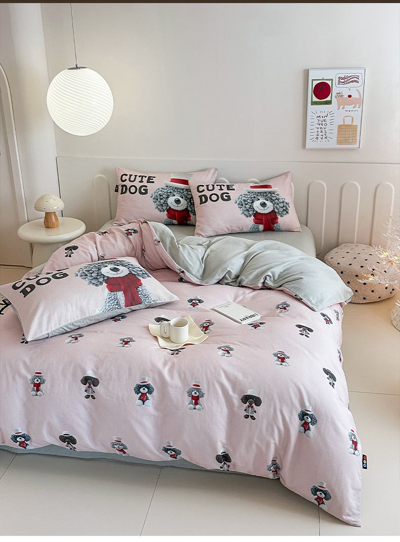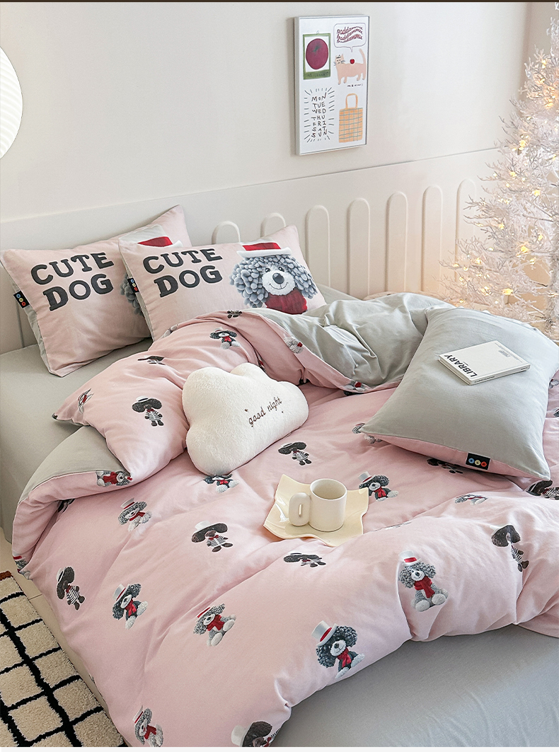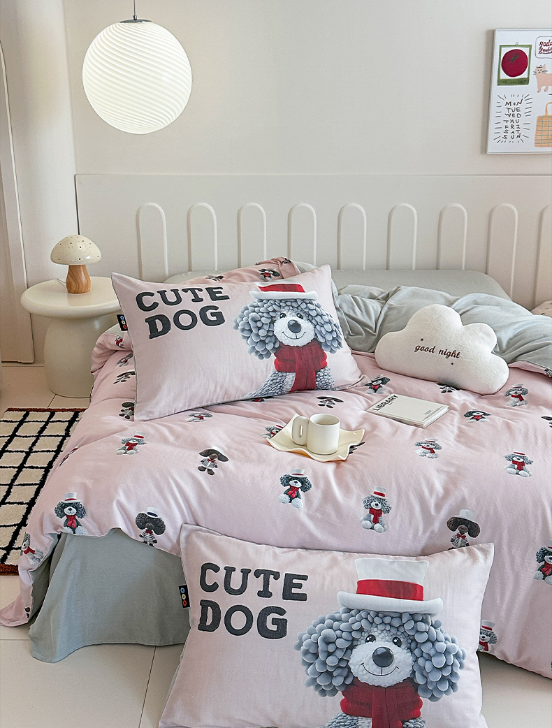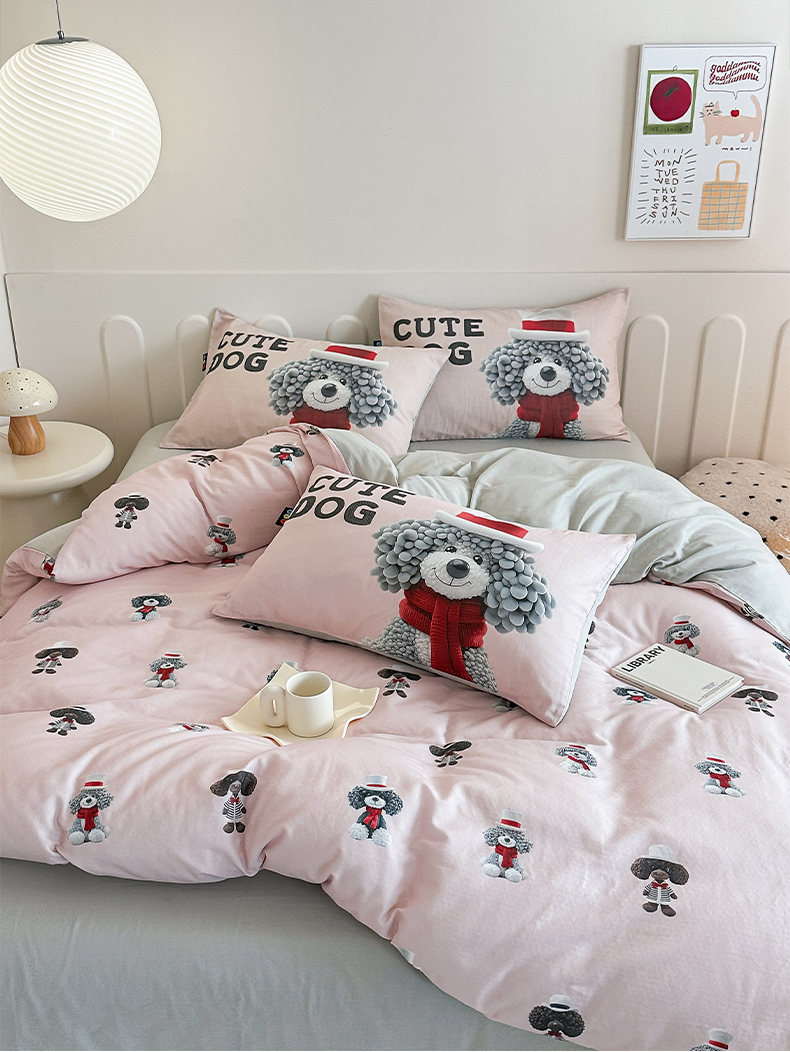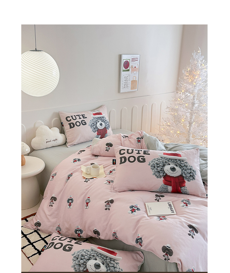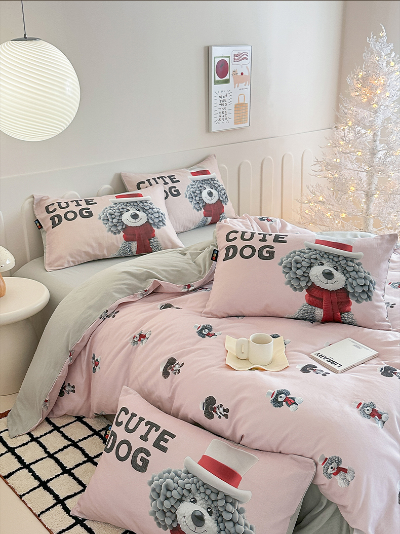 商品名称:RYB红黄兰 2025新款ins卡通5D立体数码全棉纯棉有氧双层纱四件套系列 粉色小奶狗