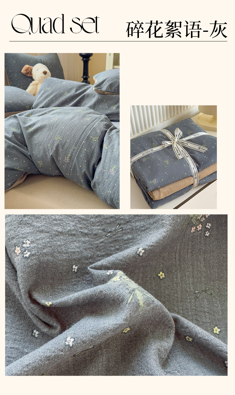 当前位置: 91家纺网 > 商品网购 > 床品套件 > 四件套 > 双层纱四件套 > 亨通家纺 2025新款复古原麻双层纱臻至系列四件套 碎花絮语-灰
