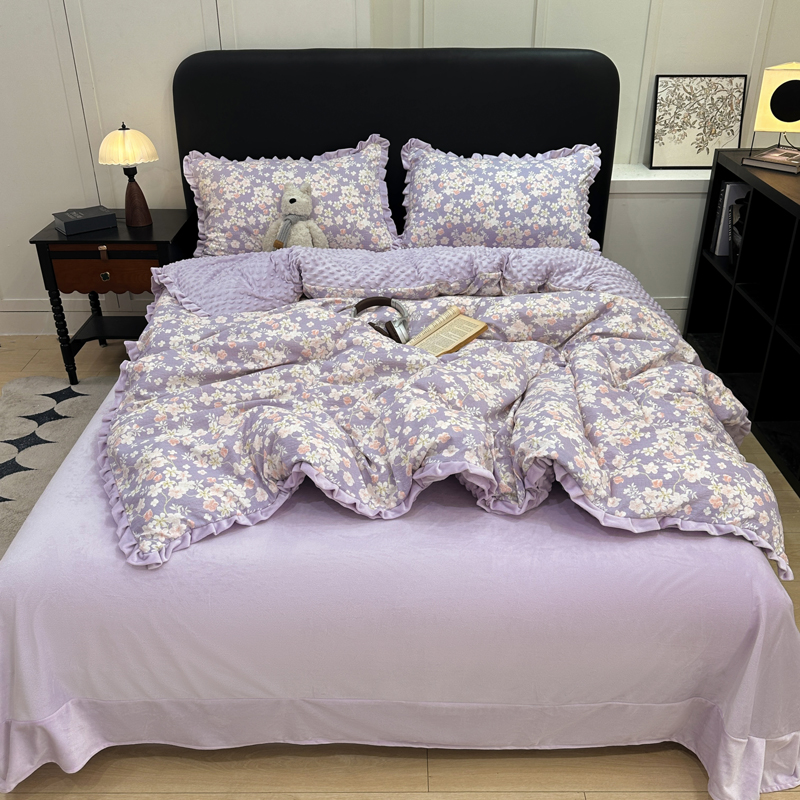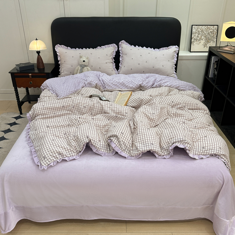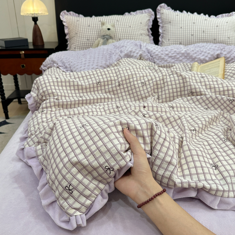 仟网汇 2025新款保暖舒适棉加绒四件套 蝴蝶结点点- 紫