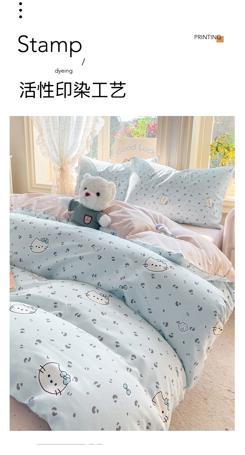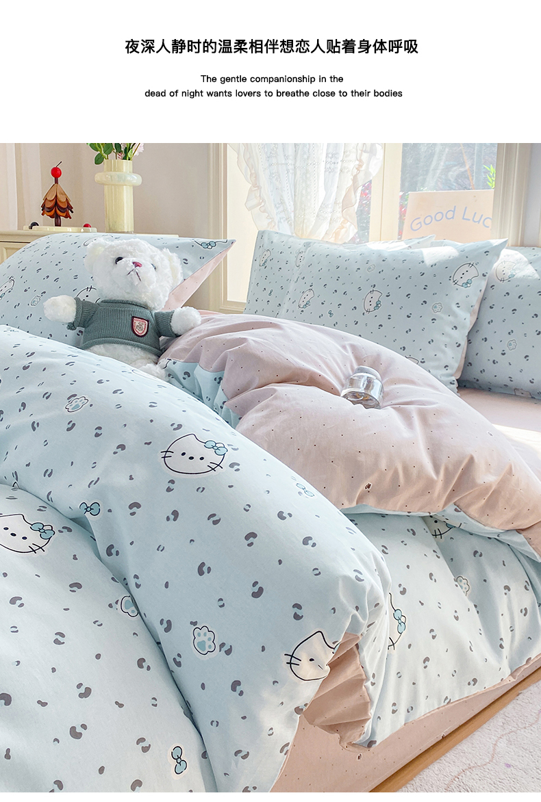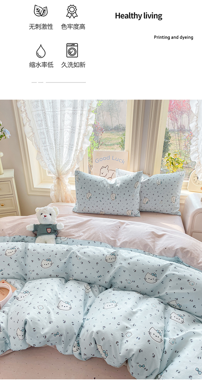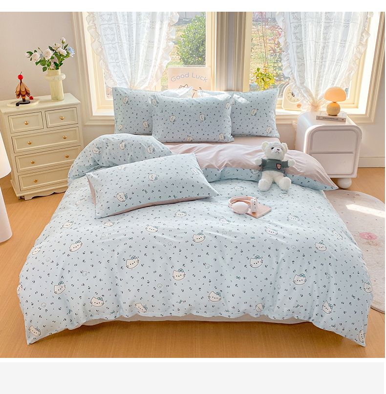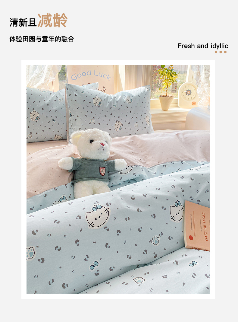 当前位置: 91家纺网 > 商品网购 > 床品套件 > 四件套 > 全棉普通四件套 > 黑马家居 2026新款13070全棉印花小清新卡通花卉四件套系列 乖巧凯蒂