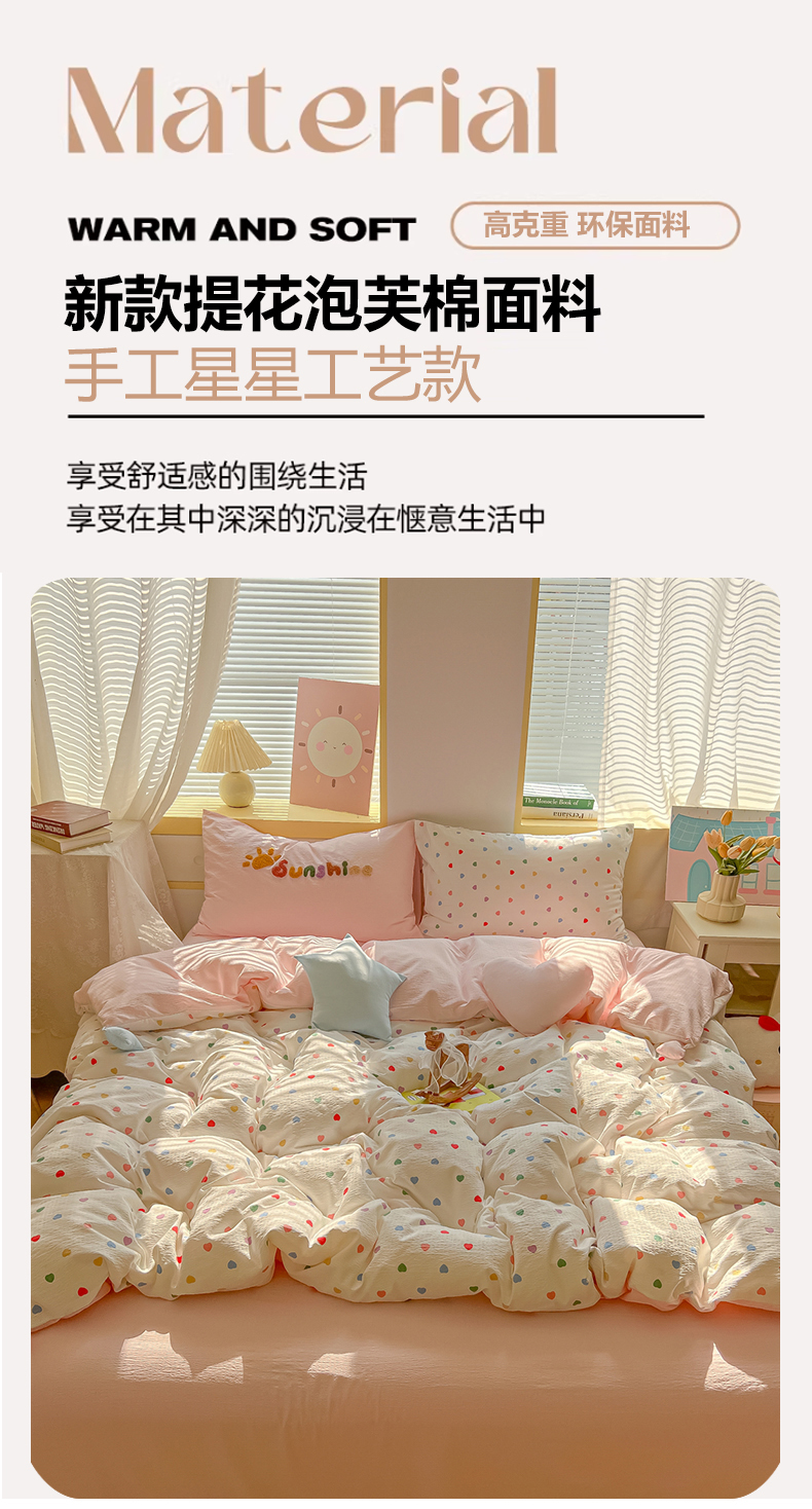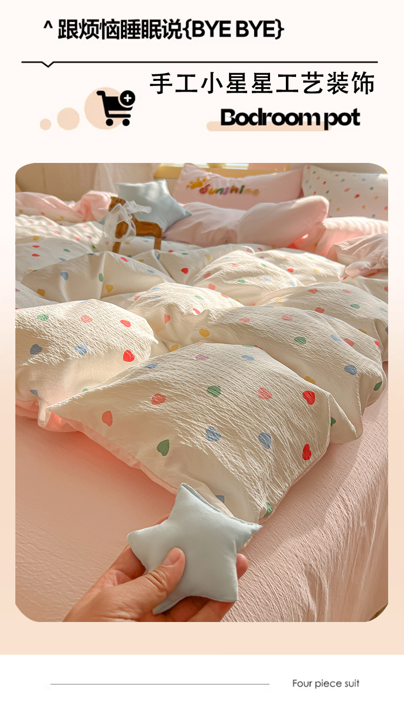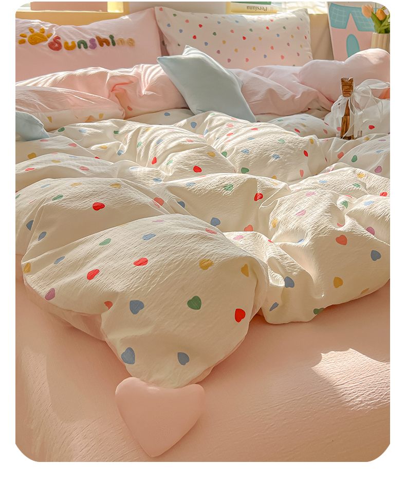 子钦家纺 2026春夏新款提花泡芙棉可爱小清新手工爱心小星星系列床单床笠四件套-流星花园 流星花园-七彩爱心