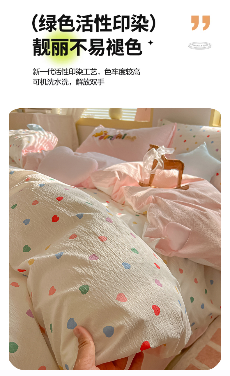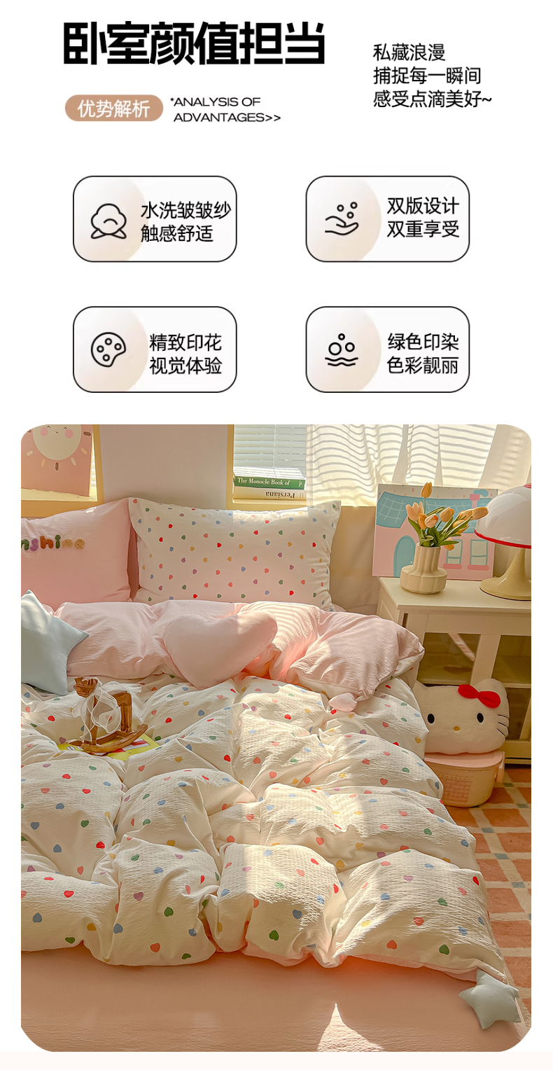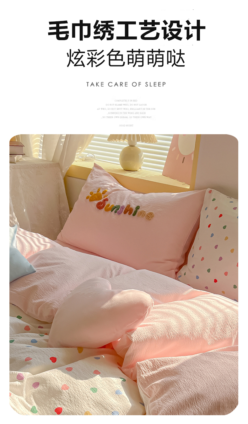 子钦家纺 2026春夏新款提花泡芙棉可爱小清新手工爱心小星星系列床单床笠四件套-流星花园 流星花园-七彩爱心