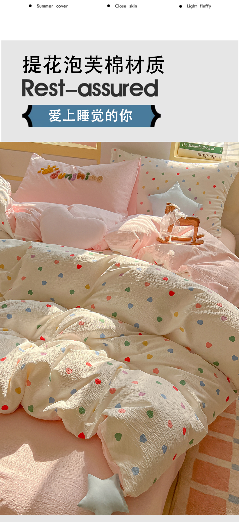 商品名称:子钦家纺 2026春夏新款提花泡芙棉可爱小清新手工爱心小星星系列床单床笠四件套-流星花园 流星花园-七彩爱心