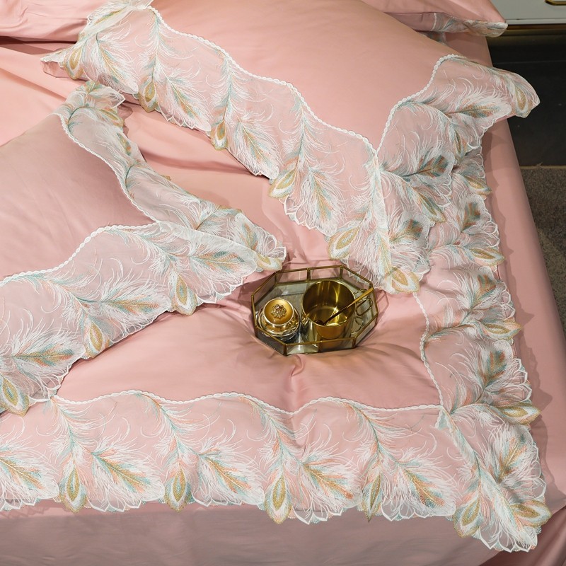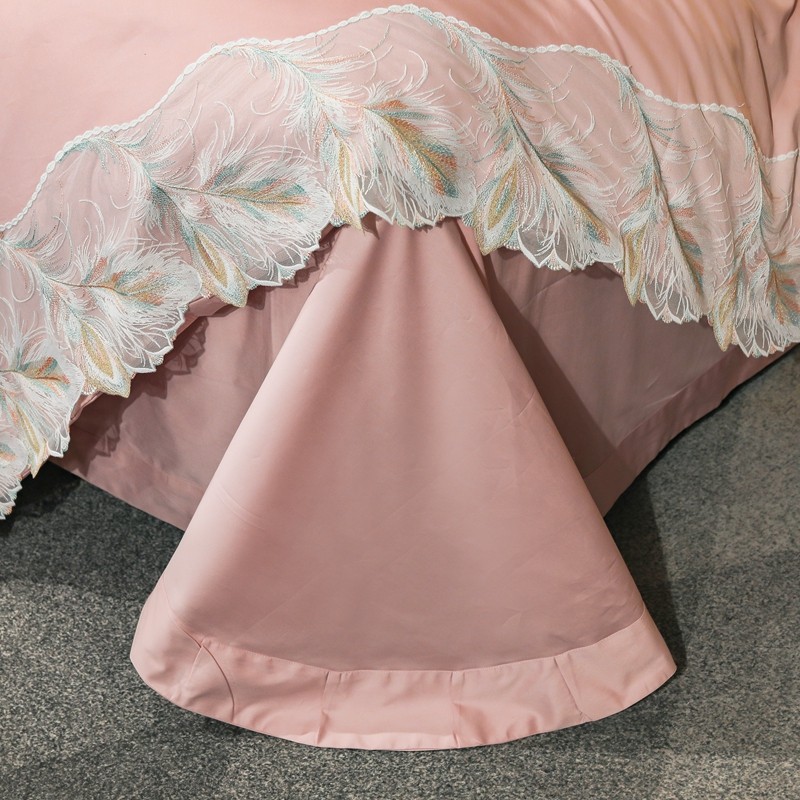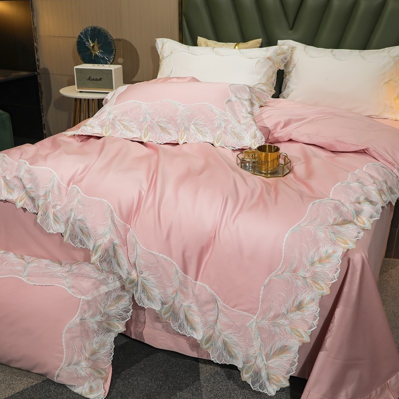榻尚家居新款纯美蕾丝大花边长绒棉贡缎四件套 安娜 粉