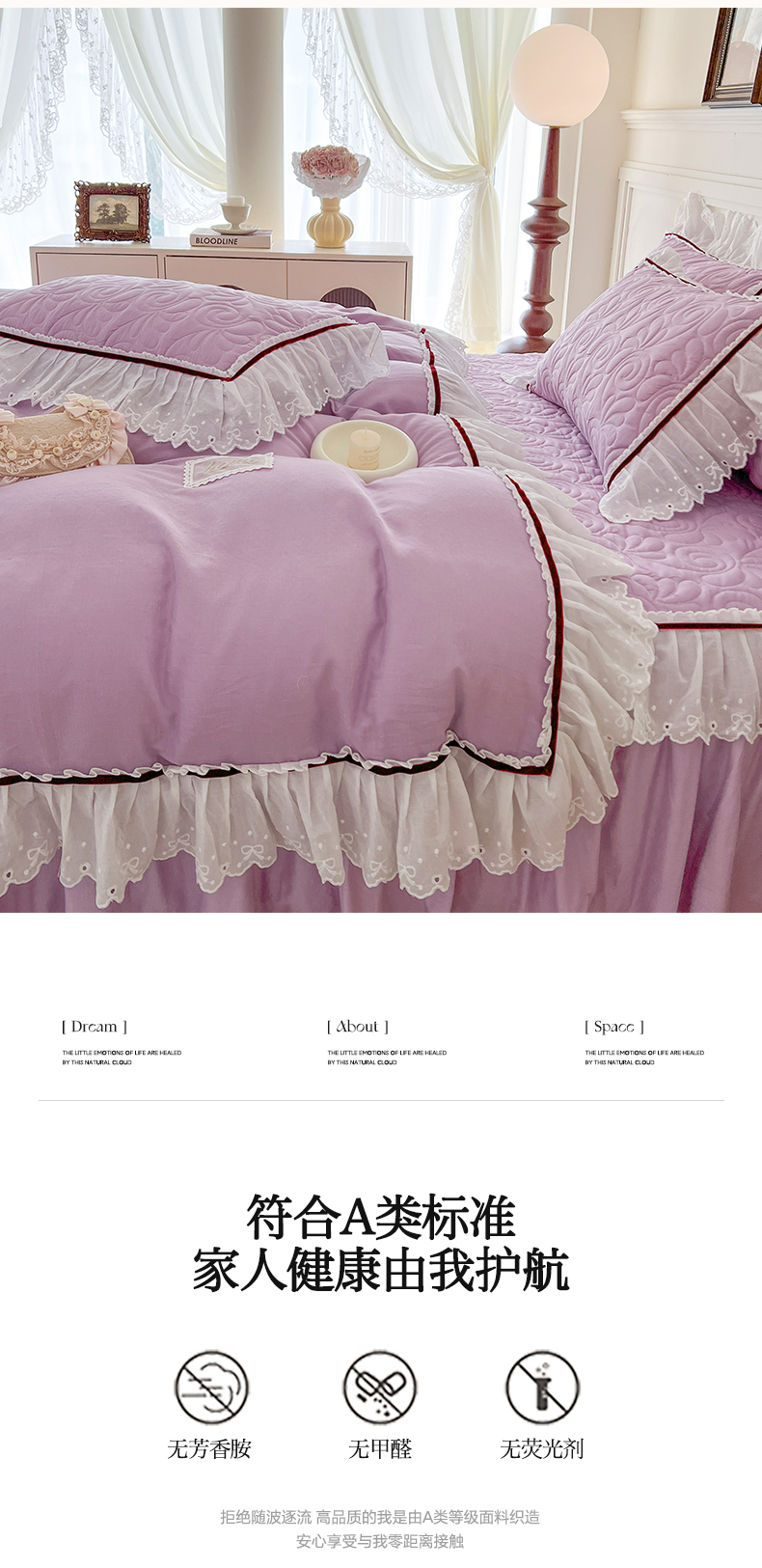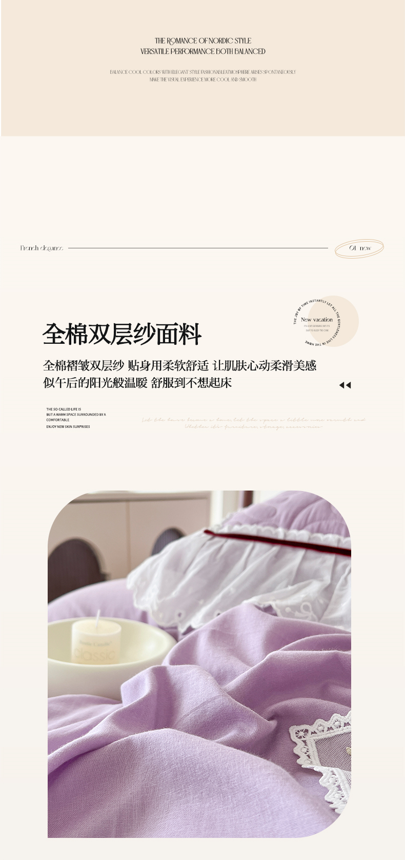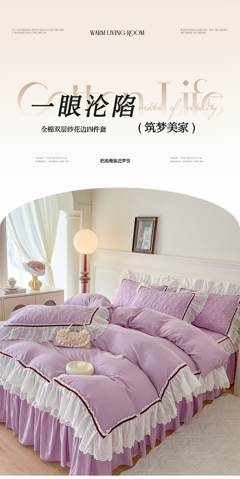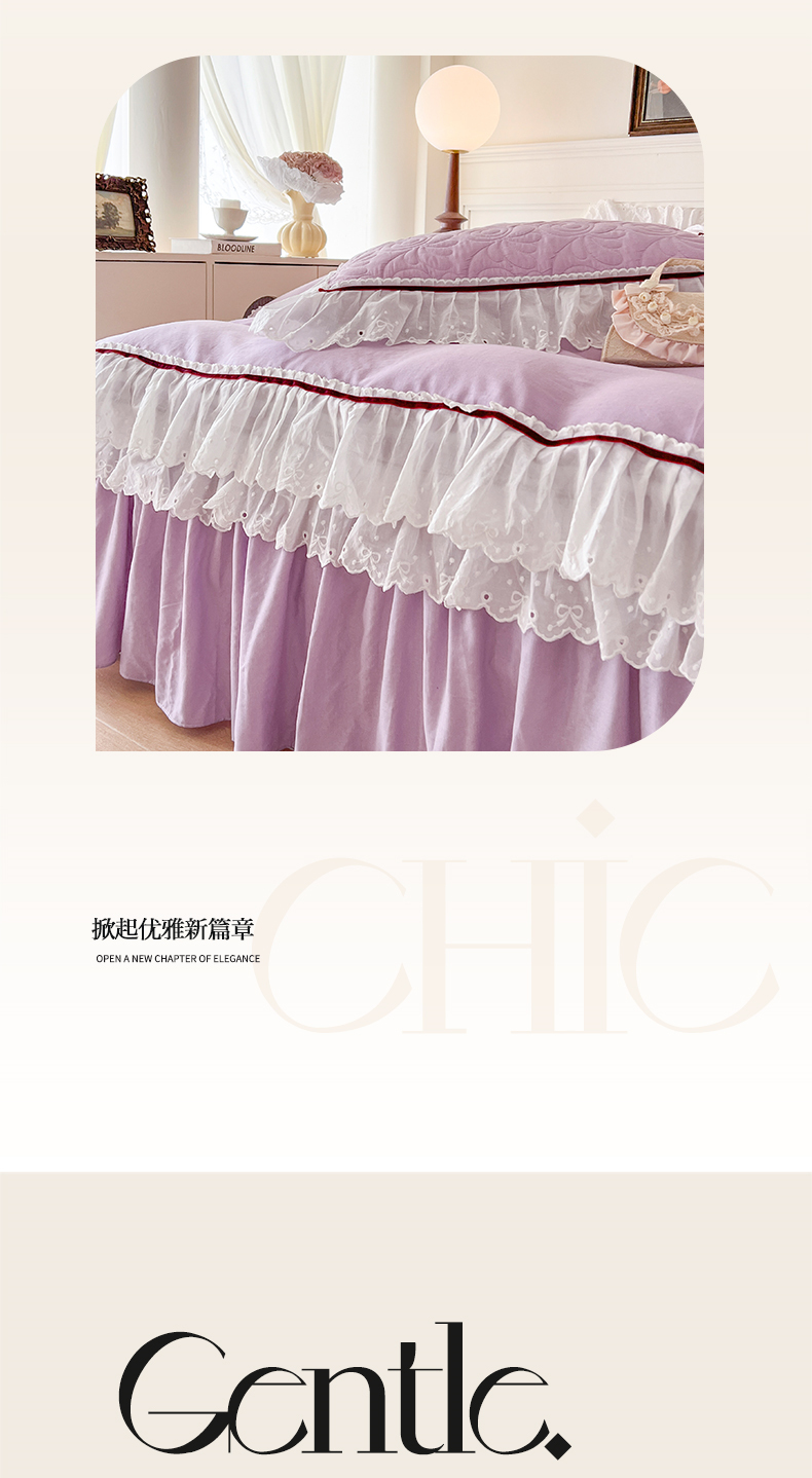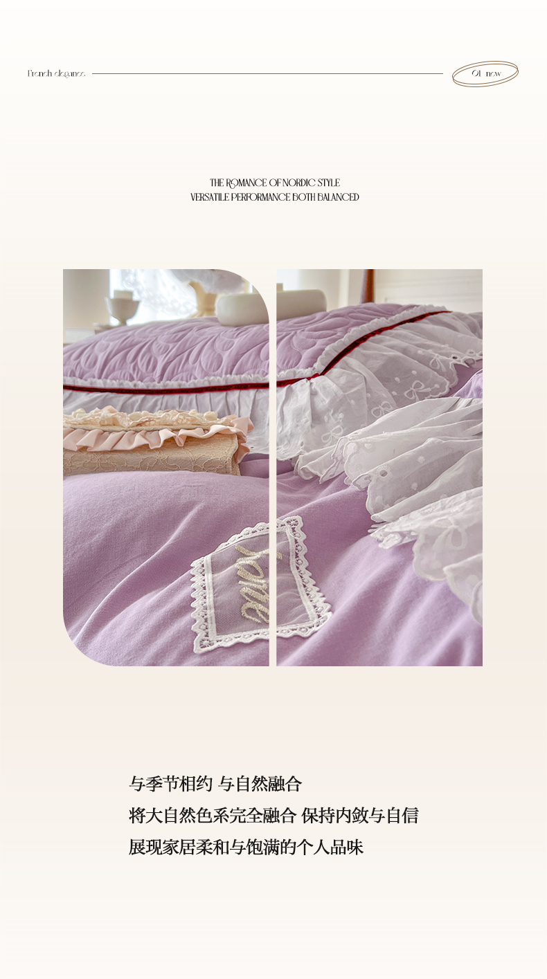 当前位置: 91家纺网 > 商品网购 > 床品套件 > 四件套 > 双层纱四件套 > 麒豆豆 2024新款全棉双层纱花边款爱丽丝系列四件套 风信紫