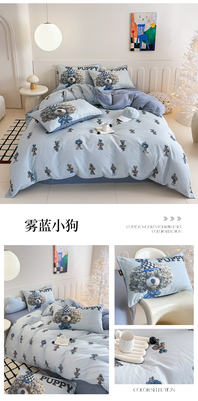 (总)RYB红黄兰 2025新款设计师原创A版抽条兔兔绒B版牛奶绒印花四件套,咖色潦草狗,波点黑猫,包装展示图,星星蝴蝶结,蓝色兔兔,奶油西高地
