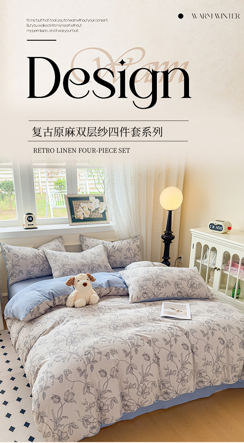 当前位置: 91家纺网 > 商品网购 > 床品套件 > 四件套 > 双层纱四件套 > 亨通家纺 2025新款复古原麻双层纱臻至系列四件套 蝴蝶结花-橘