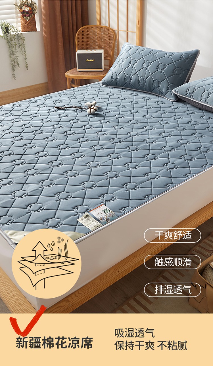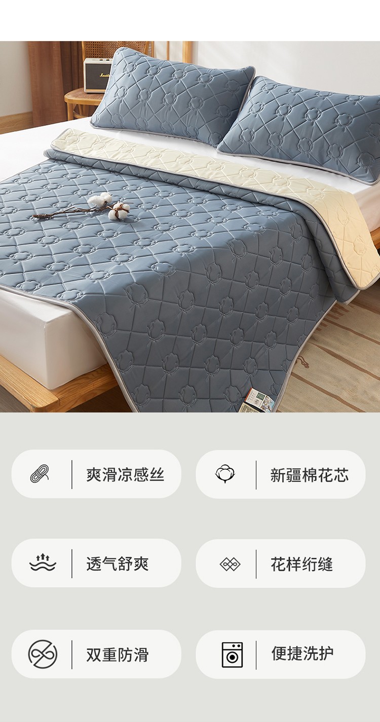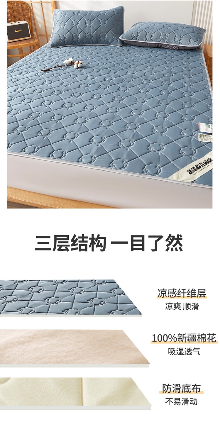 西域种棉人 新疆棉花凉席冰丝凉感丝平铺款加厚床单款三件套纯色 卡布里蓝