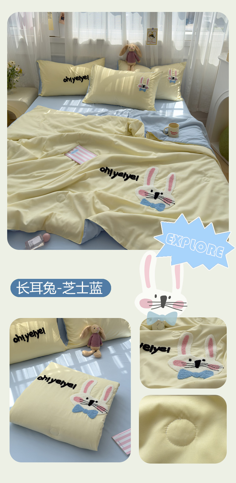 • 91家纺网 家纺一手货源 找家纺 曼谷家纺 软糯糯水洗棉夏凉被四件套单夏被被子 长耳兔-芝士蓝