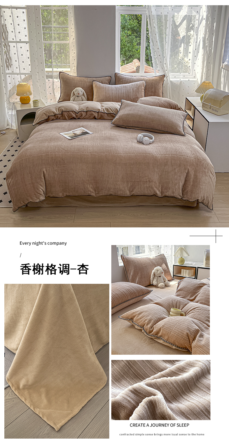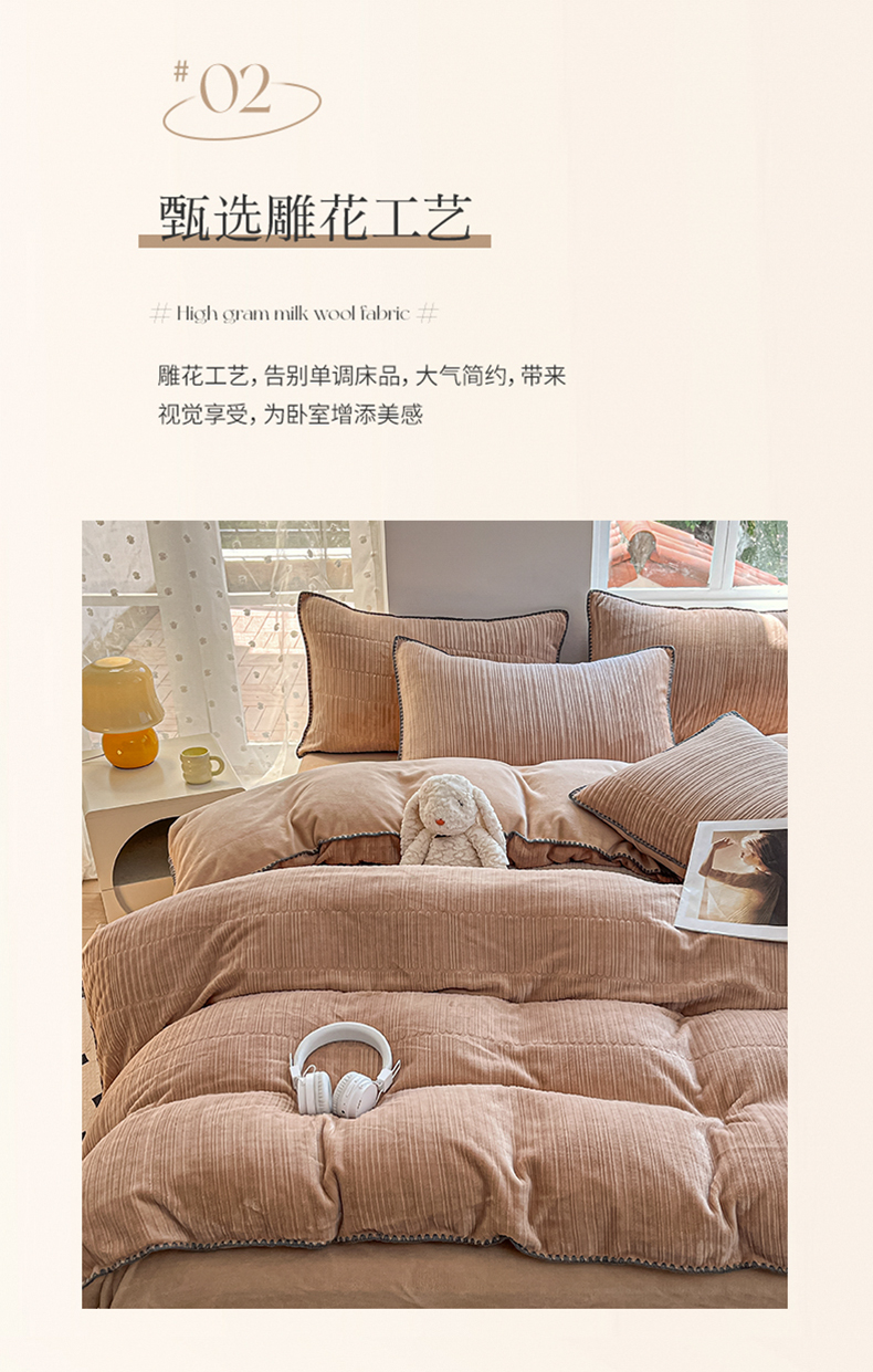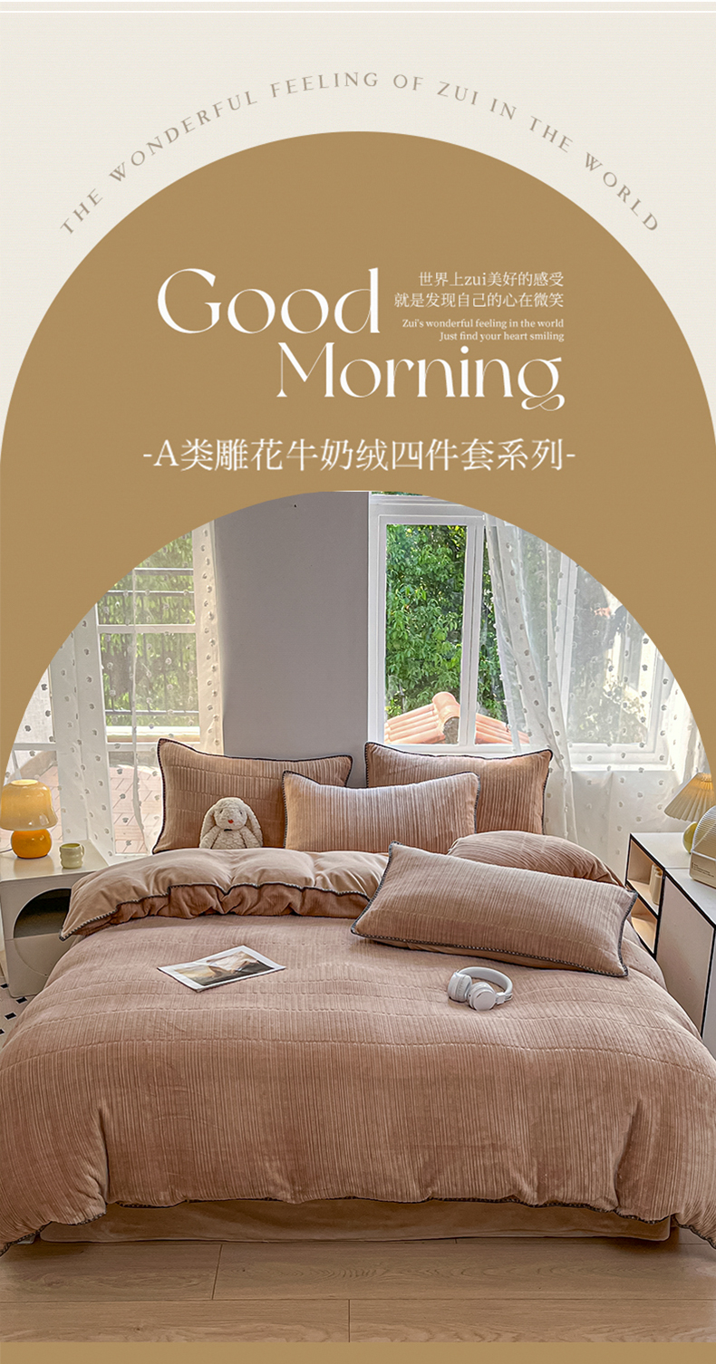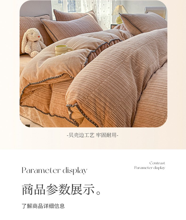 当前位置: 91家纺网 > 商品网购 > 床品套件 > 四件套 > 牛奶绒四件套 > 晚依家纺 2024新款230g纯色立体雕花牛奶绒四件套贝壳边加厚保暖定制定做 香榭格调-杏