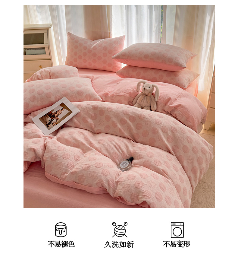 商品名称:菡宝 2025新款a类母婴级全棉色织三层纱提花被套纯棉被罩四件套支持定做定制尺寸 波点-粉