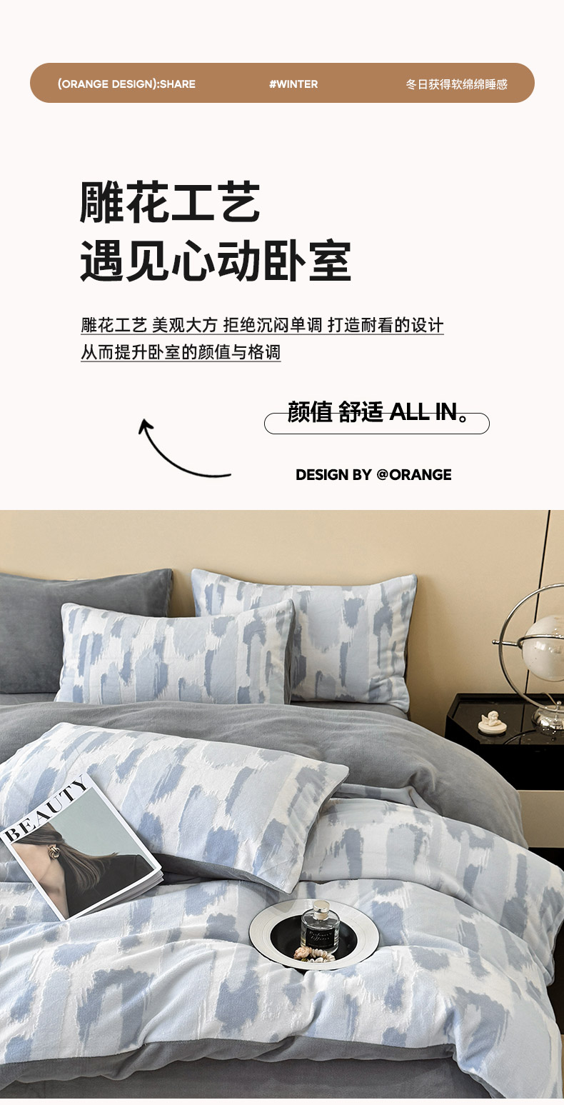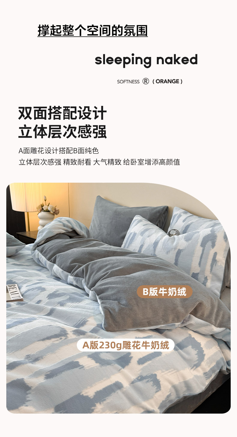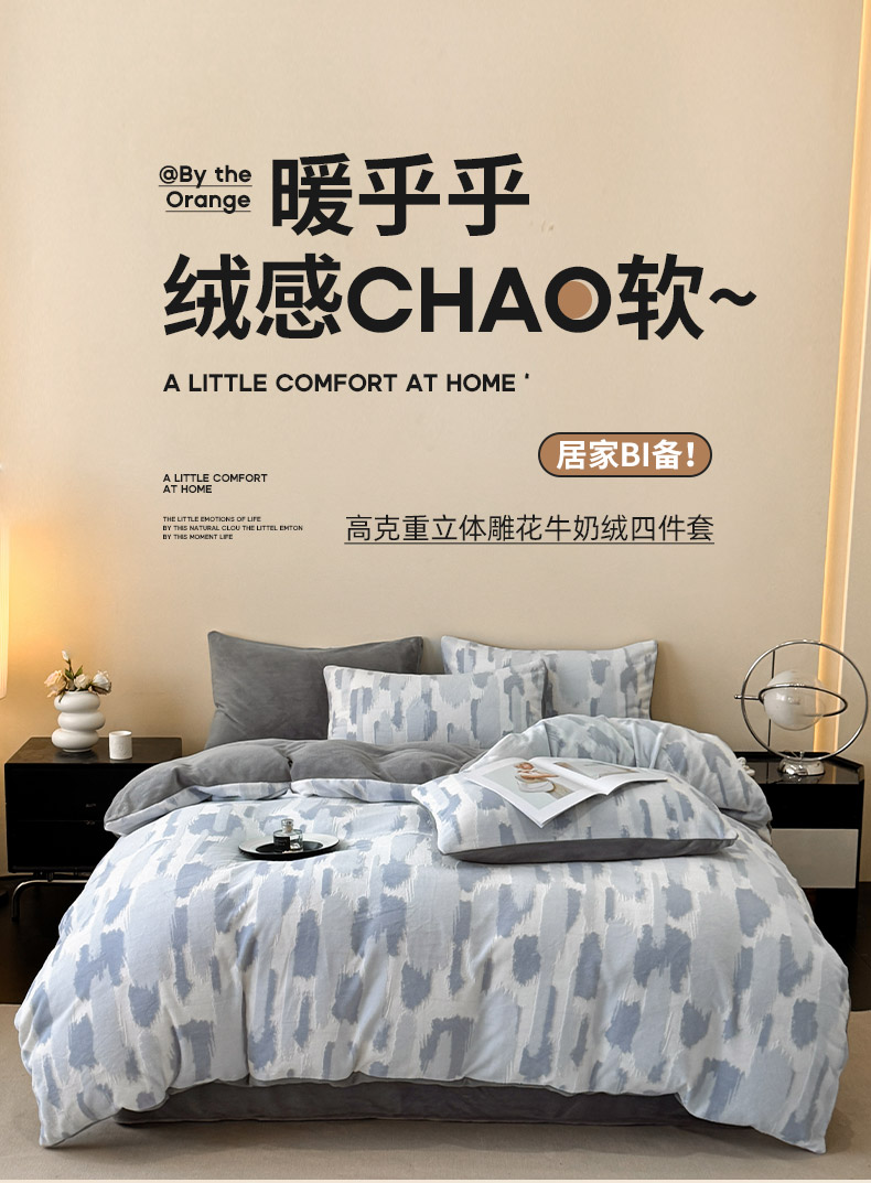 吾秀家居 2025新款立体雕花牛奶绒四件套- 柔美系列 空谷蓝