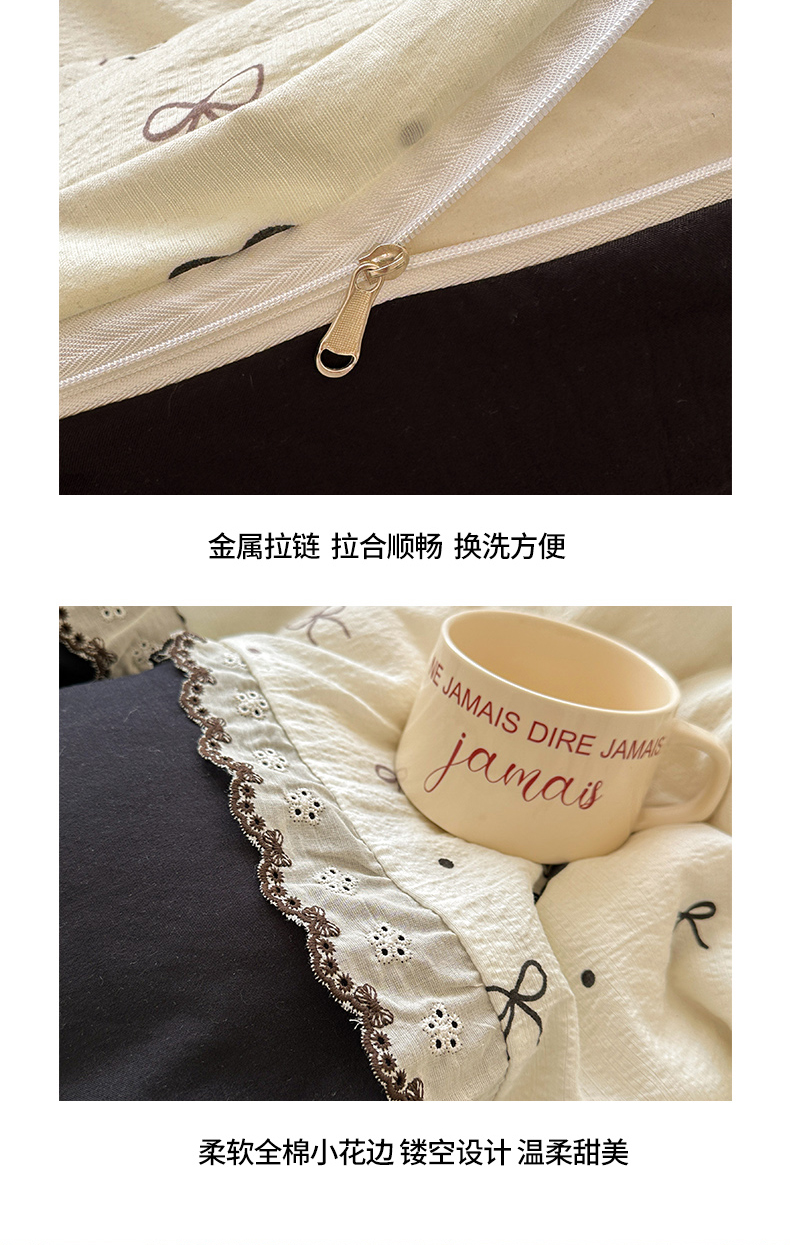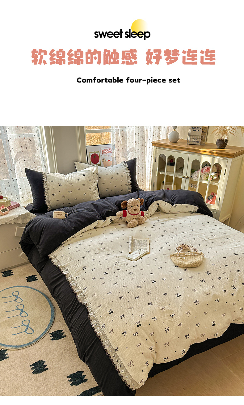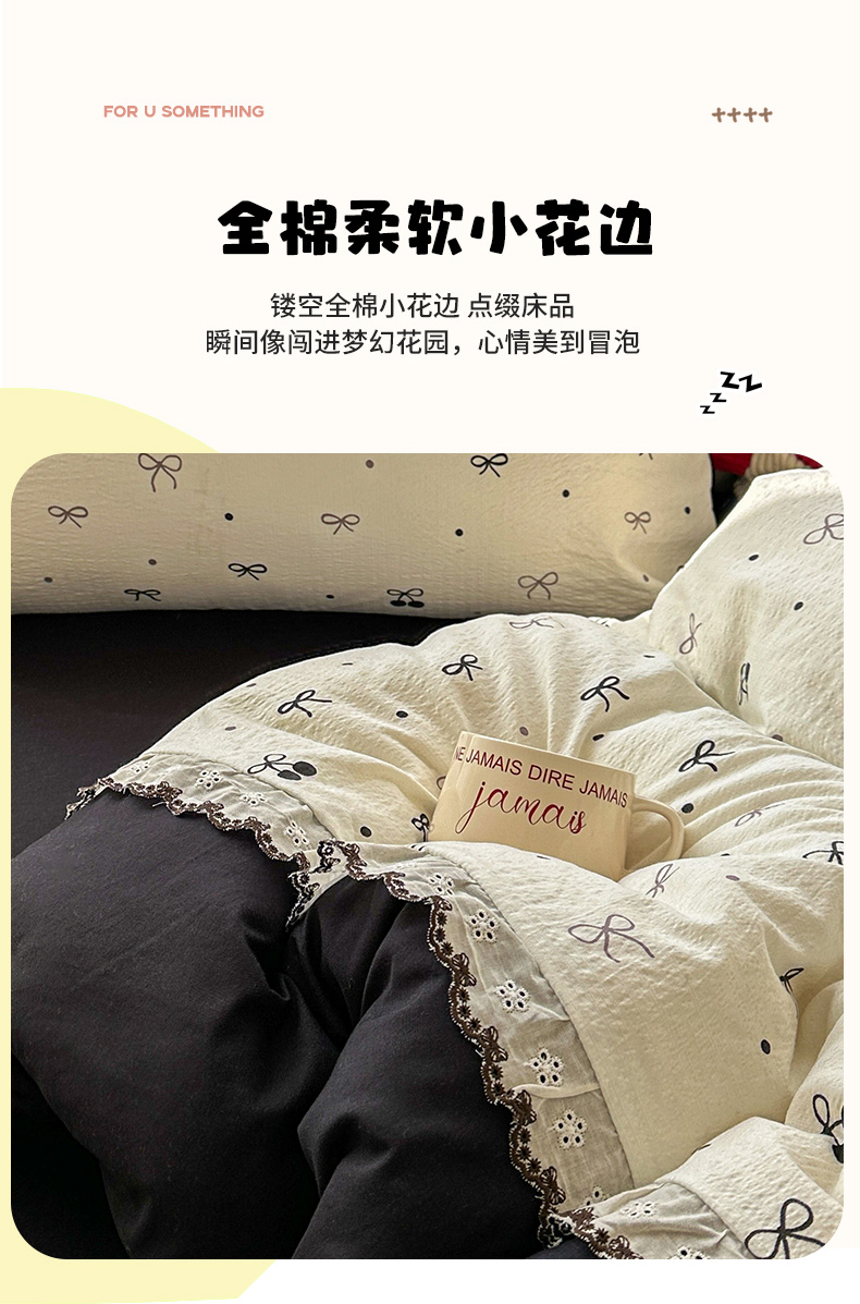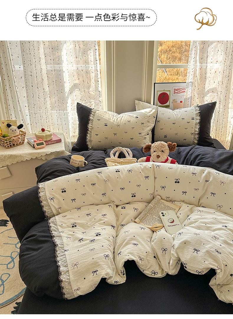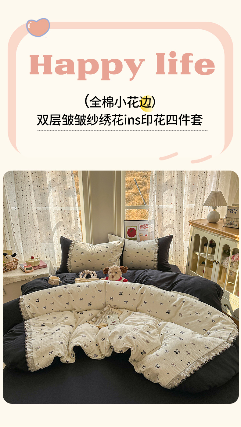 当前位置: 91家纺网 > 商品网购 > 床品套件 > 四件套 > 水洗棉四件套 > 贝凯瑞 2026新款小花边水洗棉绣花ins小清新床单床裙床笠四件套 黑樱梦境