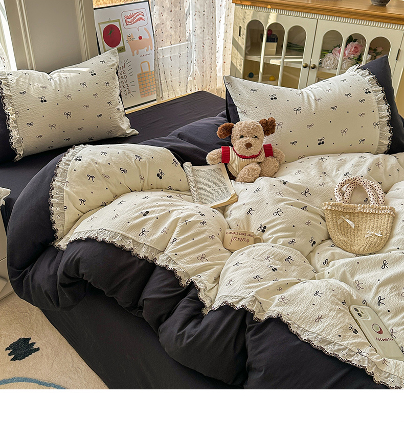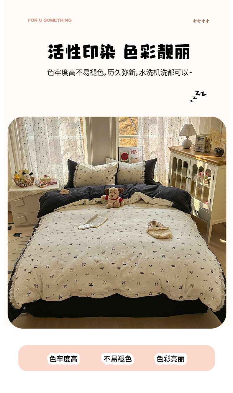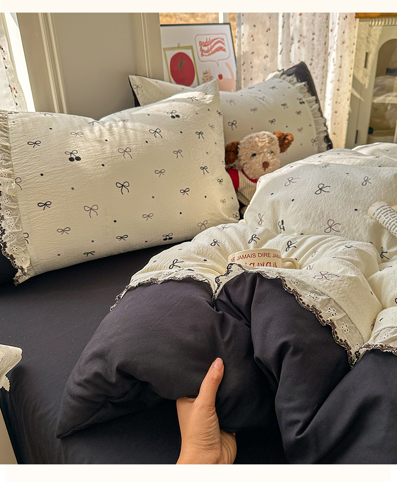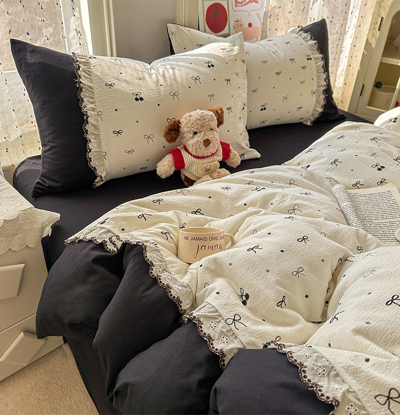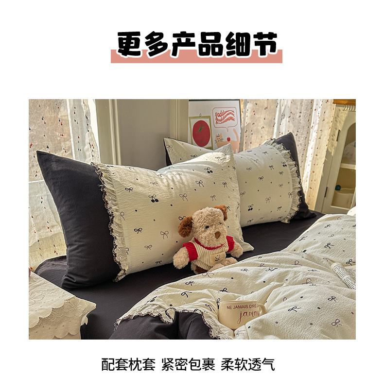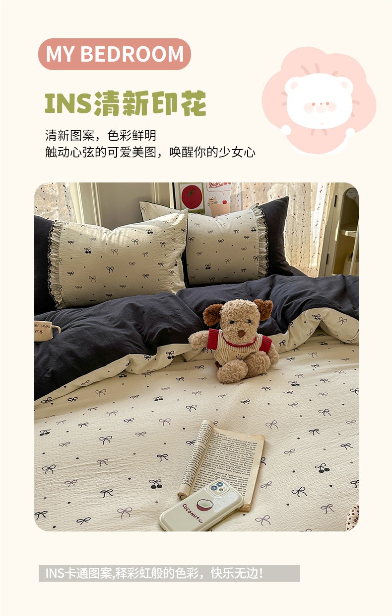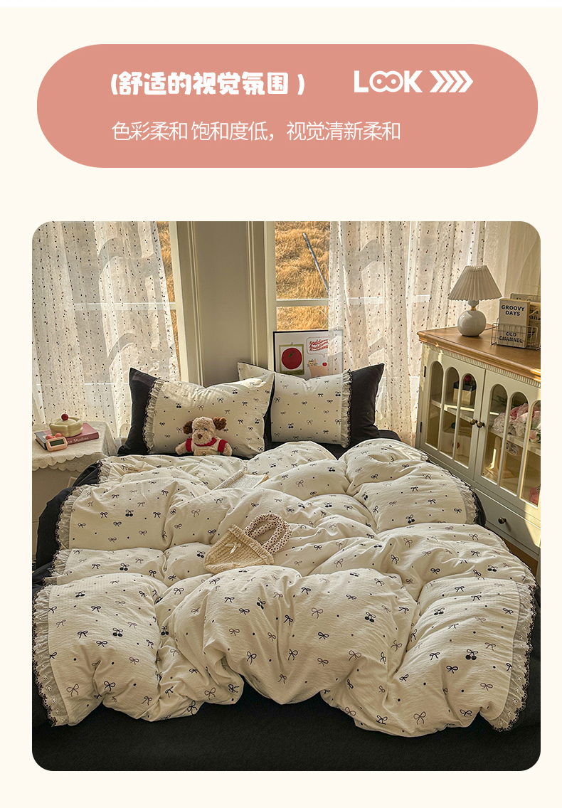 当前位置: 91家纺网 > 商品网购 > 床品套件 > 四件套 > 水洗棉四件套 > 贝凯瑞 2026新款小花边水洗棉绣花ins小清新床单床裙床笠四件套 黑樱梦境