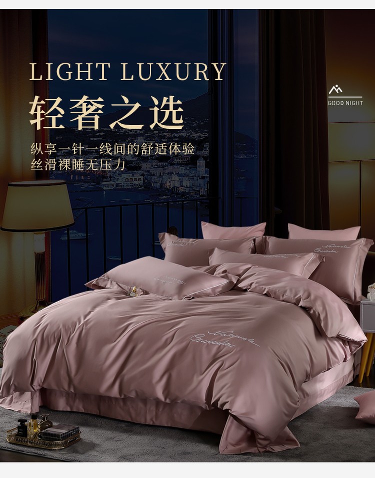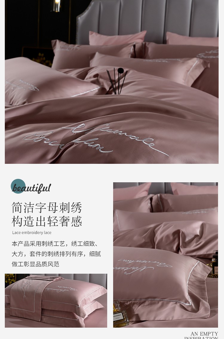 柔觉家纺 天丝刺绣贡缎提花全棉四件套,卡曼时尚-粉紫