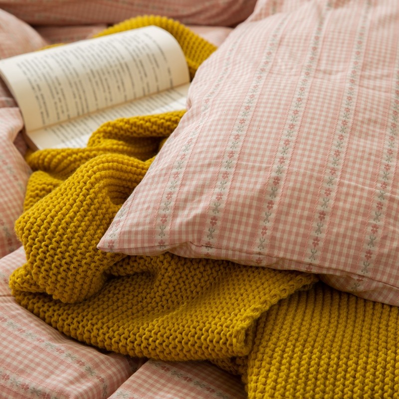 (总)尚品本色 2025新款全棉色织水洗棉格子绣花四件套,粉密格,灰密格,浅蓝密格