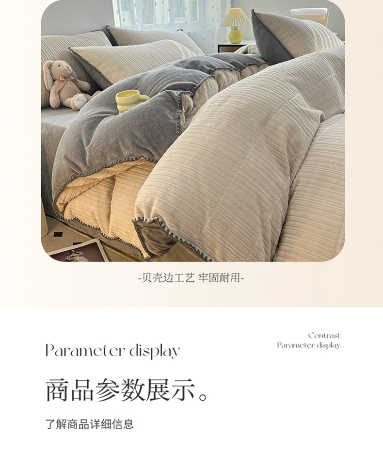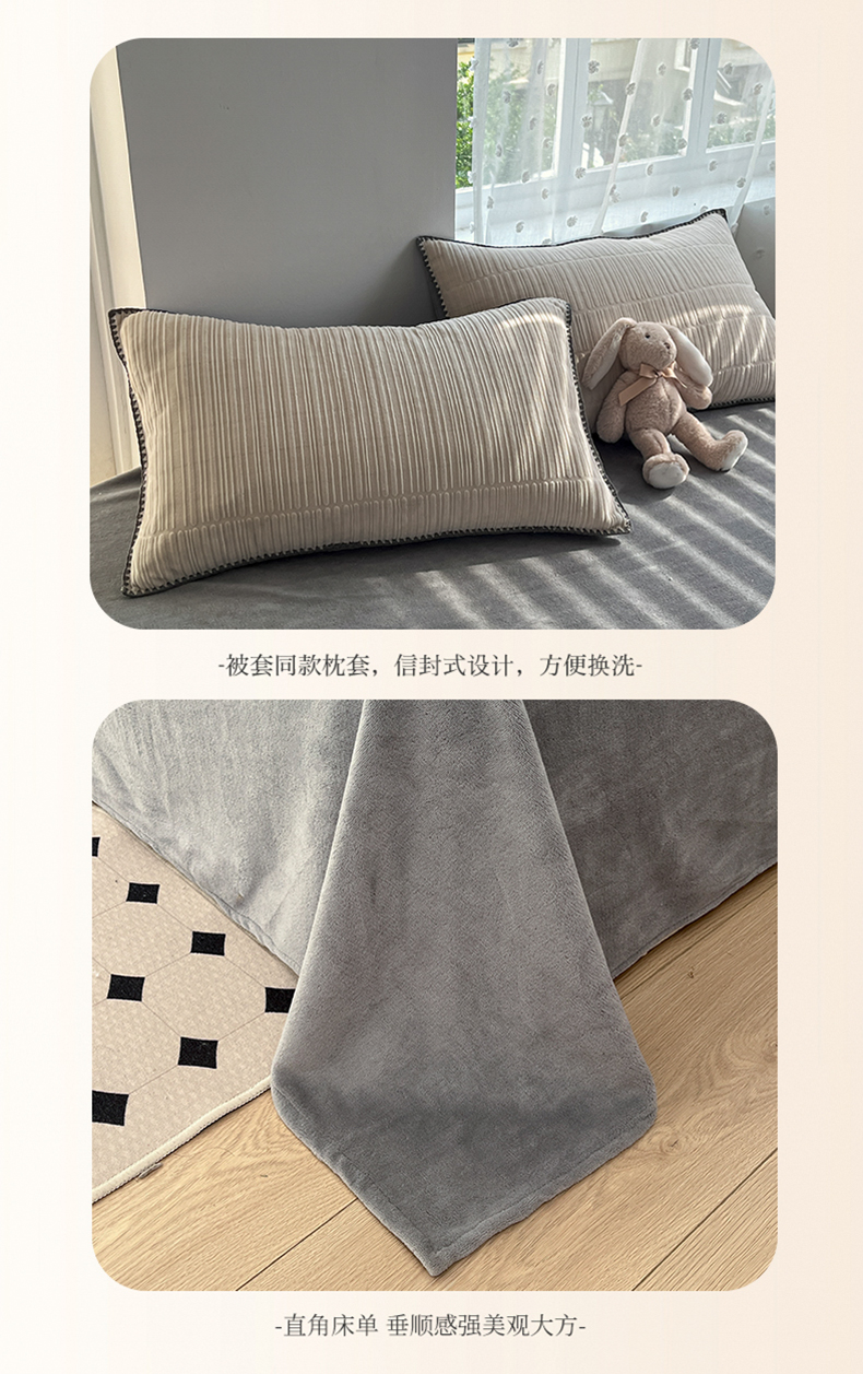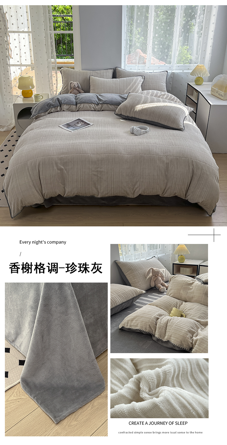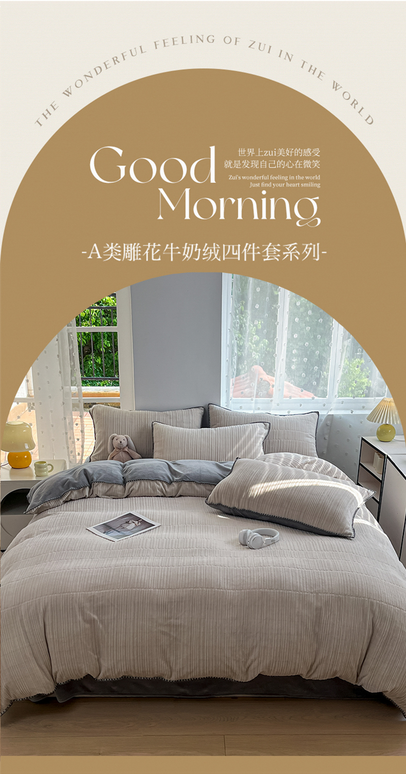 当前位置: 91家纺网 > 商品网购 > 床品套件 > 四件套 > 牛奶绒四件套 > 晚依家纺 2024新款230g纯色立体雕花牛奶绒四件套贝壳边加厚保暖定制定做 香榭格调-珍珠灰
