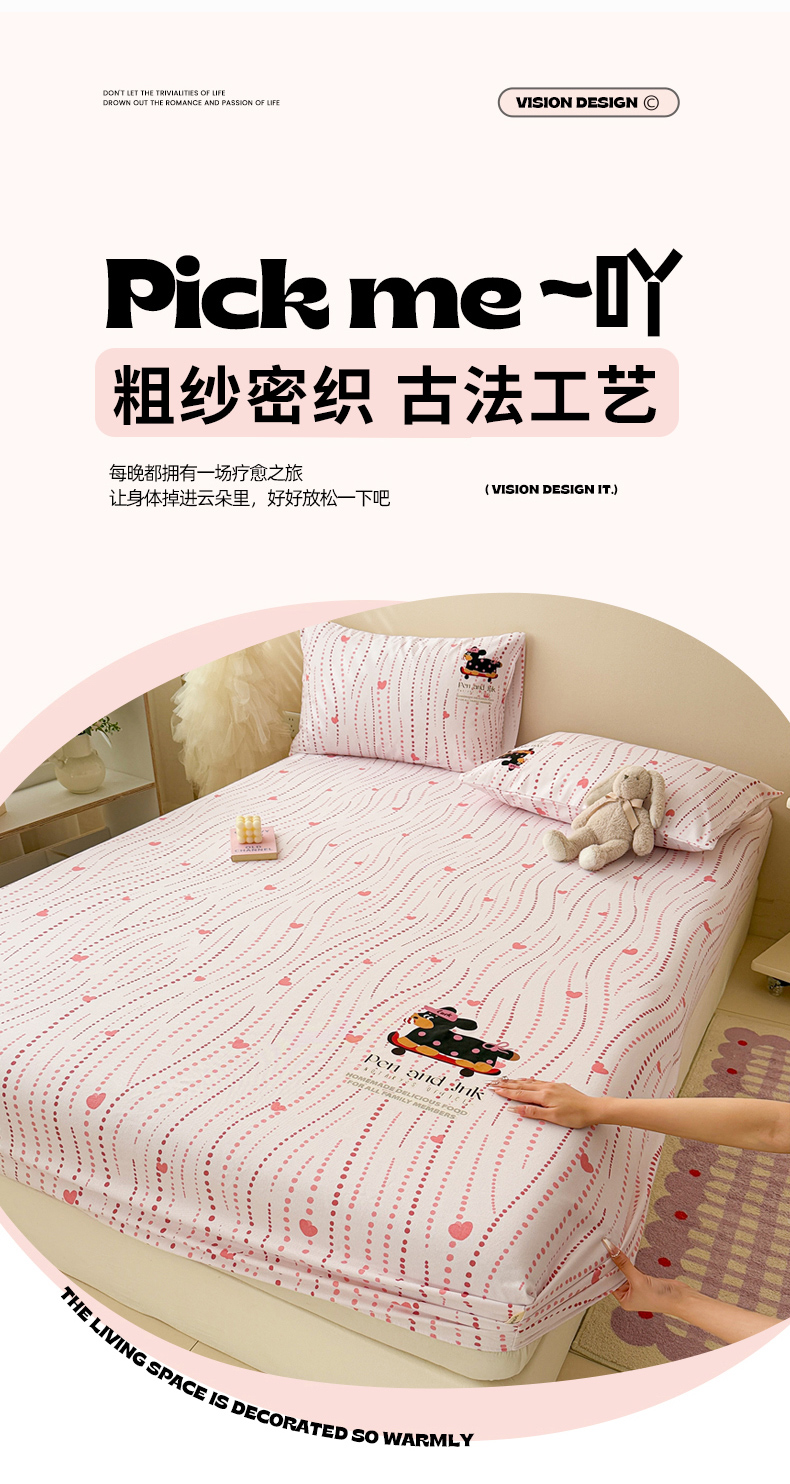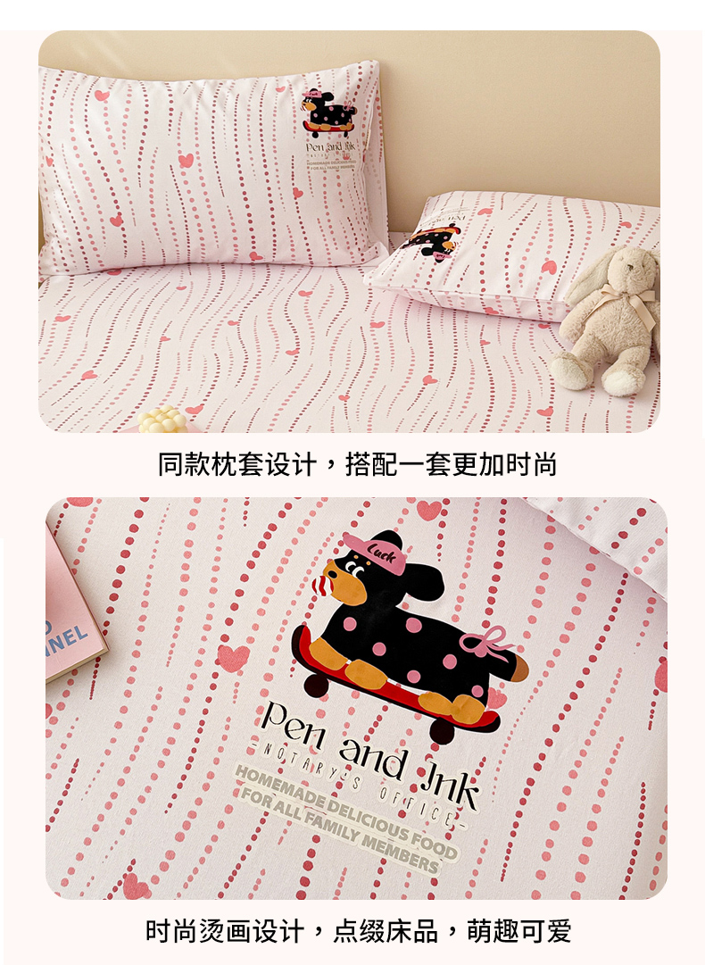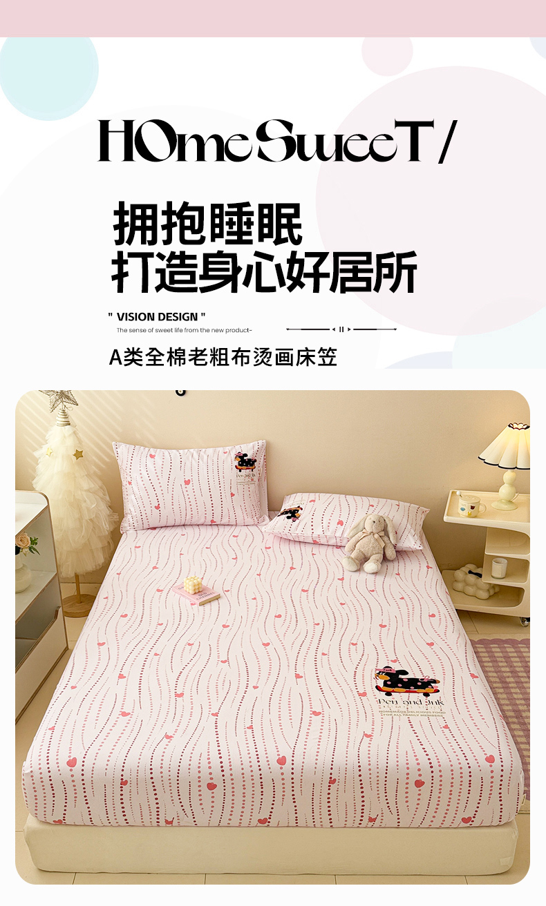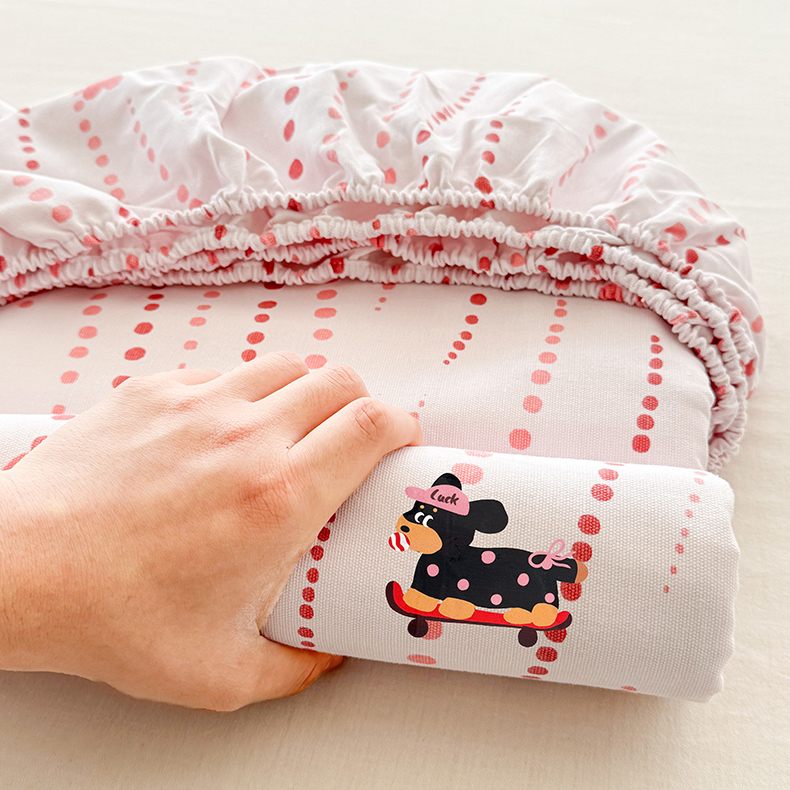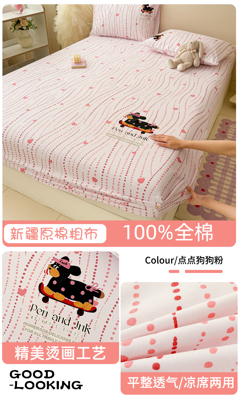 • 91家纺网 家纺一手货源 找家纺 沐辰 2025春夏新款A类全棉纯棉老粗布烫画单品床笠 床笠单件 点点狗狗-粉