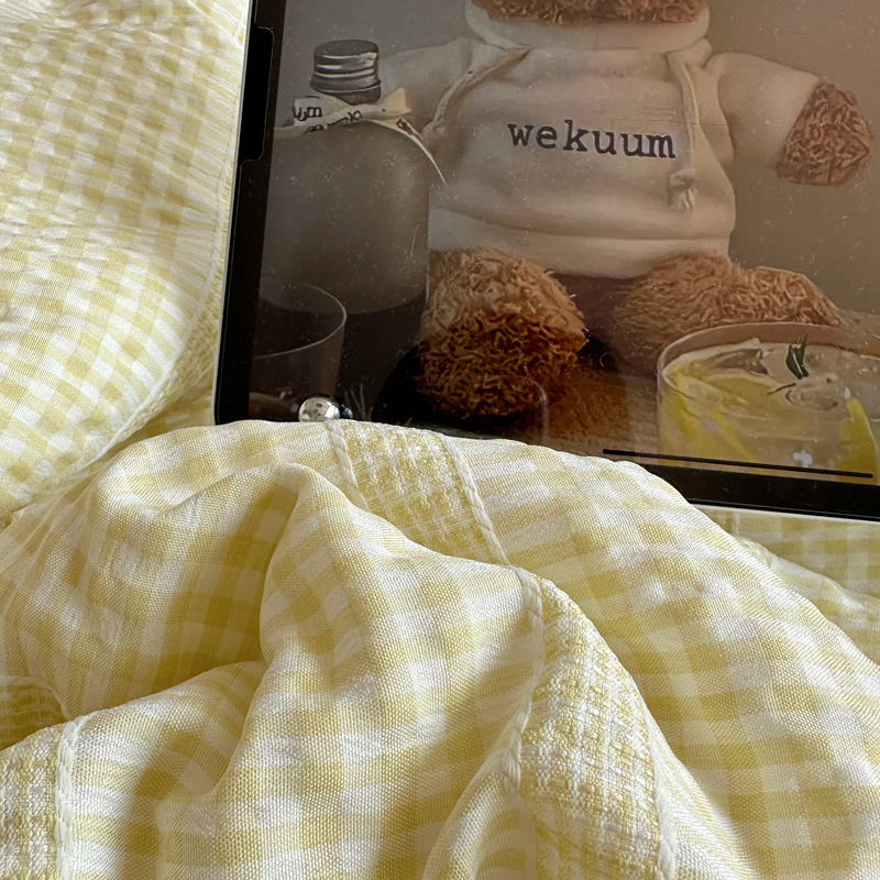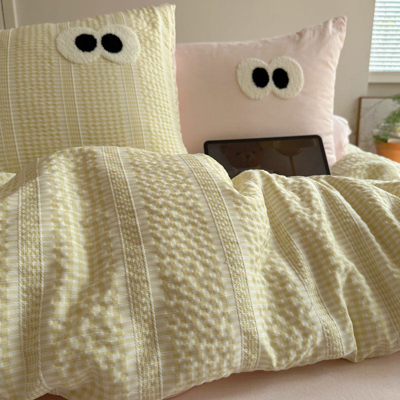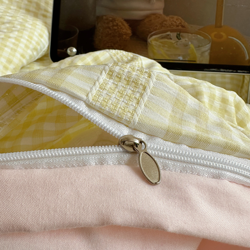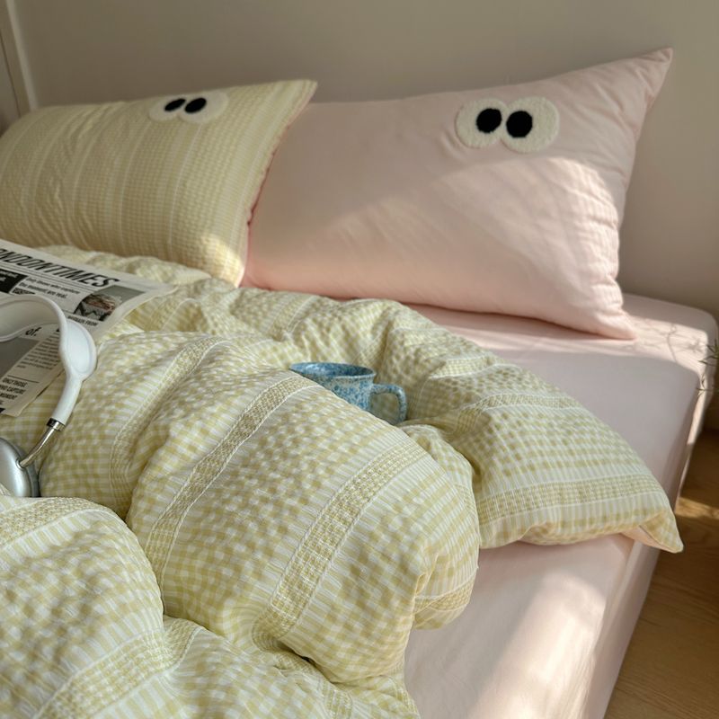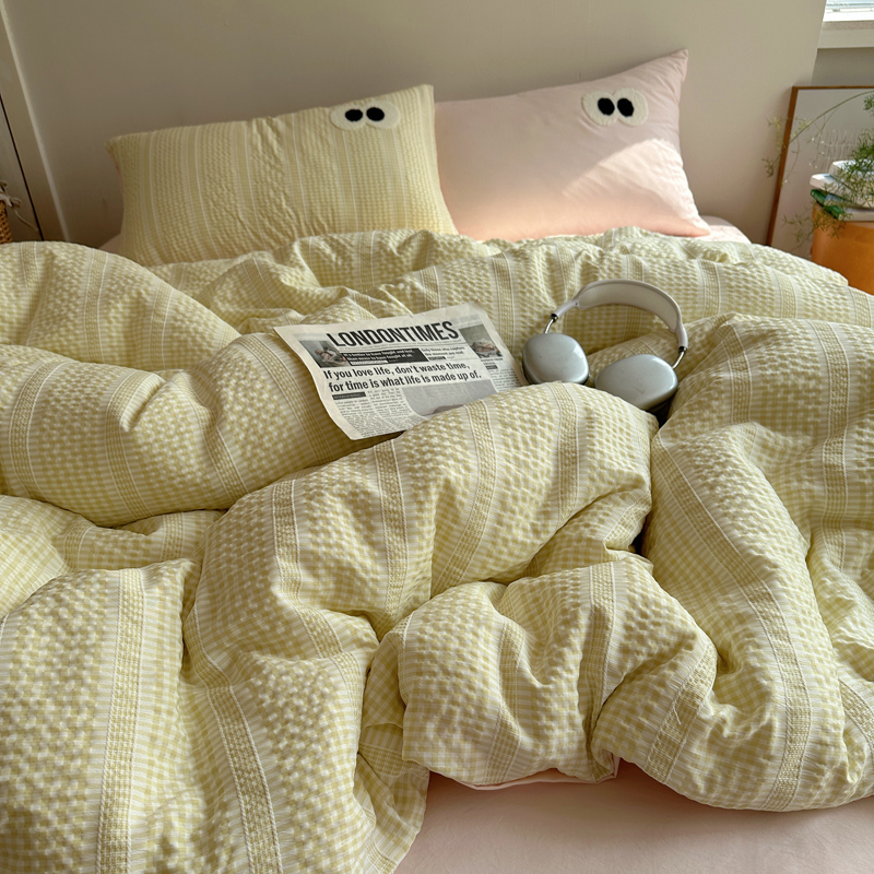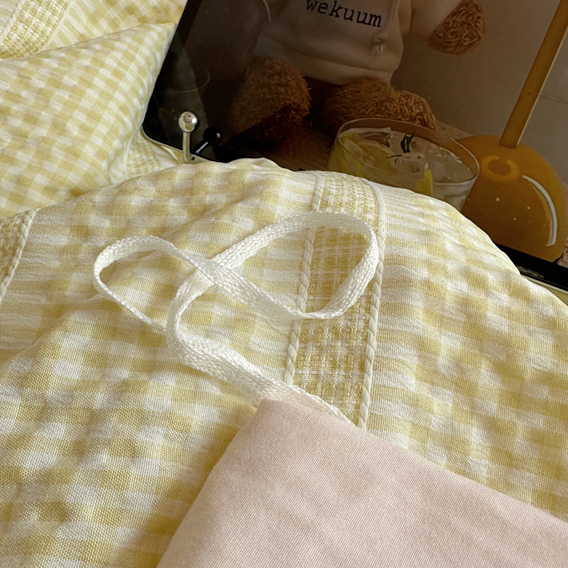 商品名称:顾里家纺 2025新款大眼混搭色织水洗棉毛巾绣套件 黄粉格