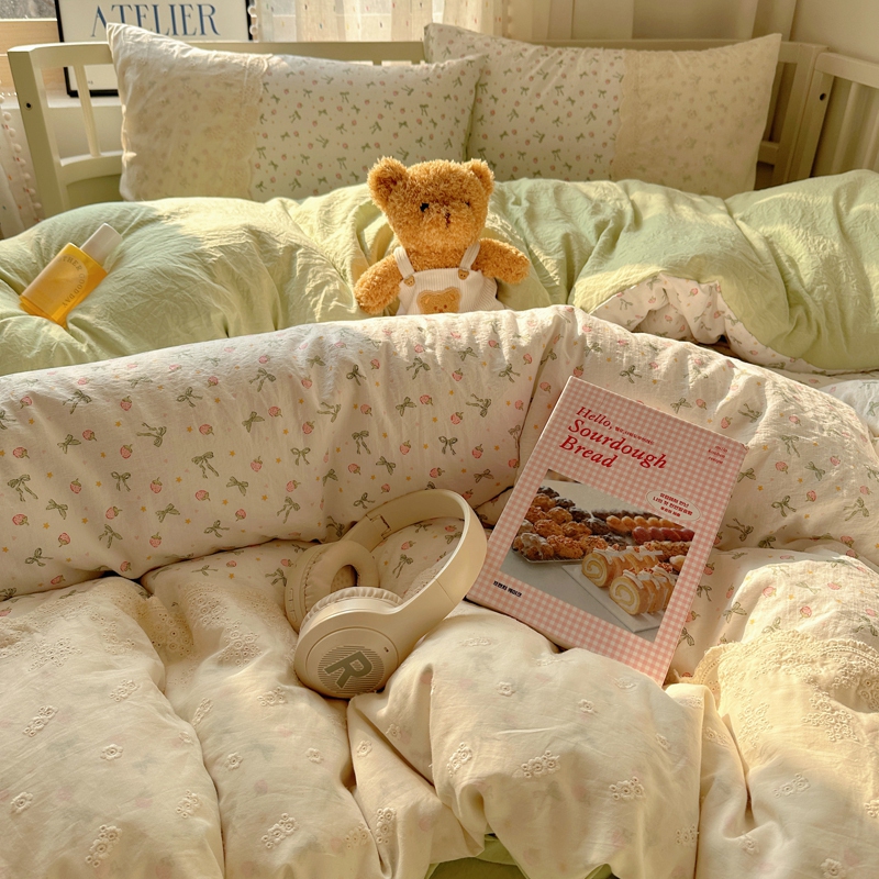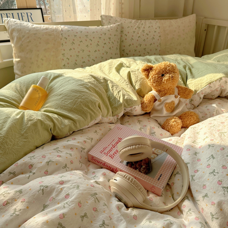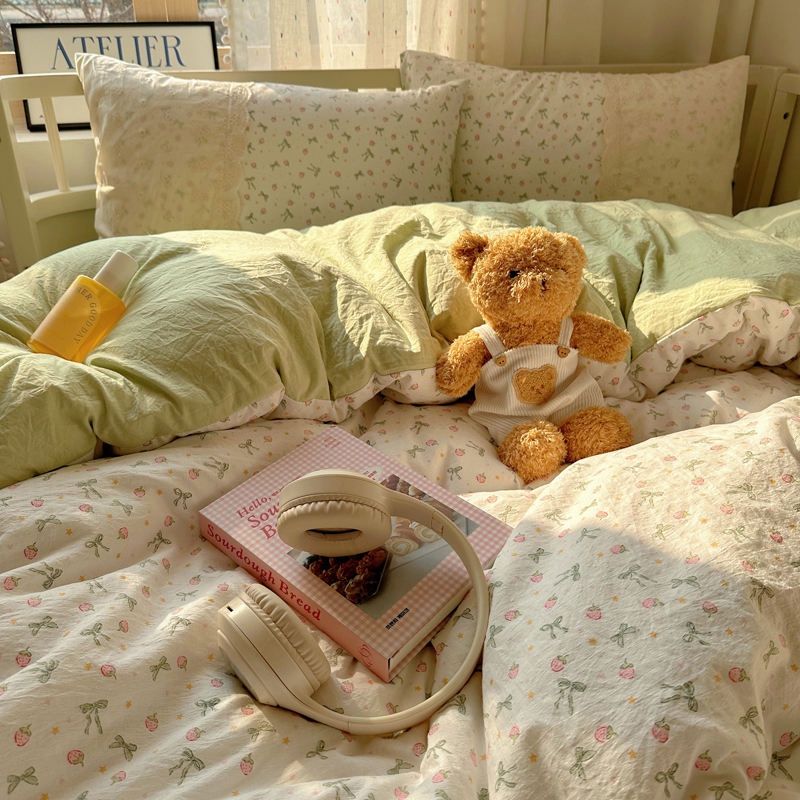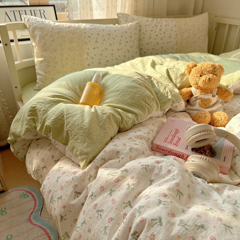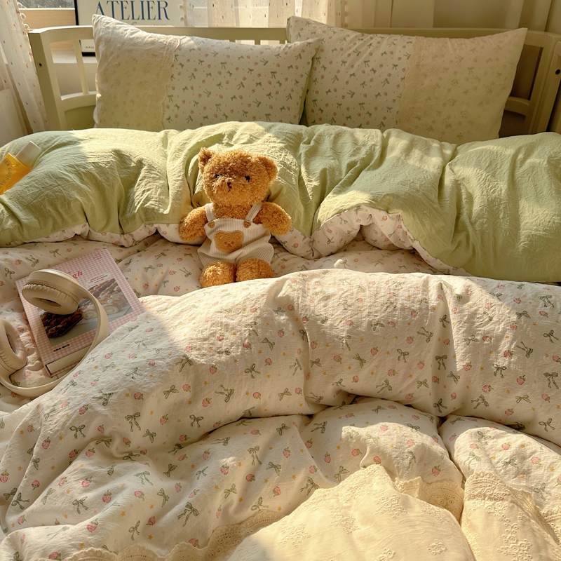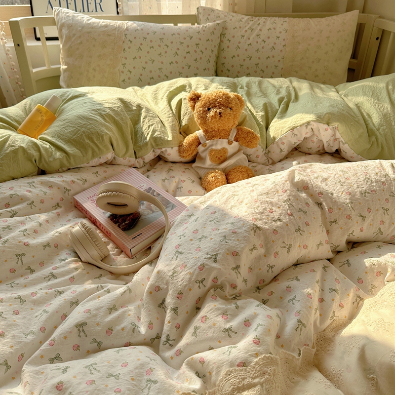 商品名称:顾里2025新款蕾丝花边云感双层纱套件四件套 草莓蝴蝶结