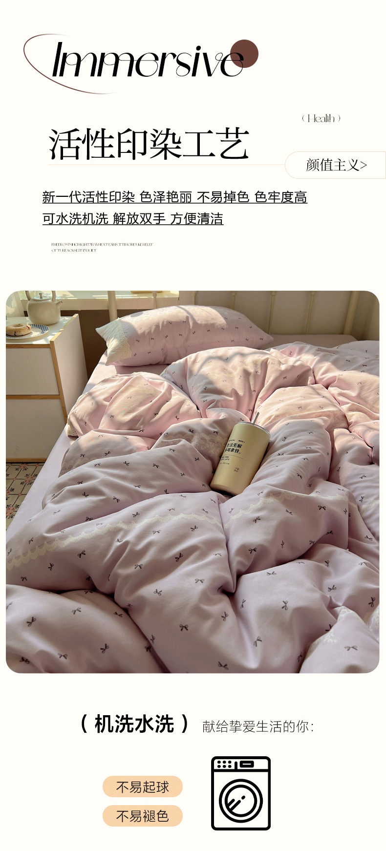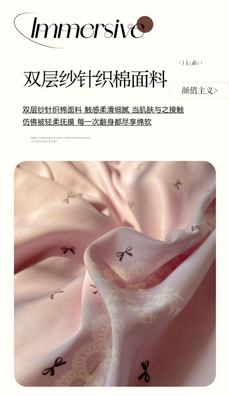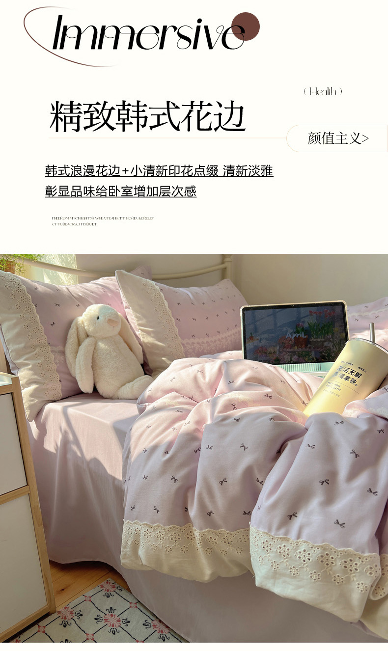 (总)慕澄家纺 2026新款双层纱针织棉蕾丝花边四件套,丛林小鹿,粉蓝油画,粉色花园,格子樱桃,果实,花环小兔,咖系小花,蕾丝蝴蝶结,清新花香,温婉,小鱼吐泡泡,小圆点,小紫花,紫藤花语,字母文学