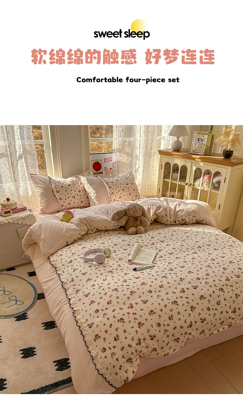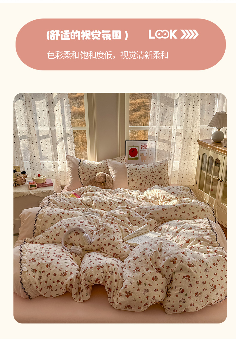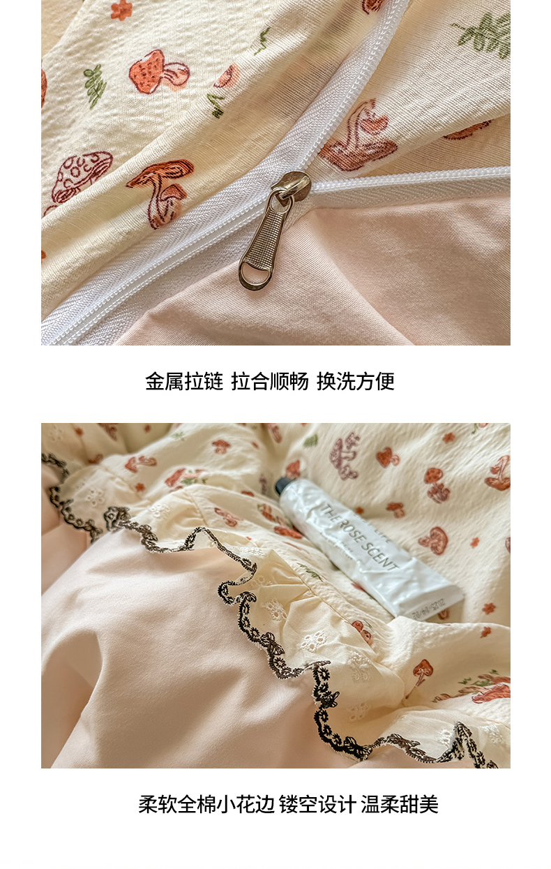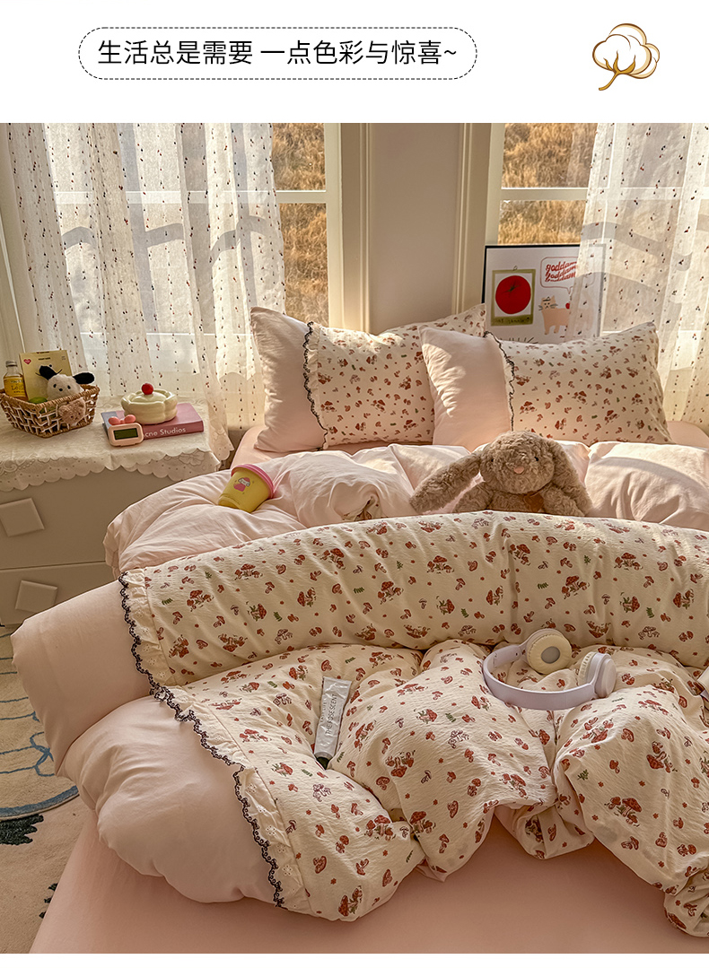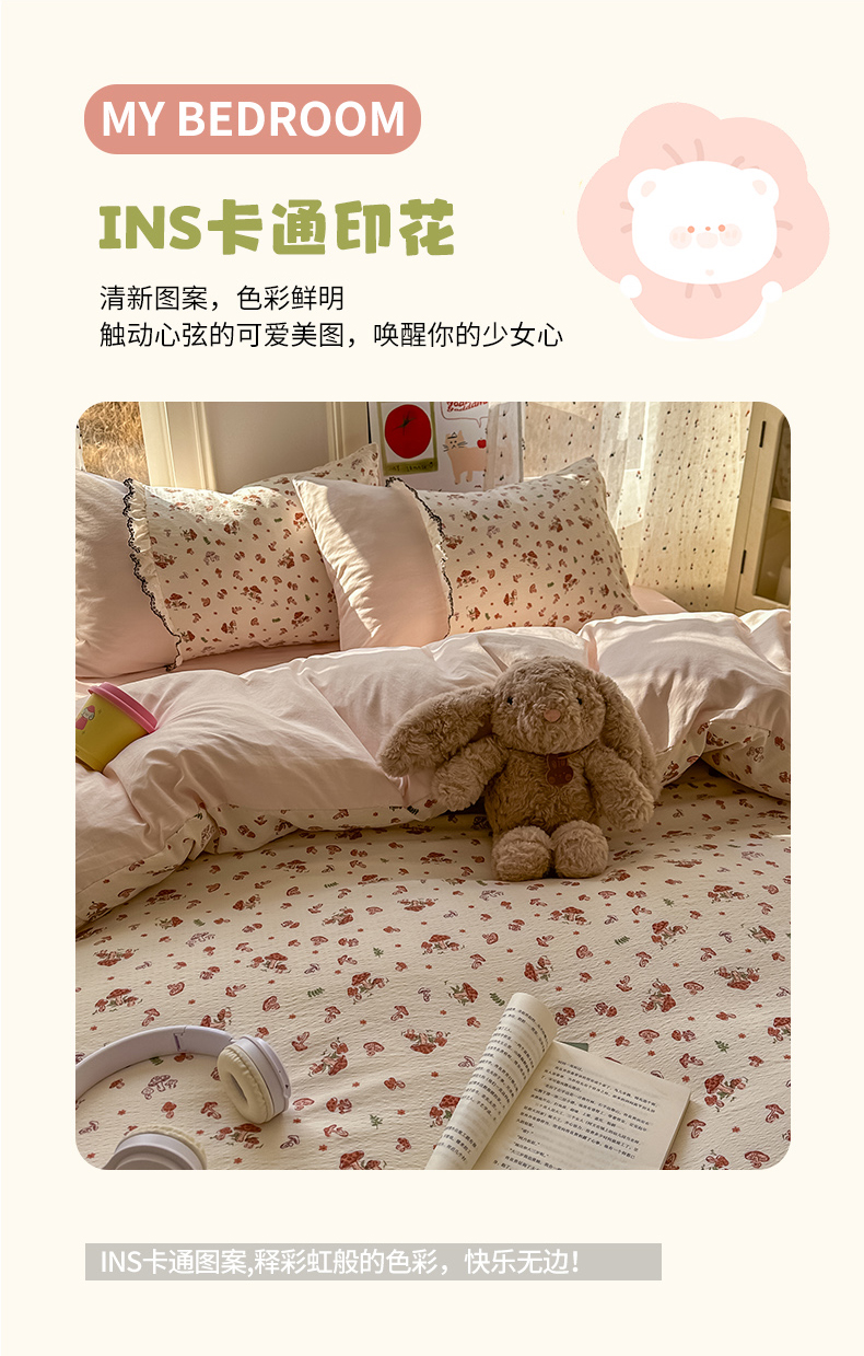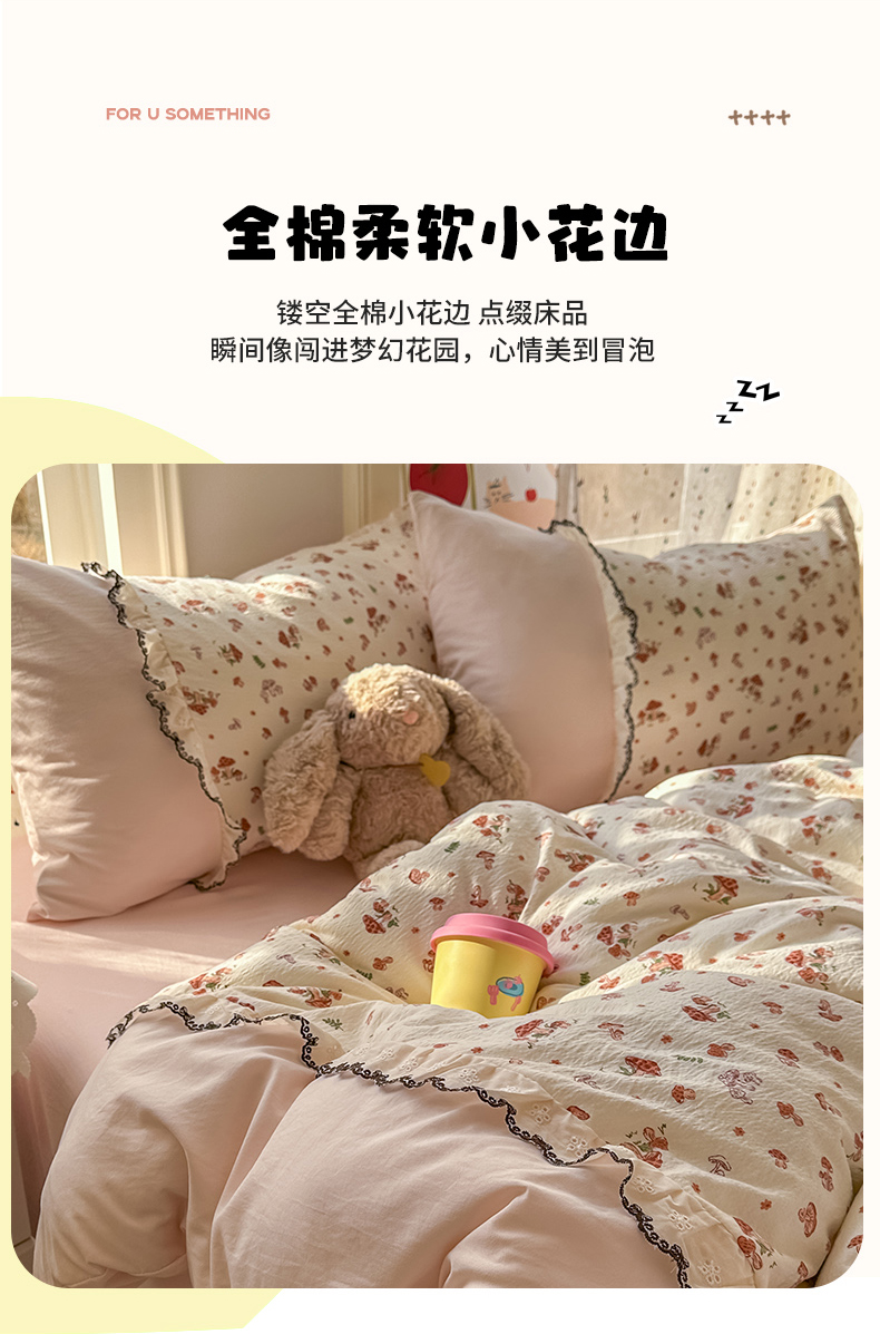 当前位置: 91家纺网 > 商品网购 > 床品套件 > 四件套 > 水洗棉四件套 > 贝凯瑞 2026新款小花边水洗棉绣花ins小清新床单床裙床笠四件套 蘑菇园