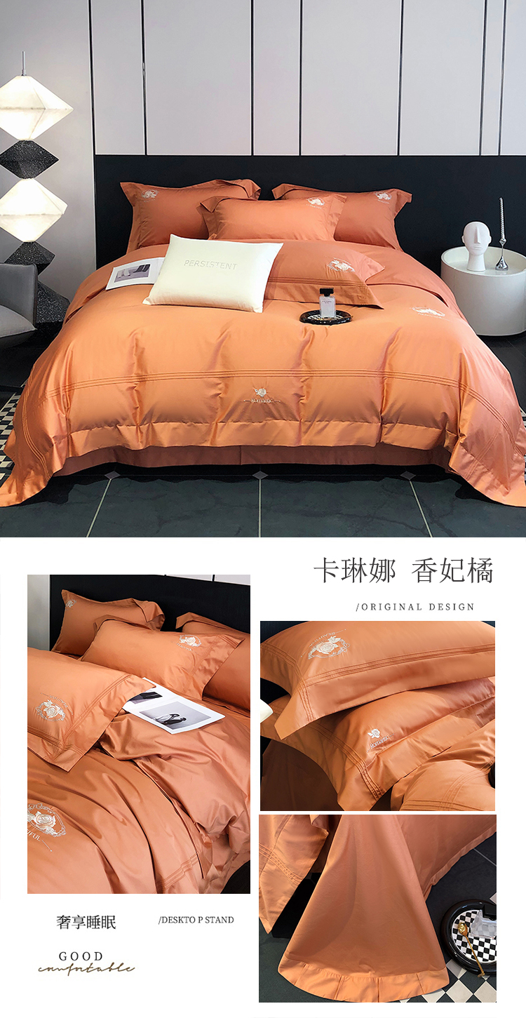 (总)诗黛尔 2025秋冬新款长绒棉刺绣香缇卡系列四件套,卡其色,落樱粉,南瓜橘,绅士灰,水晶兰,油果绿