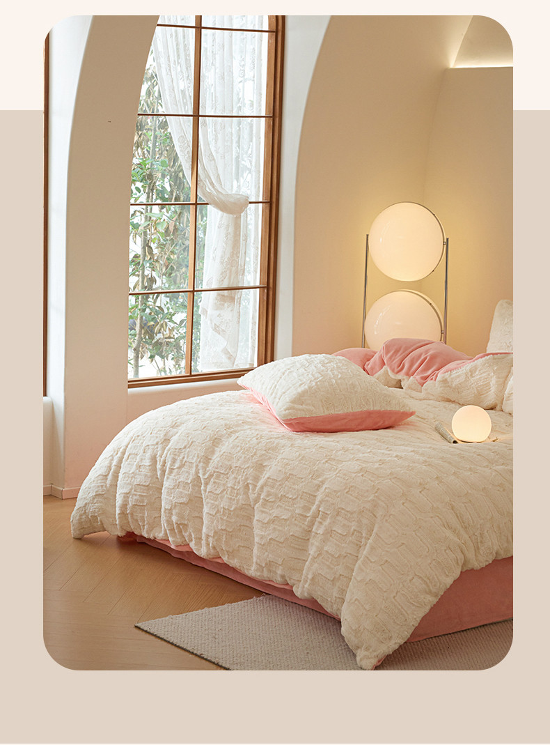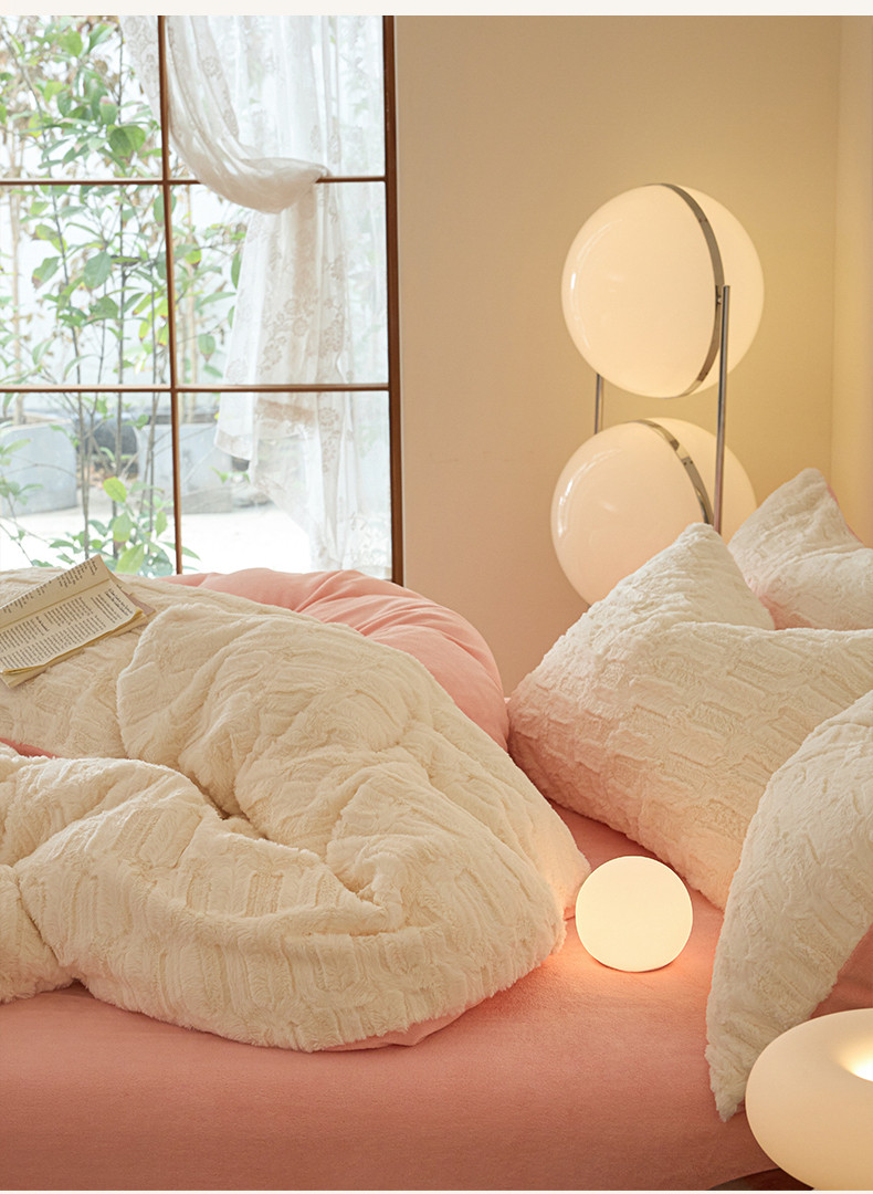 沐棉 2023新款秋冬加厚保暖兔毛绒牛奶绒四件套 波浪-米拼粉