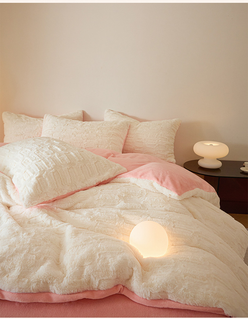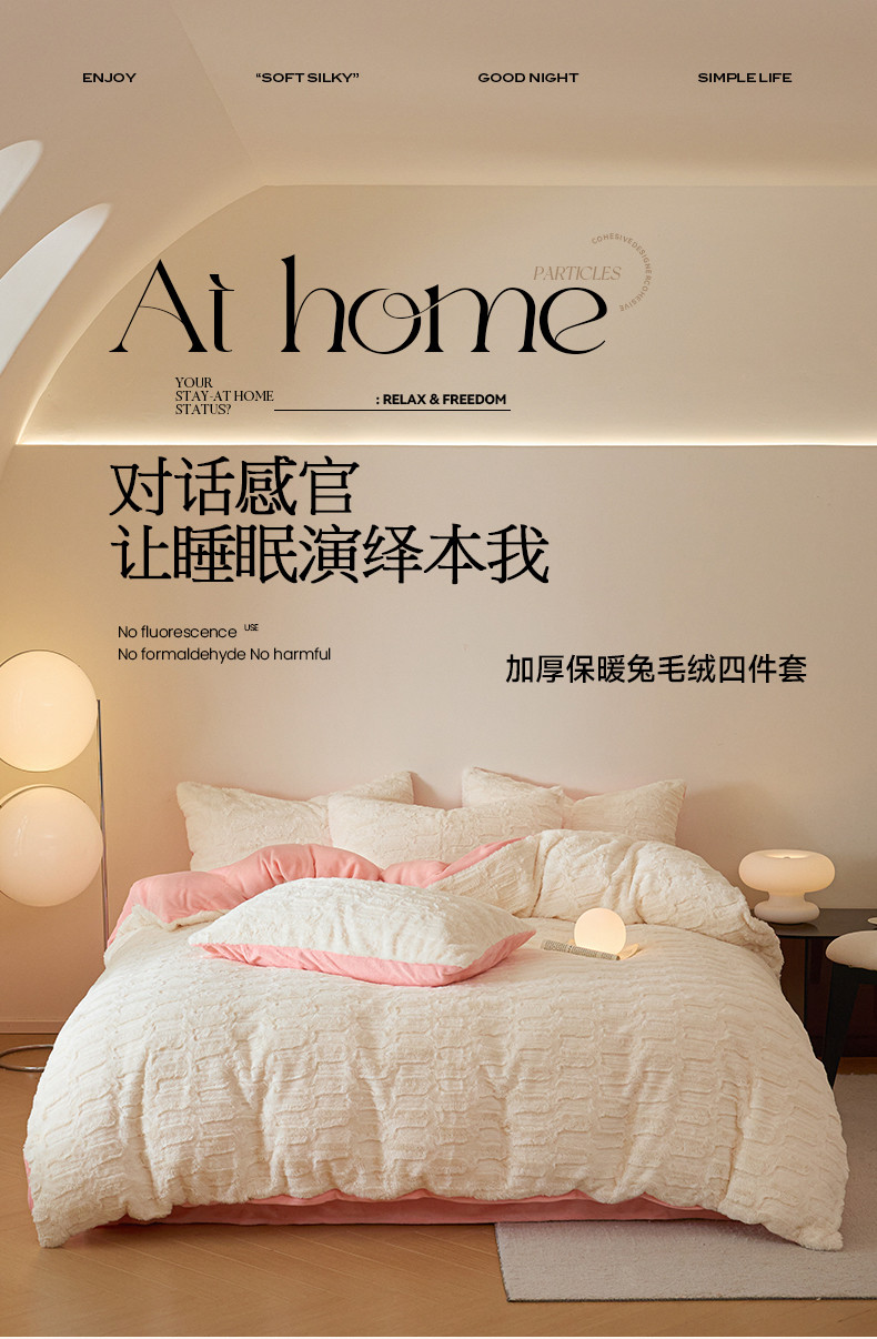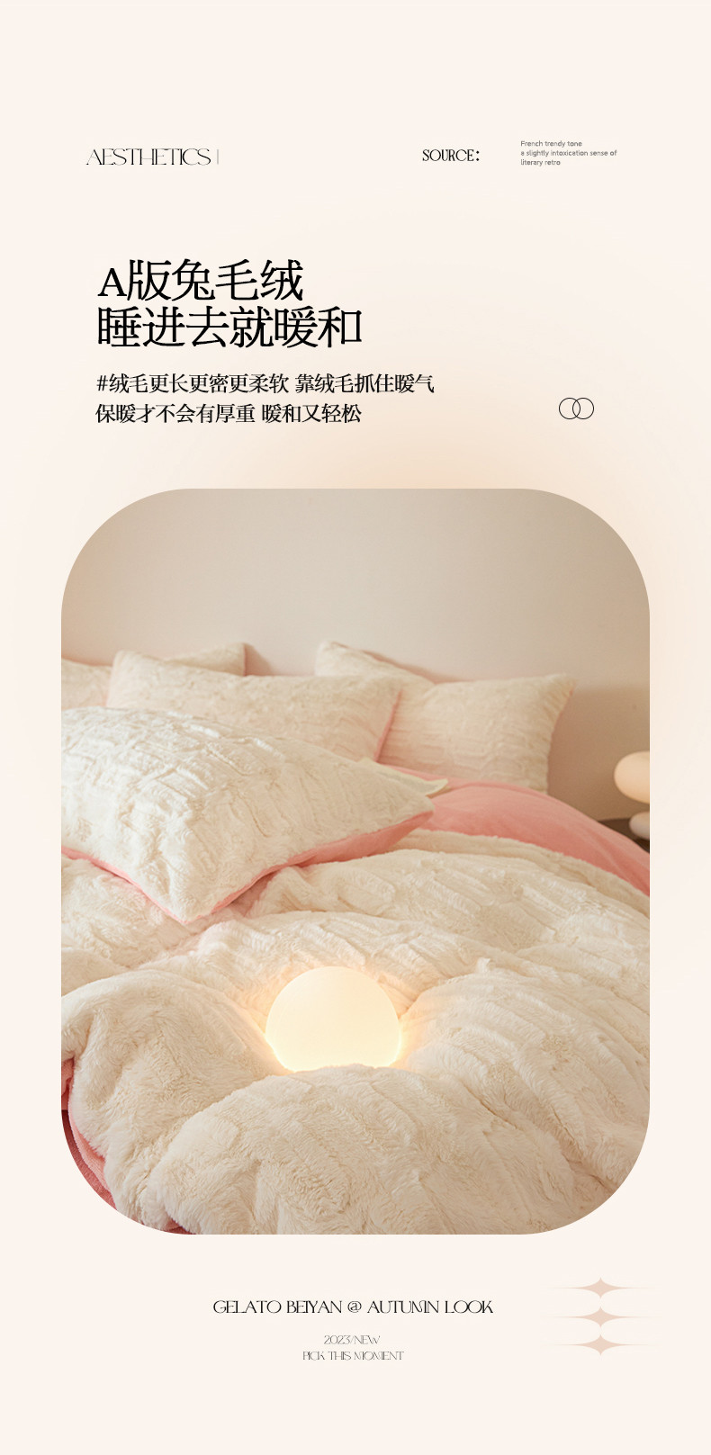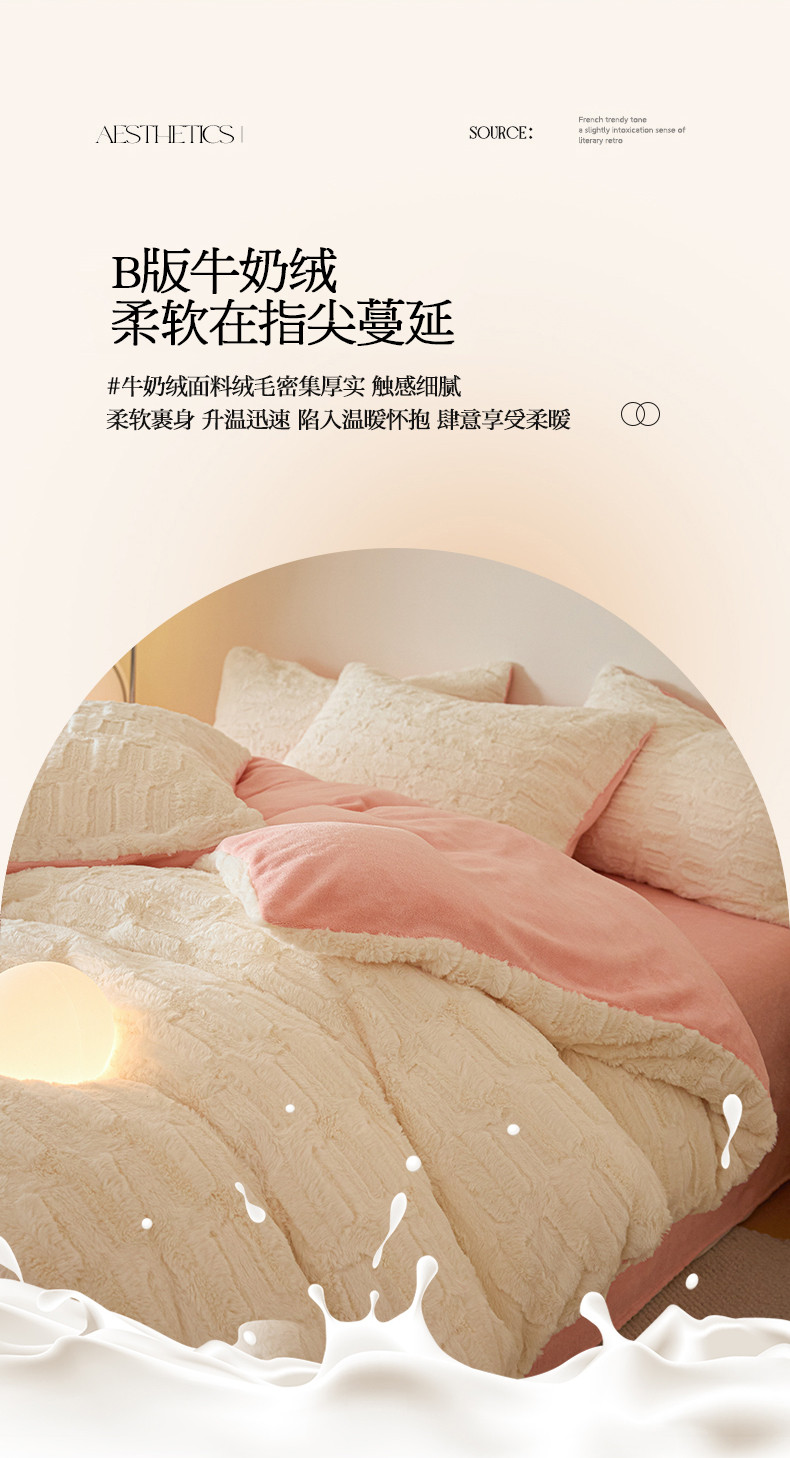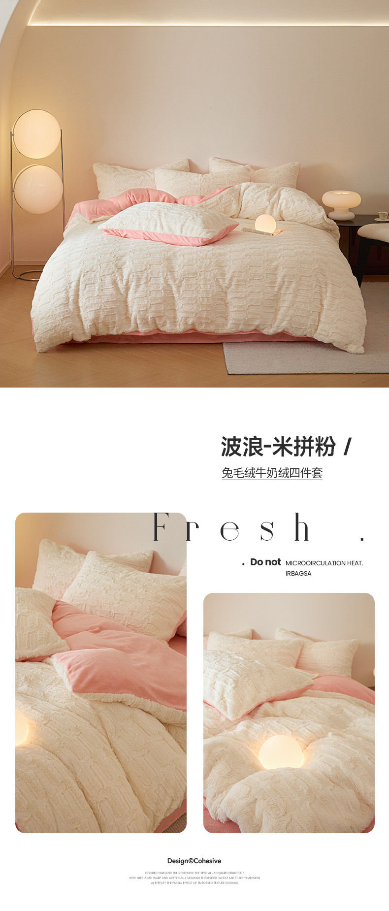 商品名称:沐棉 2023新款秋冬加厚保暖兔毛绒牛奶绒四件套 波浪-米拼粉