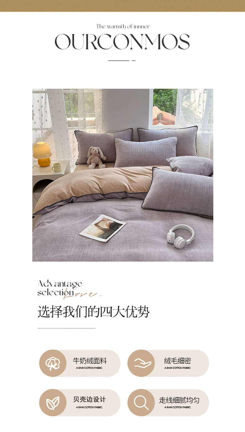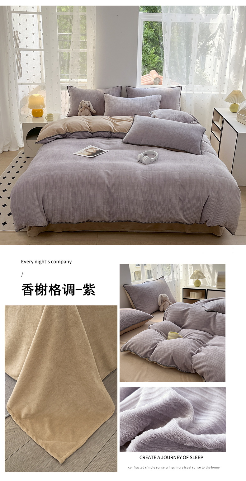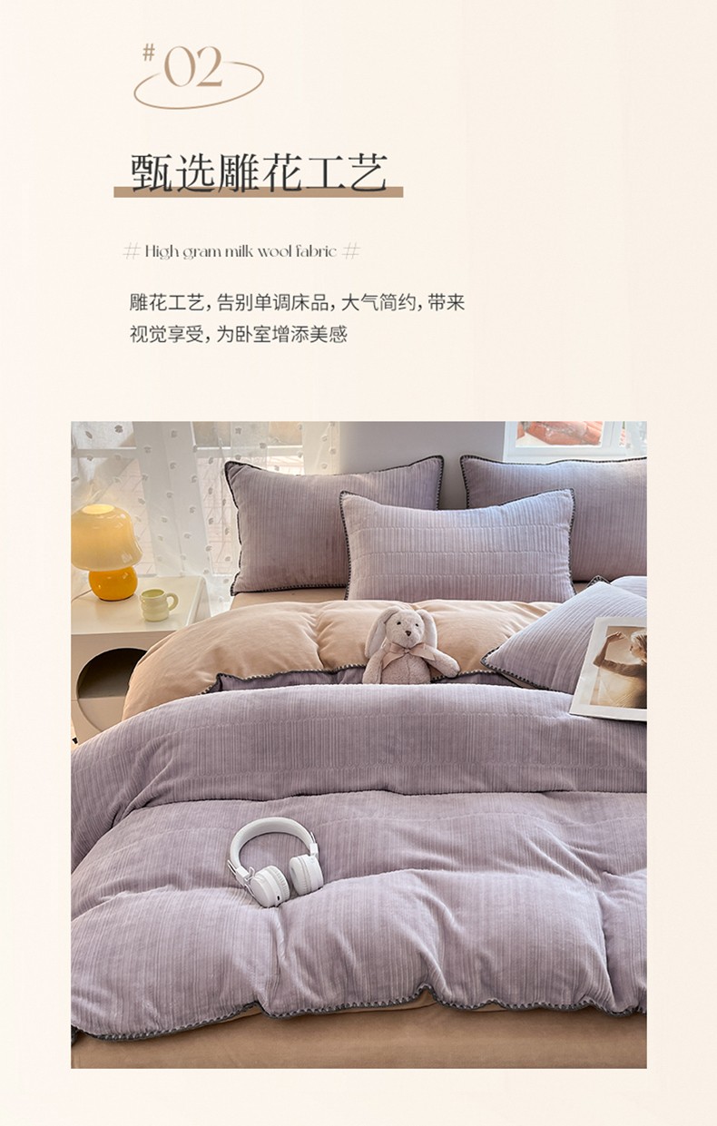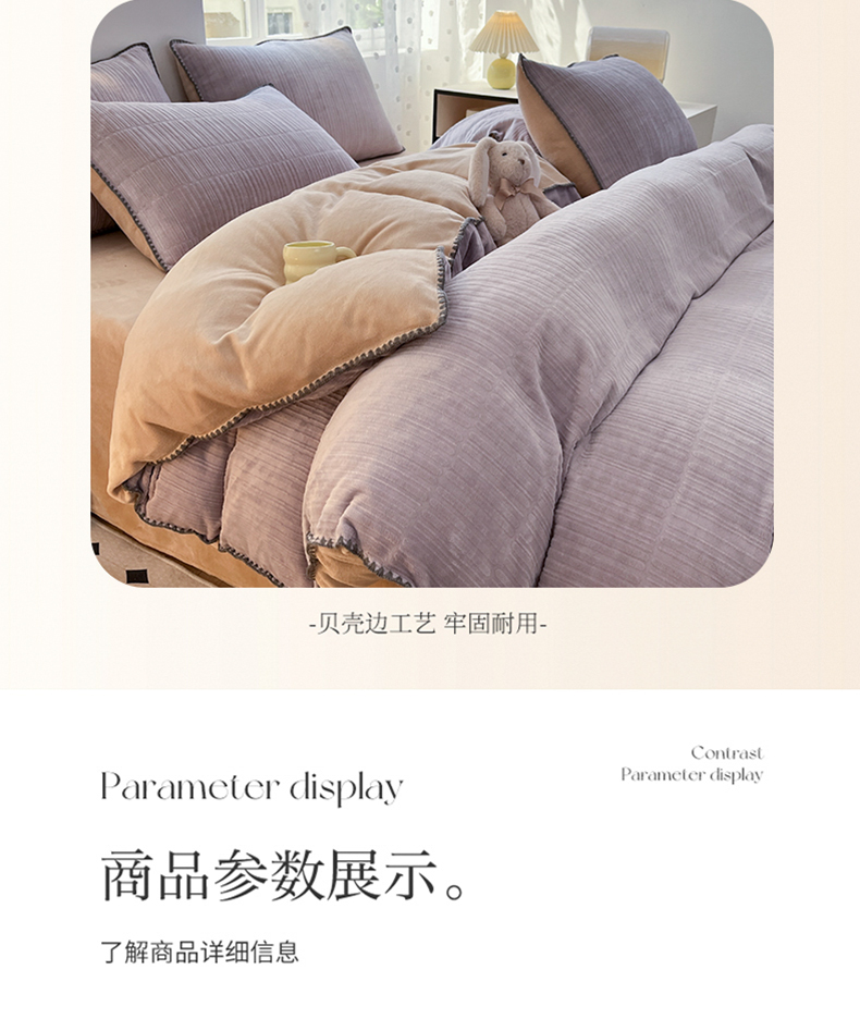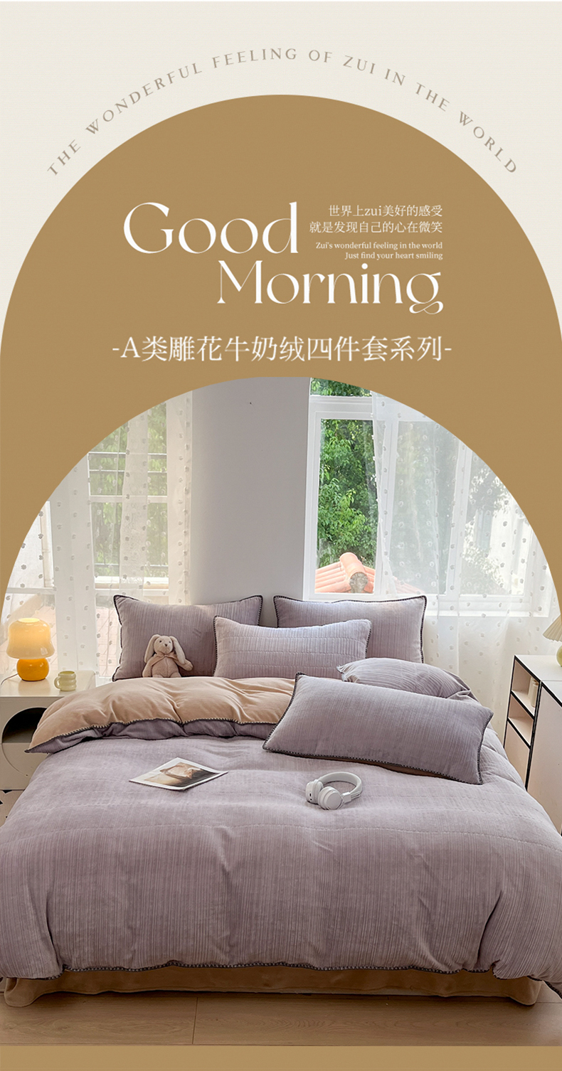 当前位置: 91家纺网 > 商品网购 > 床品套件 > 四件套 > 牛奶绒四件套 > 晚依家纺 2024新款230g纯色立体雕花牛奶绒四件套贝壳边加厚保暖定制定做 香榭格调-紫