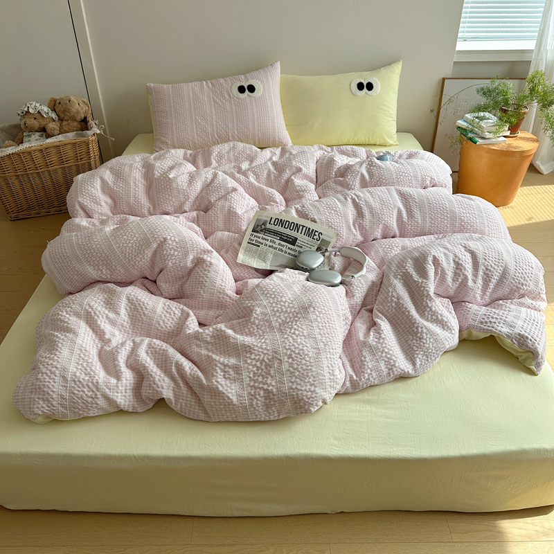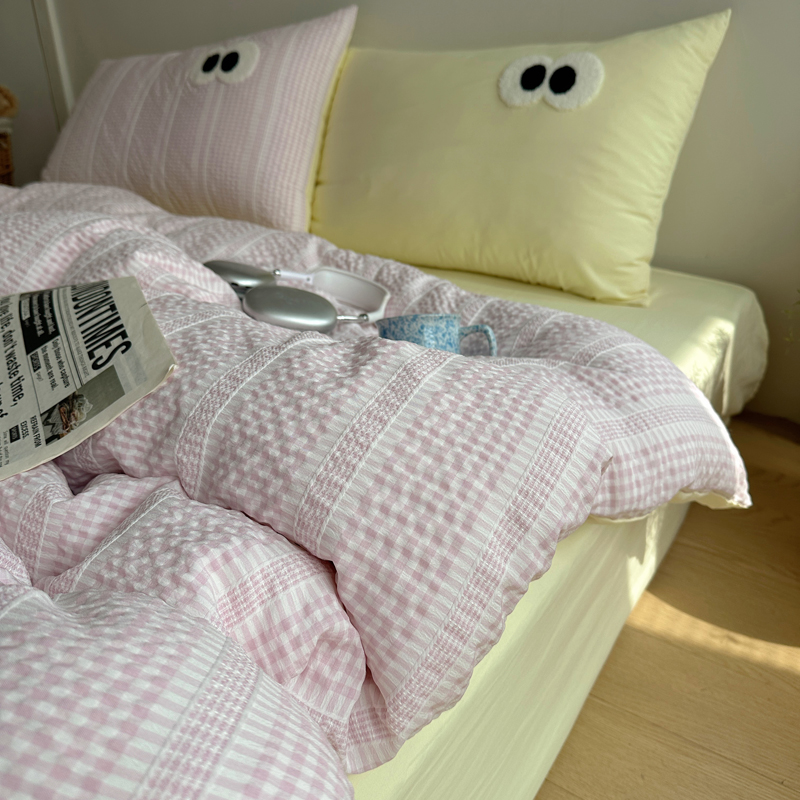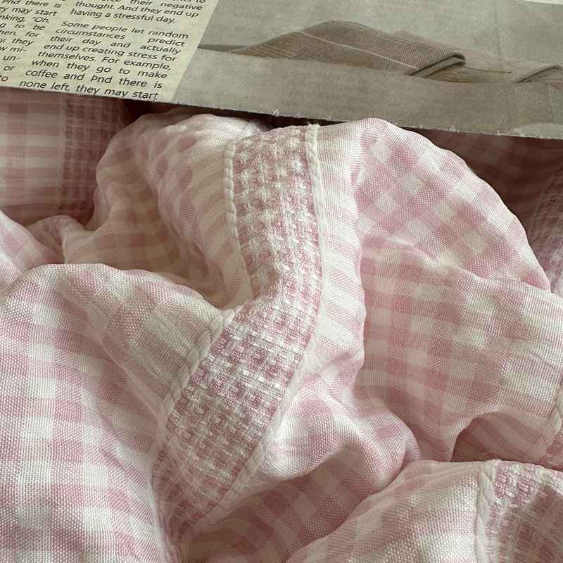 商品名称:顾里家纺 2025新款大眼混搭色织水洗棉毛巾绣套件 粉黄格