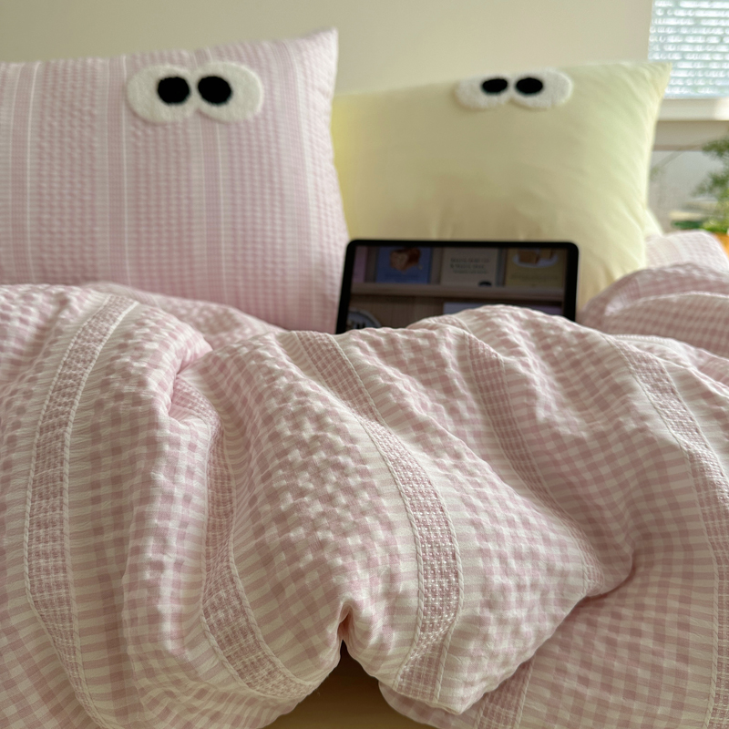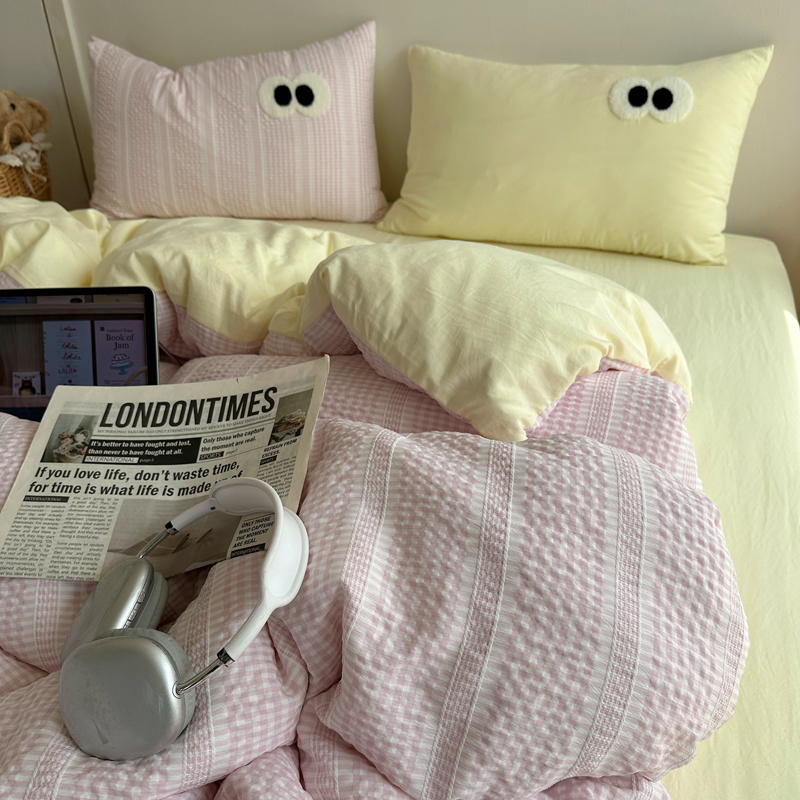 顾里家纺 2025新款大眼混搭色织水洗棉毛巾绣套件 粉黄格