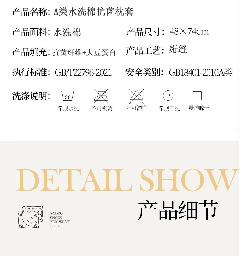 商品名称:安逸恋 2025新款A类水洗棉大豆夹棉枕套48*74cm出口跨境 米白