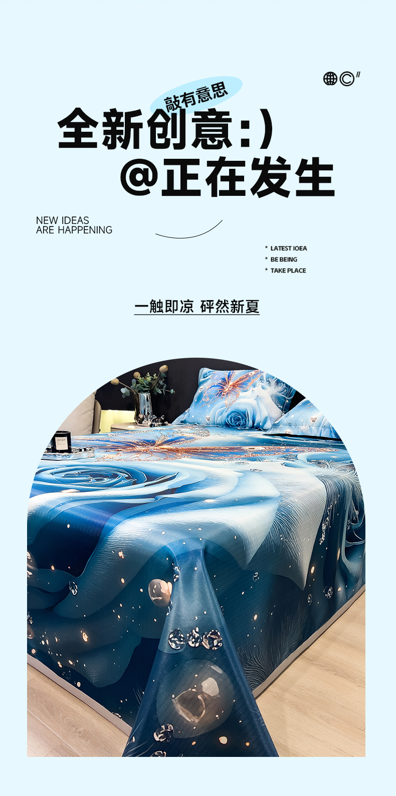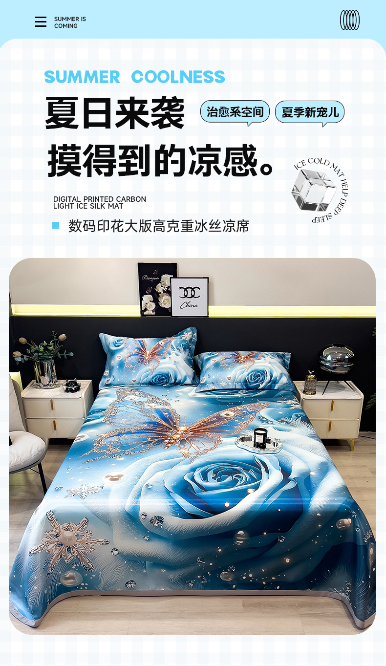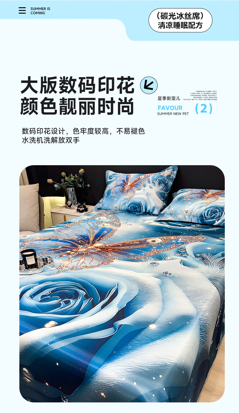 (总)许林家纺 2026爆款数码印花大版高克重冰丝凉席,夏木,花楹,绿野晴风,曼陀罗,牡丹,浅朵,四季花,星空幻想,孔雀