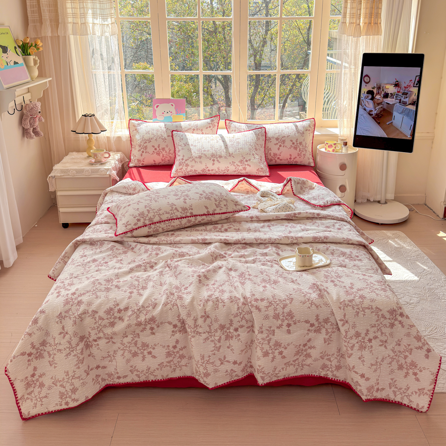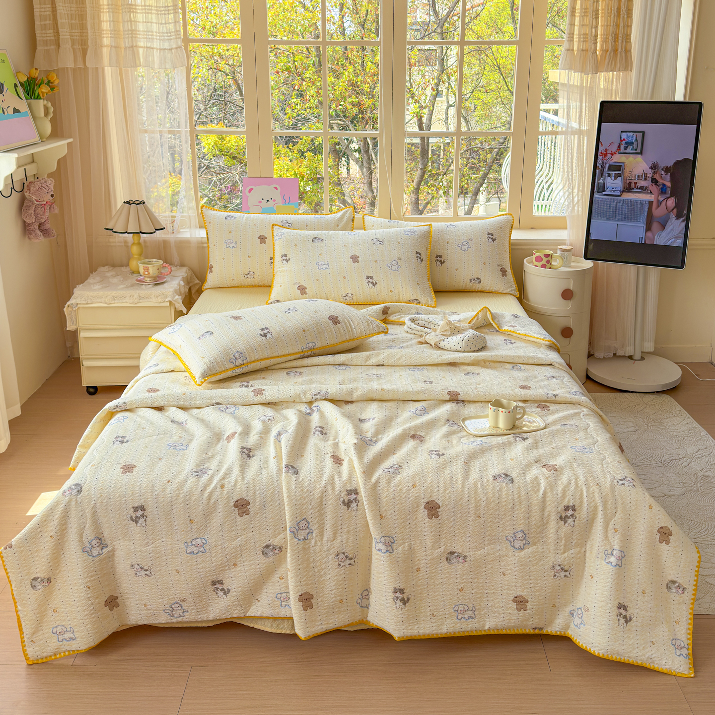 (总)仟网汇 2026新款贝壳边泡芙纱三角针夏被四件套,滑板狗,丽莎,奶油小狗,柿柿如意,甜心小兔,夏被叠拍