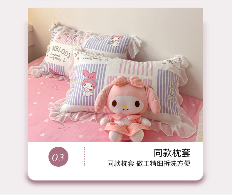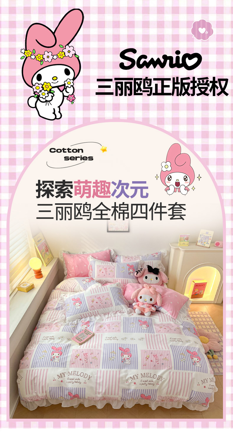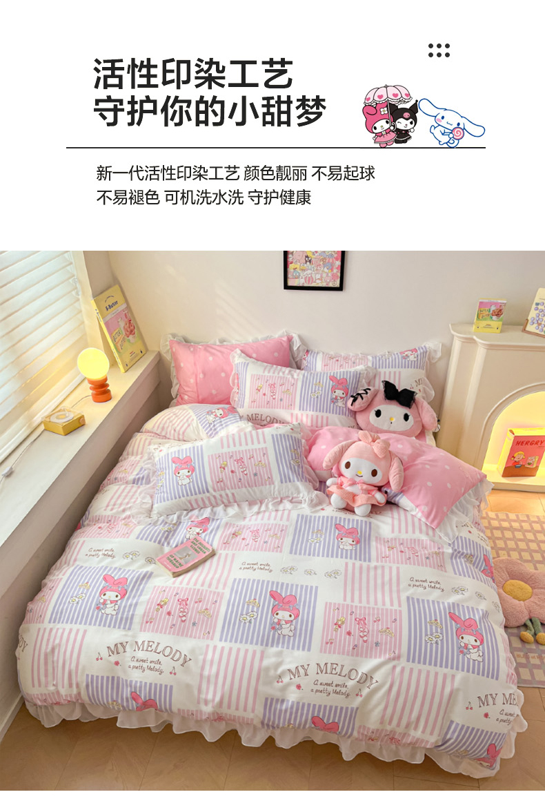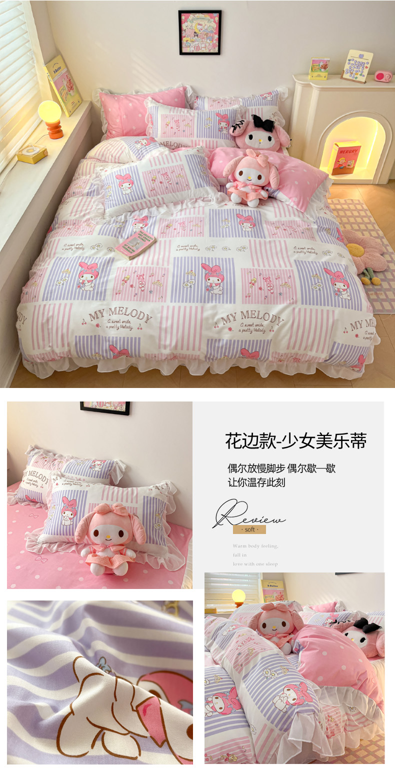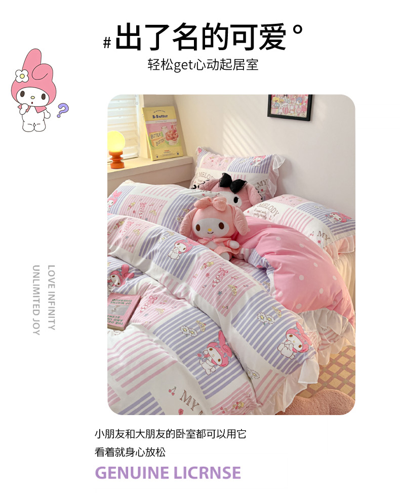 当前位置: 91家纺网 > 商品网购 > 床品套件 > 四件套 > 全棉普通四件套 > 暮思家居 2024新款正版授权三丽鸥雪纺纱花边款系列全棉四件套 花边款-少女美乐蒂