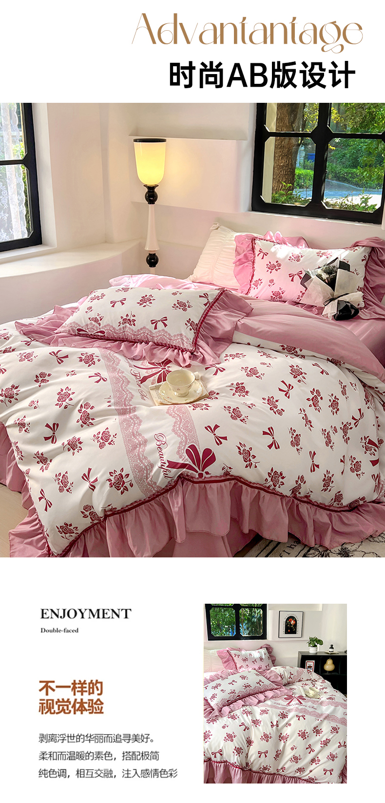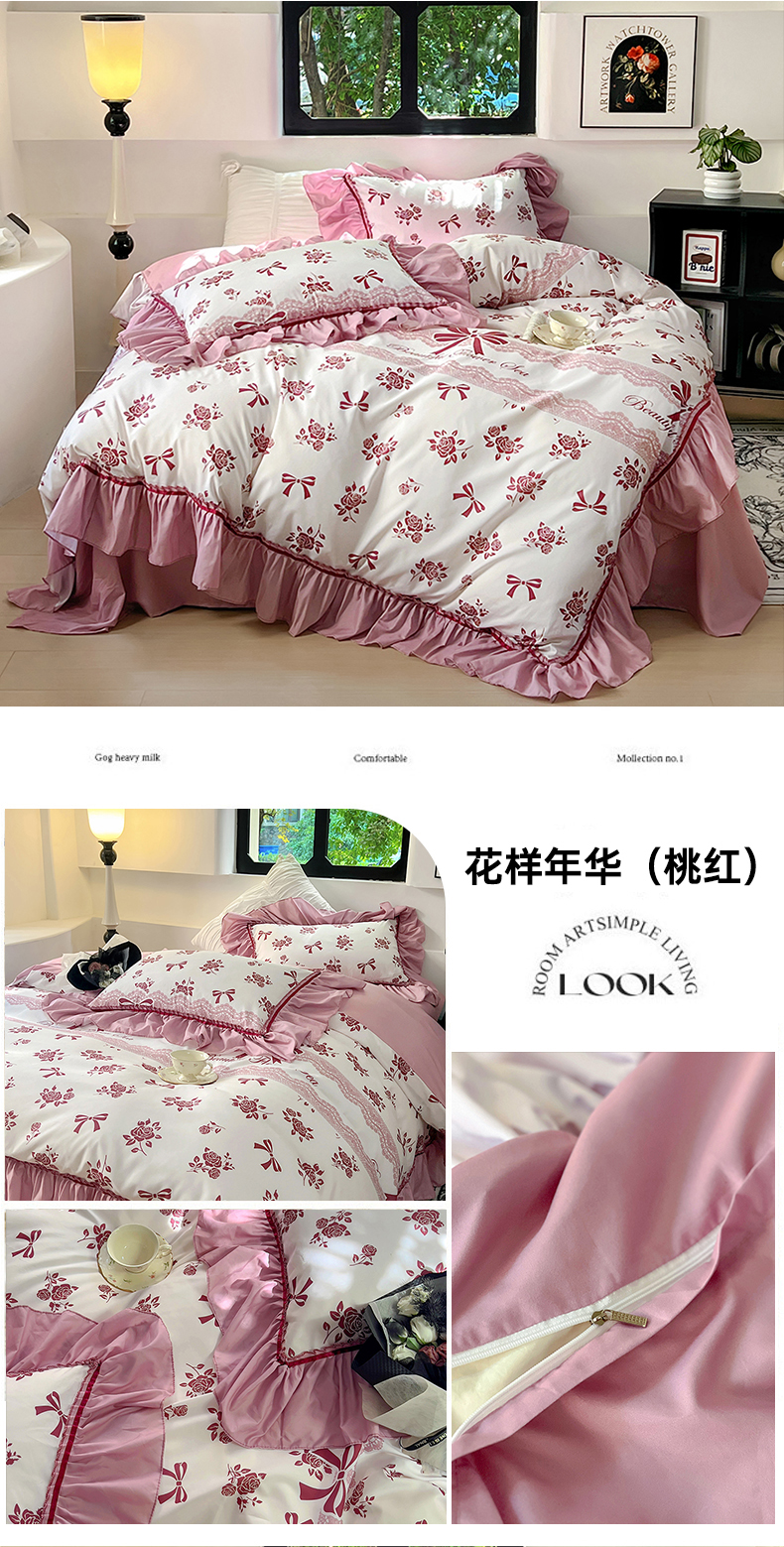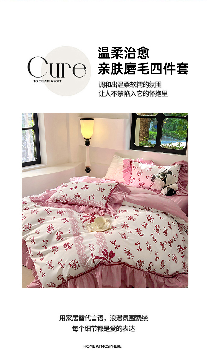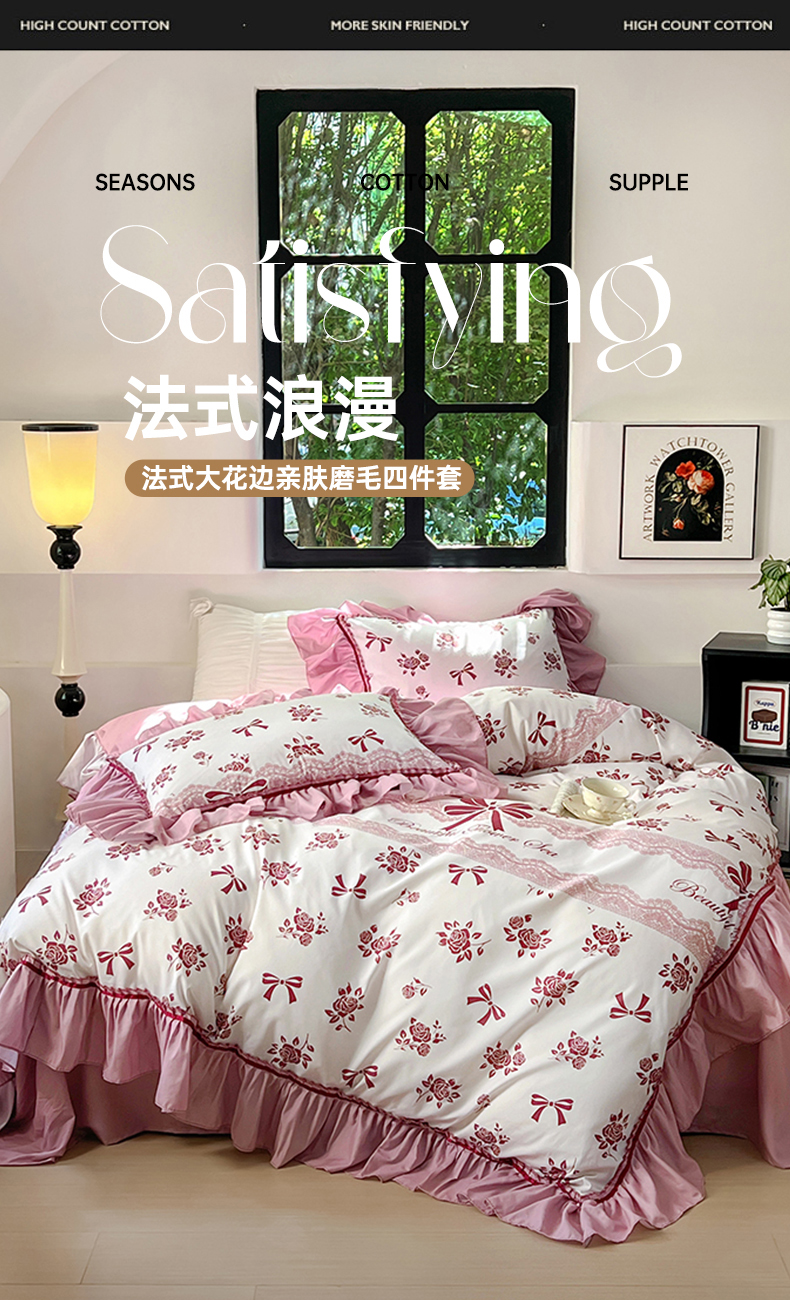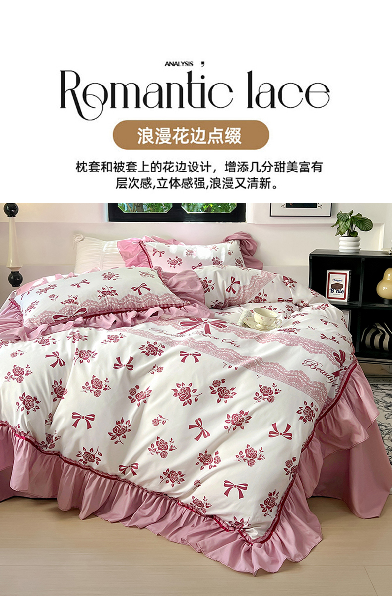 商品名称:春光里 2024新款法式大花边亲肤磨毛四件套 花样年华(桃红)