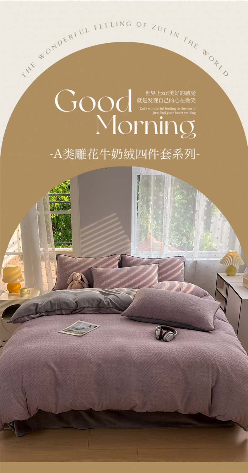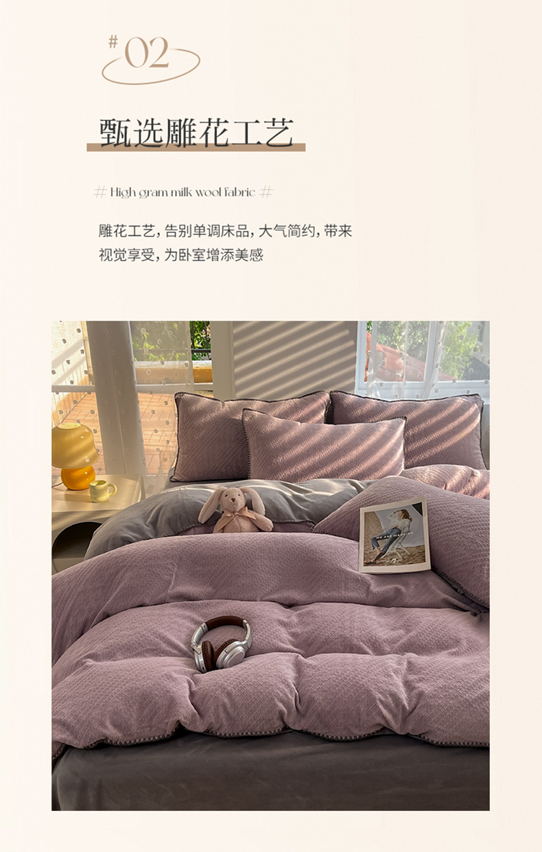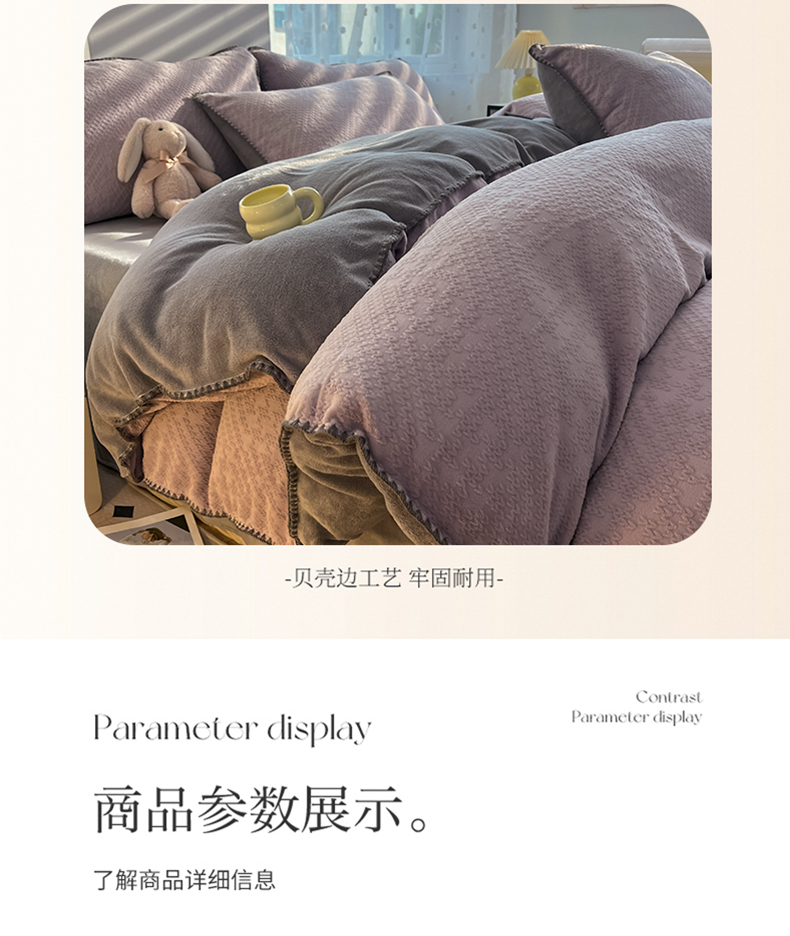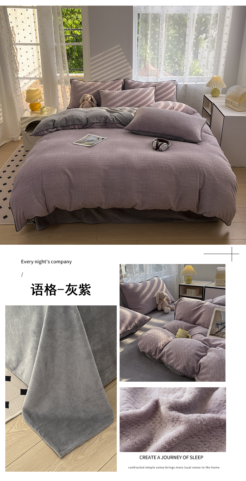 当前位置: 91家纺网 > 商品网购 > 床品套件 > 四件套 > 牛奶绒四件套 > 晚依家纺 2024新款230g纯色立体雕花牛奶绒四件套贝壳边加厚保暖定制定做 语格-灰紫