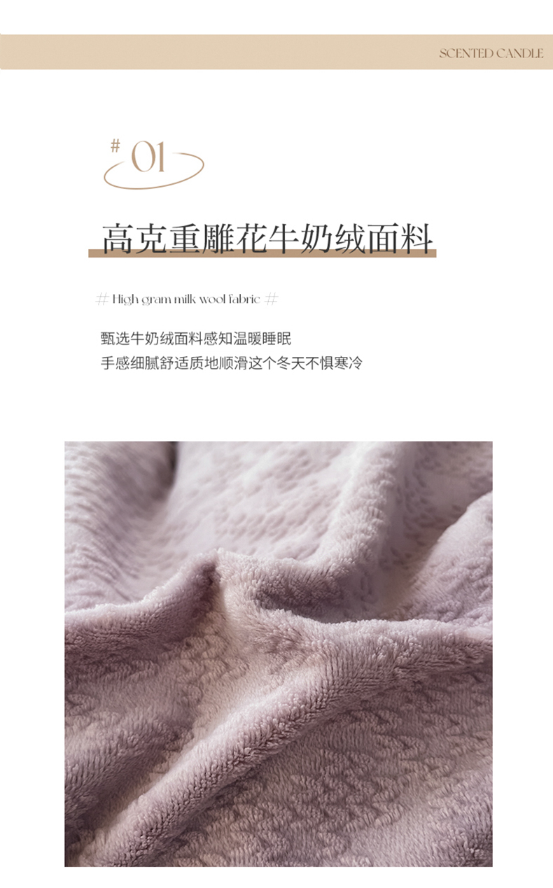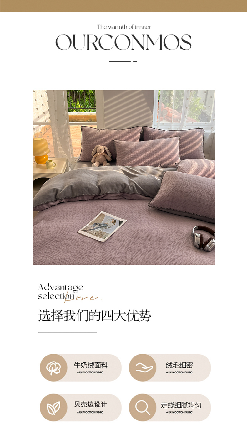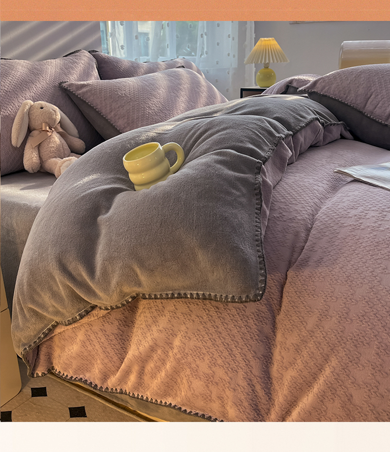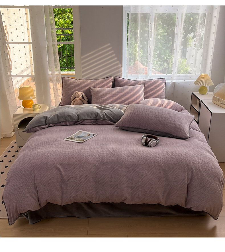 当前位置: 91家纺网 > 商品网购 > 床品套件 > 四件套 > 牛奶绒四件套 > 晚依家纺 2024新款230g纯色立体雕花牛奶绒四件套贝壳边加厚保暖定制定做 语格-灰紫