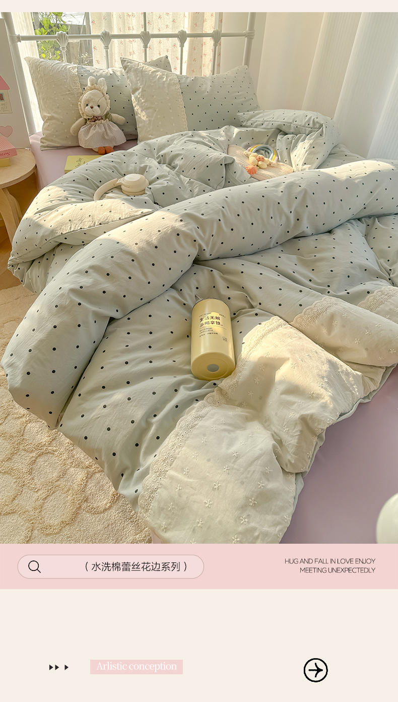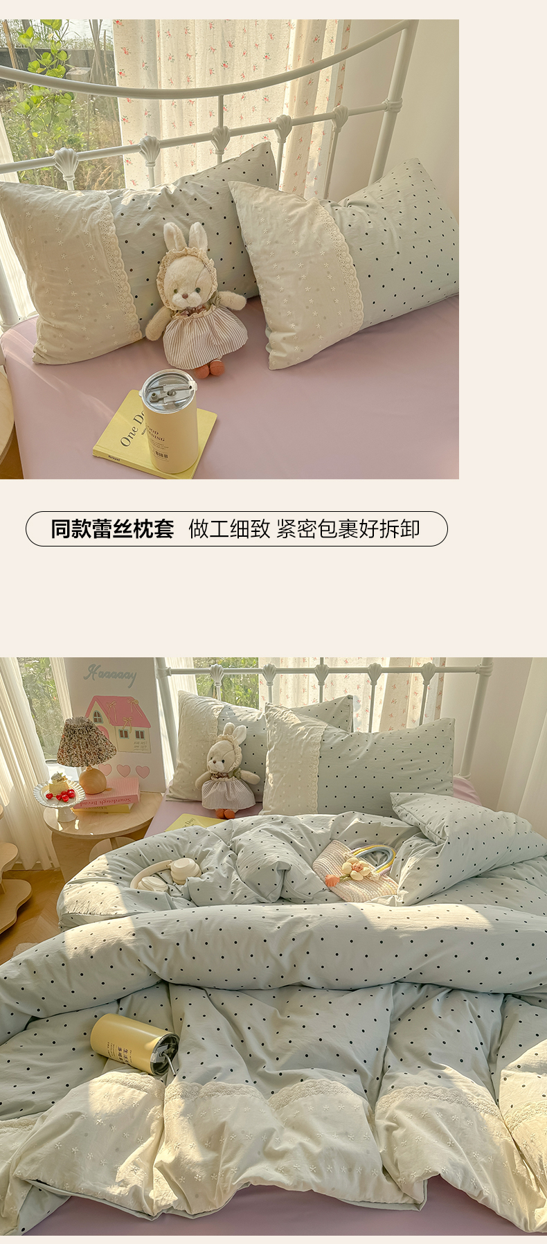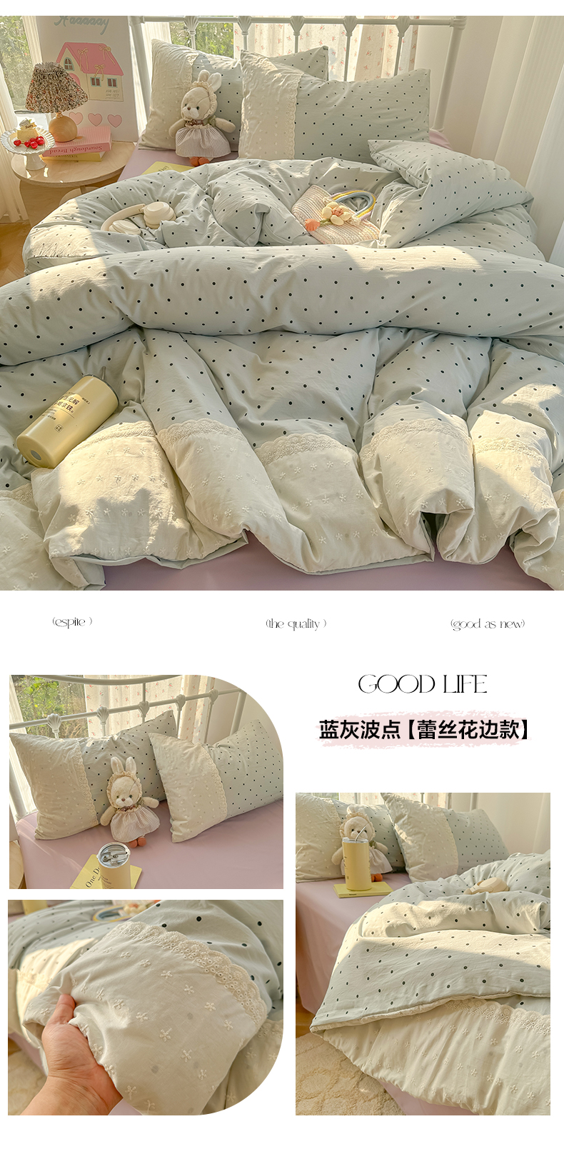 当前位置: 91家纺网 > 商品网购 > 床品套件 > 四件套 > 其它四件套 > 韩巢家纺 2025新款法式蕾丝花边被套直播热销款四件套学生宿舍床上三件套(提供卖家秀) 蓝灰波点【蕾丝花边款】