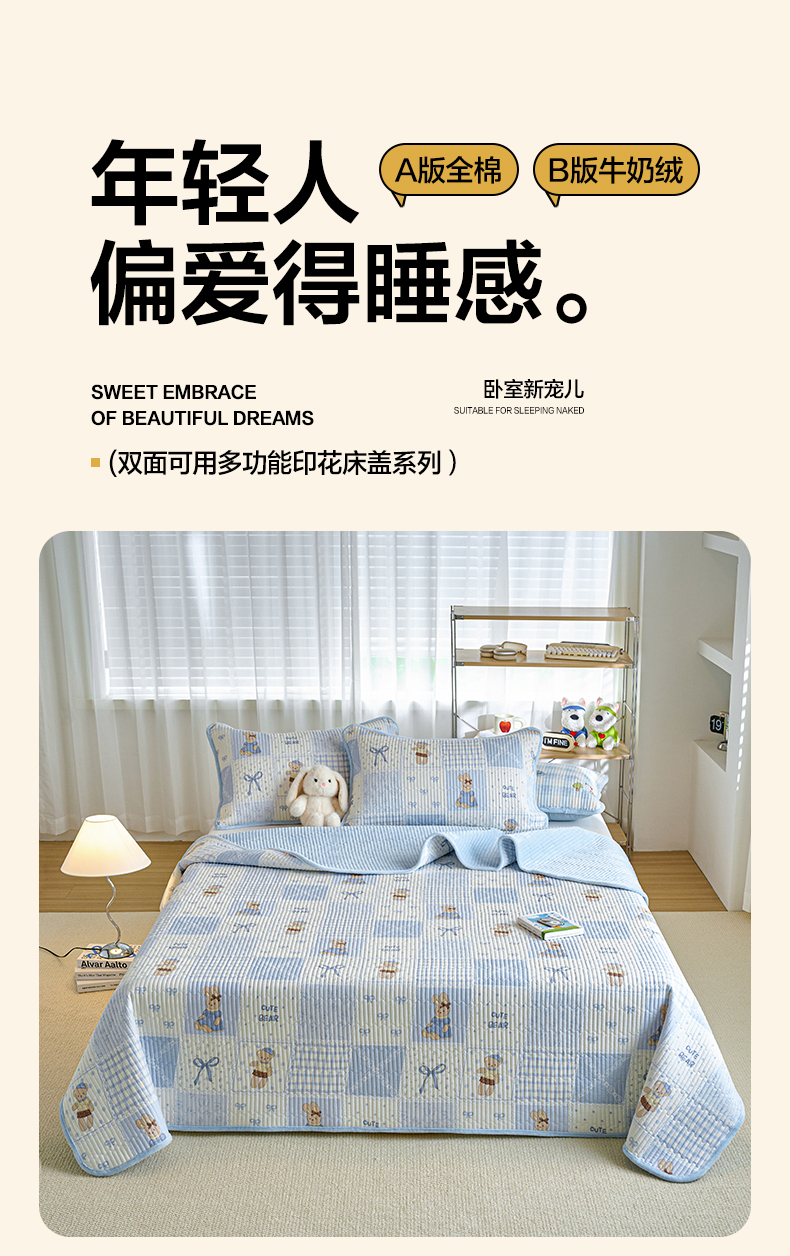 • 91家纺网 家纺一手货源 找家纺 (总)X猫先生 2026新品A全棉B牛奶绒床盖一面全棉一面牛奶绒床盖炕盖加厚床单床垫四季款系列三,焦糖南瓜格(A棉B棉),童年往事(A棉B绒),熊熊告白(A棉B绒),甜心汪星人(A棉B绒),星星柯基(A棉B绒),逗号日记(A棉B绒),莫奈花园(A棉B绒),幸运独角龙(A棉B绒),冒险家(A棉B绒),蘑菇小镇(A棉B绒),蓝格童话(A棉B绒),趴趴熊(A棉B绒),丹麦女孩(A棉B绒),春游兔兔(A棉B绒),贝利花都(A棉B绒),萌萌鸭(A棉B绒),花田囡囡(A棉B绒),哈哈狗(A棉B绒),丛草集(A棉B绒),奶呼小兔(A棉B绒),拉布兔兔(A棉B绒),繁花小熊(A棉B绒),甜心苹果派(A棉B绒),组合图