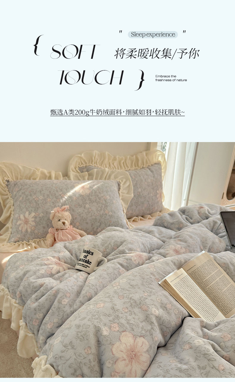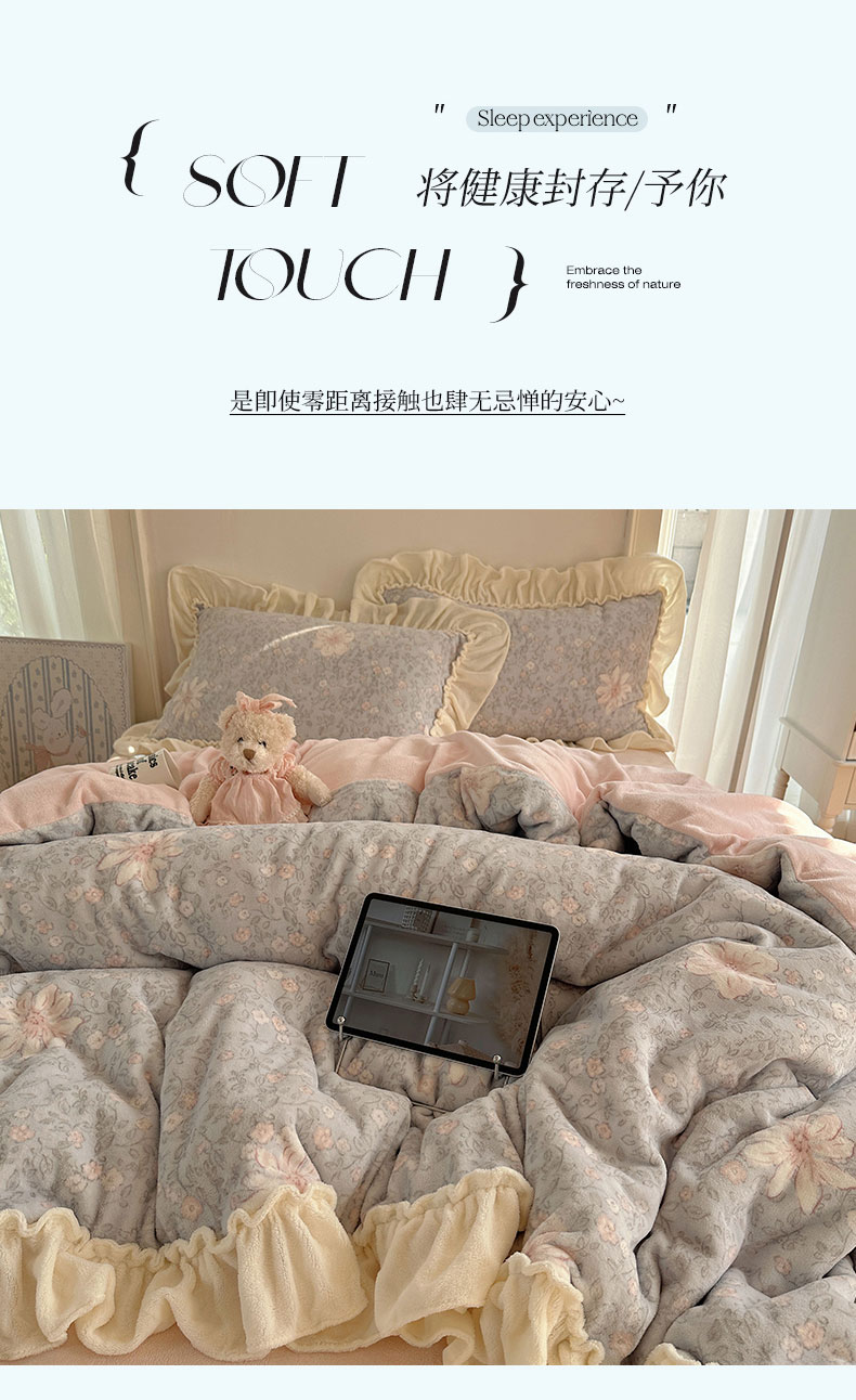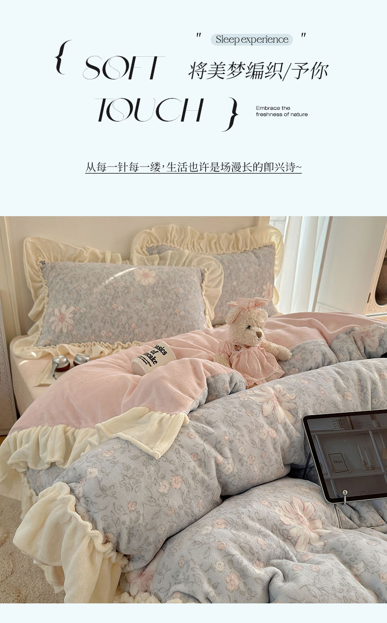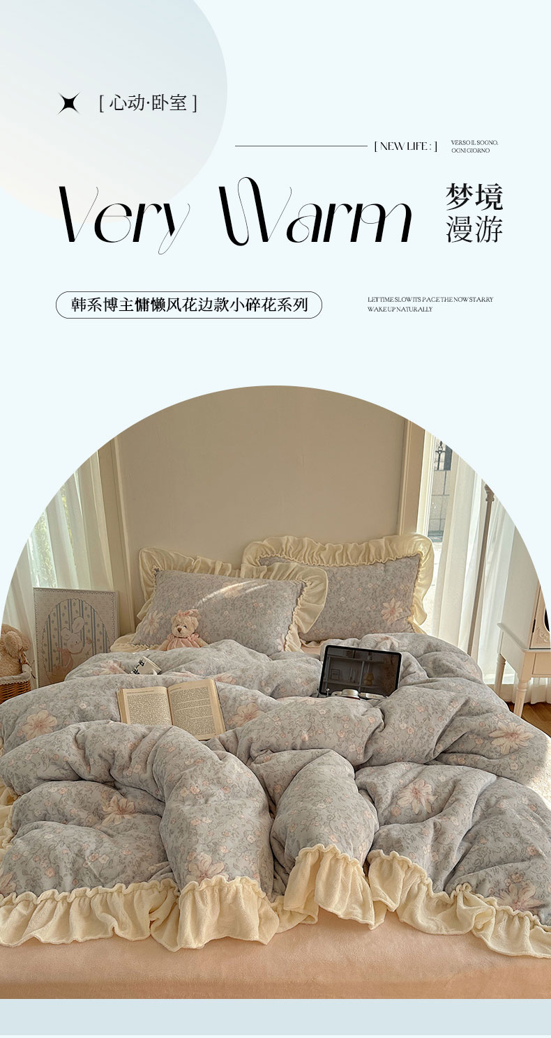 当前位置: 91家纺网 > 商品网购 > 床品套件 > 四件套 > 牛奶绒四件套 > 六巷胡同 2025新款韩系博主慵懒风小碎花A类牛奶绒花边款四件套 压花边-秋寻花鉴