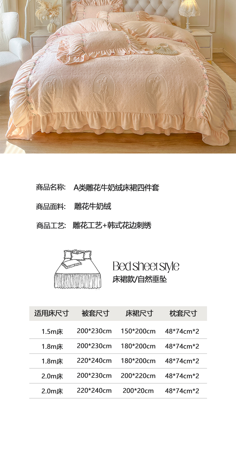 商品名称:(总)好儿喜家纺 2025新款法式雕花牛奶绒四件套床裙款-兰黛系列