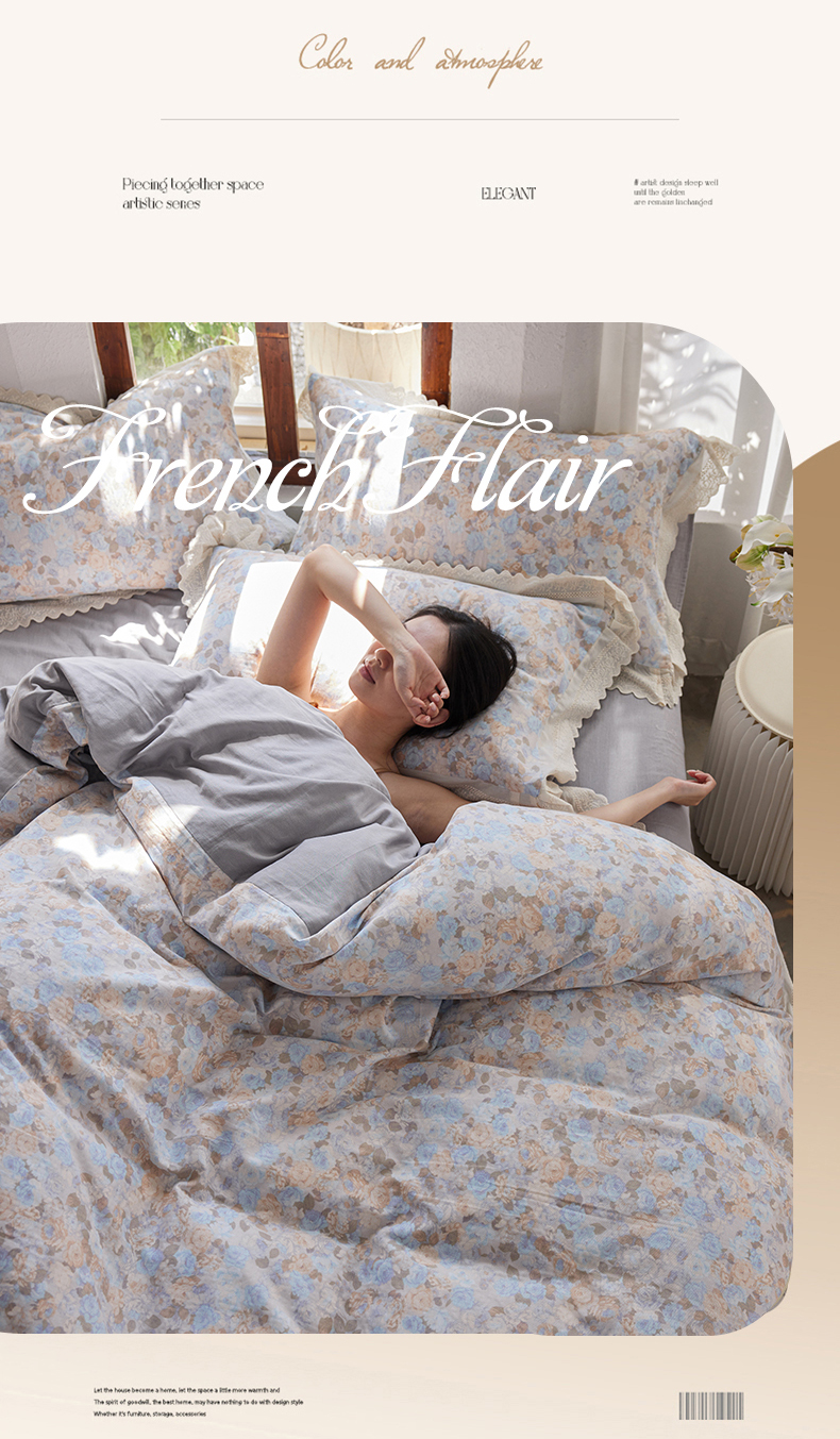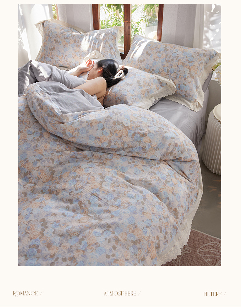 当前位置: 91家纺网 > 商品网购 > 床品套件 > 四件套 > 双层纱四件套 > 清雅福 2026春夏新品韩版全棉双层纱镂空花边系列四件套 半岛花园-兰