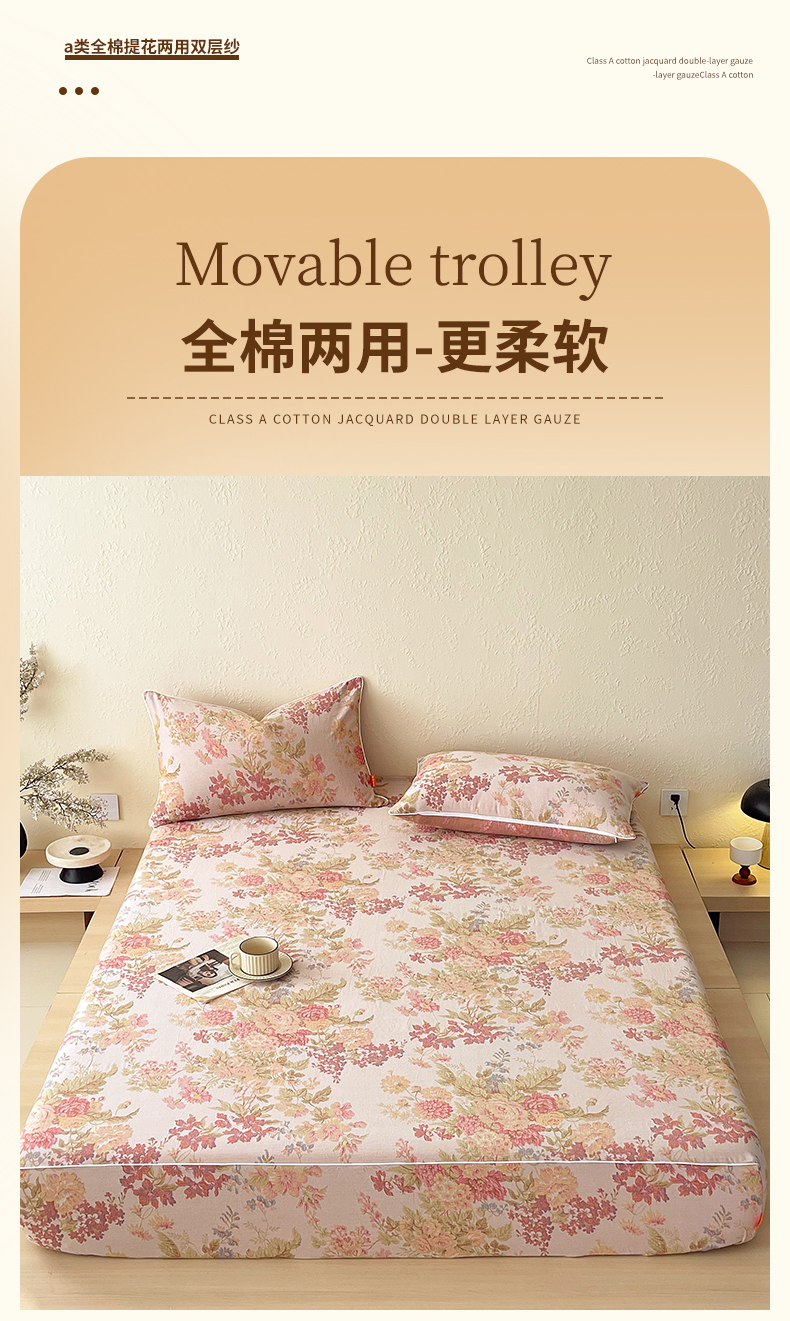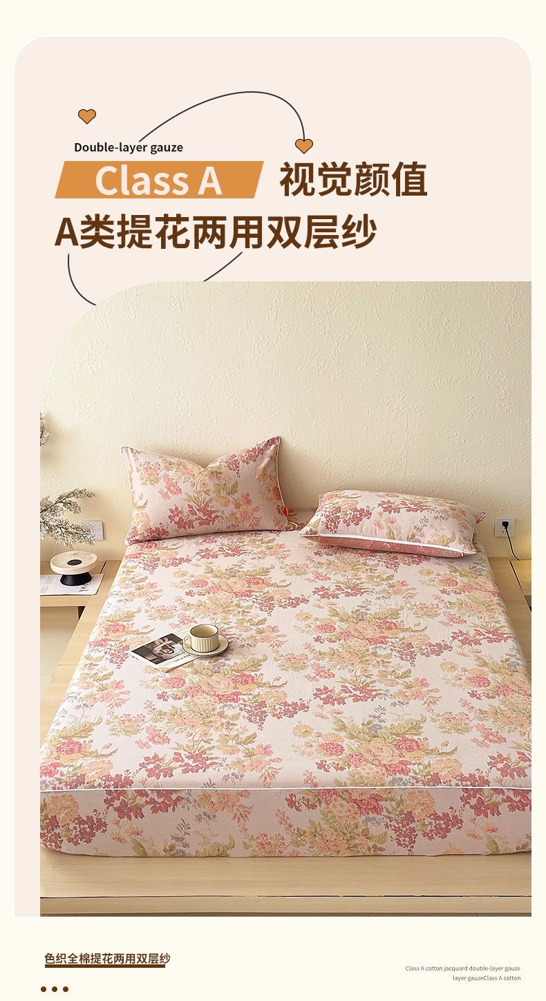 春皖家纺 2026春夏新款(正反两用)A类提花双层纱单床笠 霞沫