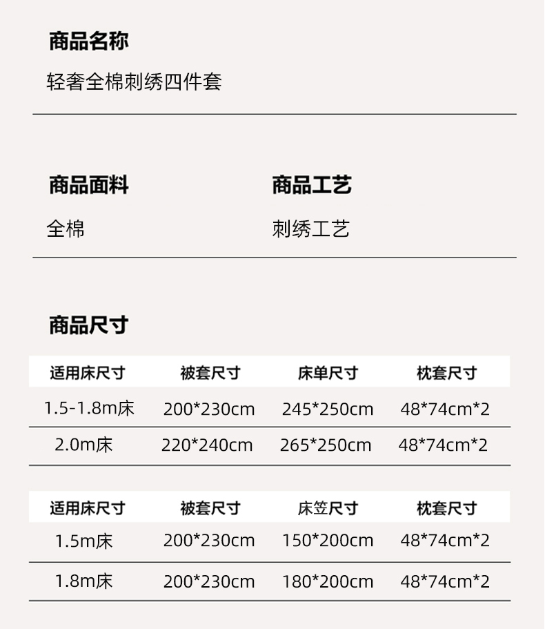 [{"sp_id":11,"sp_name":"\u989c\u8272","sp_format":2,"sp_list":[{"sp_value_id":1662,"sp_value_name":"\u606c\u871c\u5149\u5e74-\u7c89","sp_value_image":{"id":999,"path":"https:\/\/img3.91jf.com\/ghelp\/2026\/20260205\/20260205143627_272363.jpg"},"sp_value_video":{"id":0,"img":"","path":"","time":0,"download_num":0,"play_num":0},"price":"215.00","storage":2500,"weight":"2.800","is_check_weight":0,"plus_price":"","sp_sort":0},{"sp_value_id":1663,"sp_value_name":"\u606c\u871c\u5149\u5e74-\u7070","sp_value_image":{"id":999,"path":"https:\/\/img3.91jf.com\/ghelp\/2026\/20260205\/20260205143631_405703.jpg"},"sp_value_video":{"id":0,"img":"","path":"","time":0,"download_num":0,"play_num":0},"price":"215.00","storage":2500,"weight":"2.800","is_check_weight":0,"plus_price":"","sp_sort":0}]},{"sp_id":10,"sp_name":"\u5c3a\u5bf8","sp_format":1,"sp_list":[{"sp_value_id":41,"sp_value_name":"1.5m\u5e8a\u5355\u6b3e\u56db\u4ef6\u5957","sp_value_image":{"id":0,"path":""},"sp_value_video":{"id":0,"img":"","path":"","time":0,"download_num":0,"play_num":0},"price":"215.00","storage":500,"weight":"2.800","is_check_weight":0,"plus_price":"","sp_sort":5},{"sp_value_id":42,"sp_value_name":"1.8m\u5e8a\u5355\u6b3e\u56db\u4ef6\u5957","sp_value_image":{"id":0,"path":""},"sp_value_video":{"id":0,"img":"","path":"","time":0,"download_num":0,"play_num":0},"price":"215.00","storage":500,"weight":"2.800","is_check_weight":0,"plus_price":"","sp_sort":6},{"sp_value_id":43,"sp_value_name":"2.0m\u5e8a\u5355\u6b3e\u56db\u4ef6\u5957","sp_value_image":{"id":0,"path":""},"sp_value_video":{"id":0,"img":"","path":"","time":0,"download_num":0,"play_num":0},"price":"235.00","storage":500,"weight":"2.800","is_check_weight":0,"plus_price":"","sp_sort":7},{"sp_value_id":44,"sp_value_name":"1.5m\u5e8a\u7b20\u6b3e\u56db\u4ef6\u5957","sp_value_image":{"id":0,"path":""},"sp_value_video":{"id":0,"img":"","path":"","time":0,"download_num":0,"play_num":0},"price":"225.00","storage":500,"weight":"3.100","is_check_weight":0,"plus_price":"","sp_sort":8},{"sp_value_id":45,"sp_value_name":"1.8m\u5e8a\u7b20\u6b3e\u56db\u4ef6\u5957","sp_value_image":{"id":0,"path":""},"sp_value_video":{"id":0,"img":"","path":"","time":0,"download_num":0,"play_num":0},"price":"225.00","storage":500,"weight":"3.100","is_check_weight":0,"plus_price":"","sp_sort":9}]}]