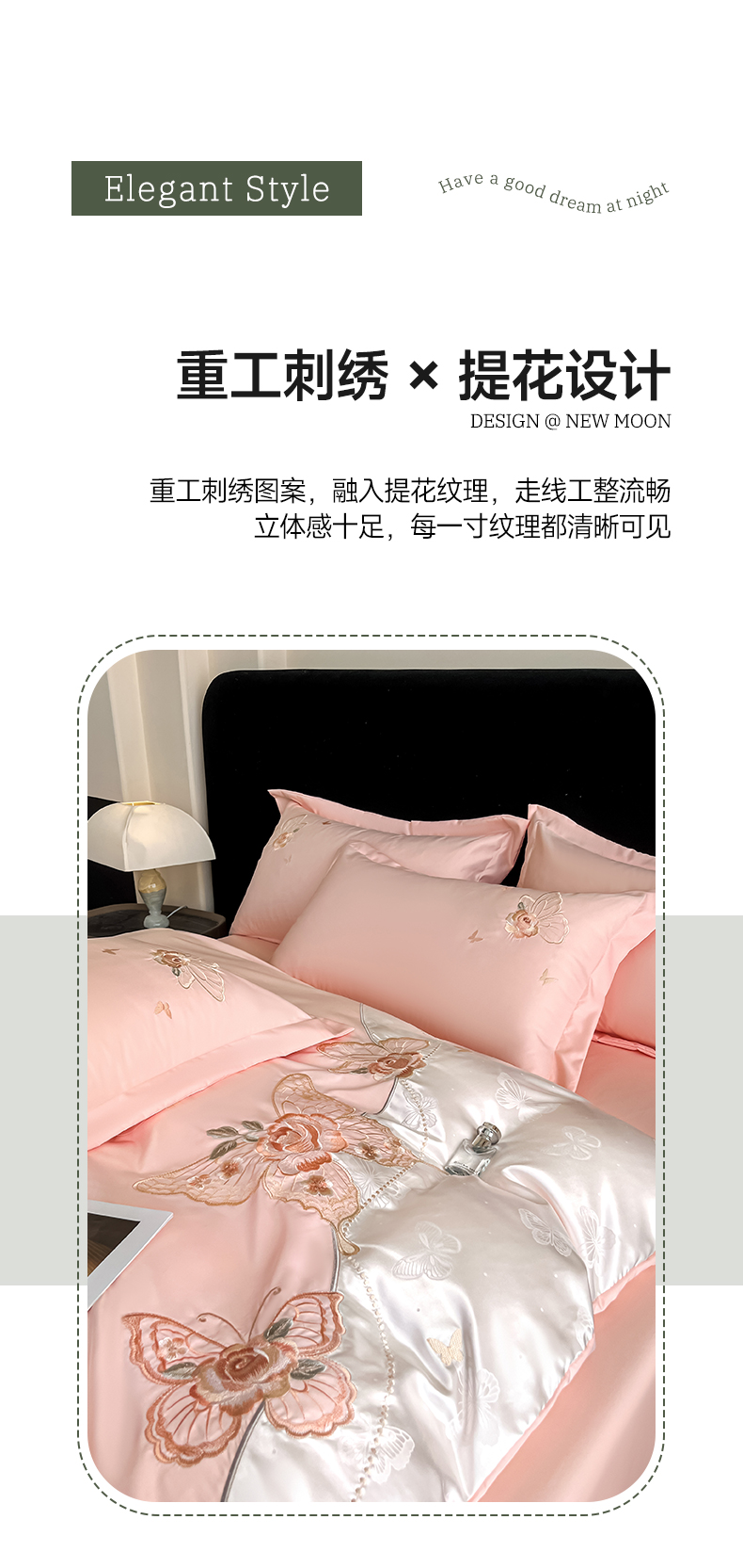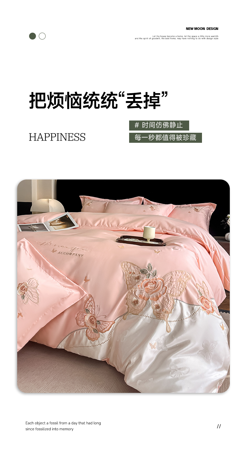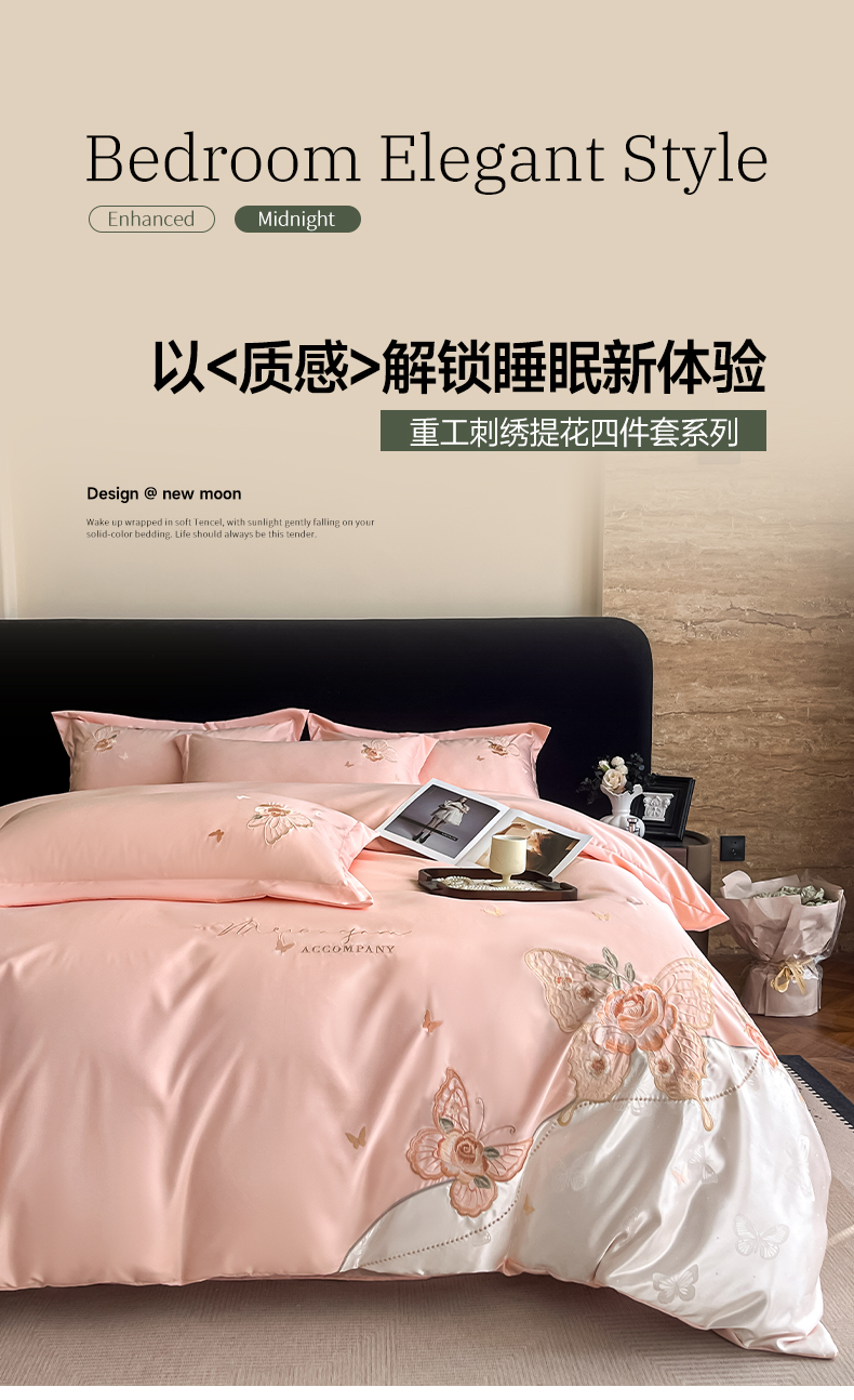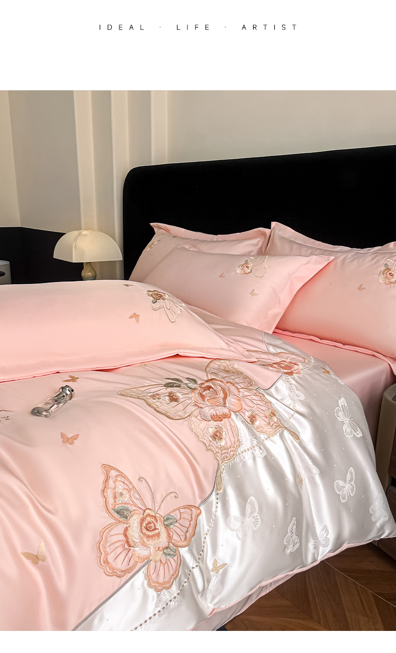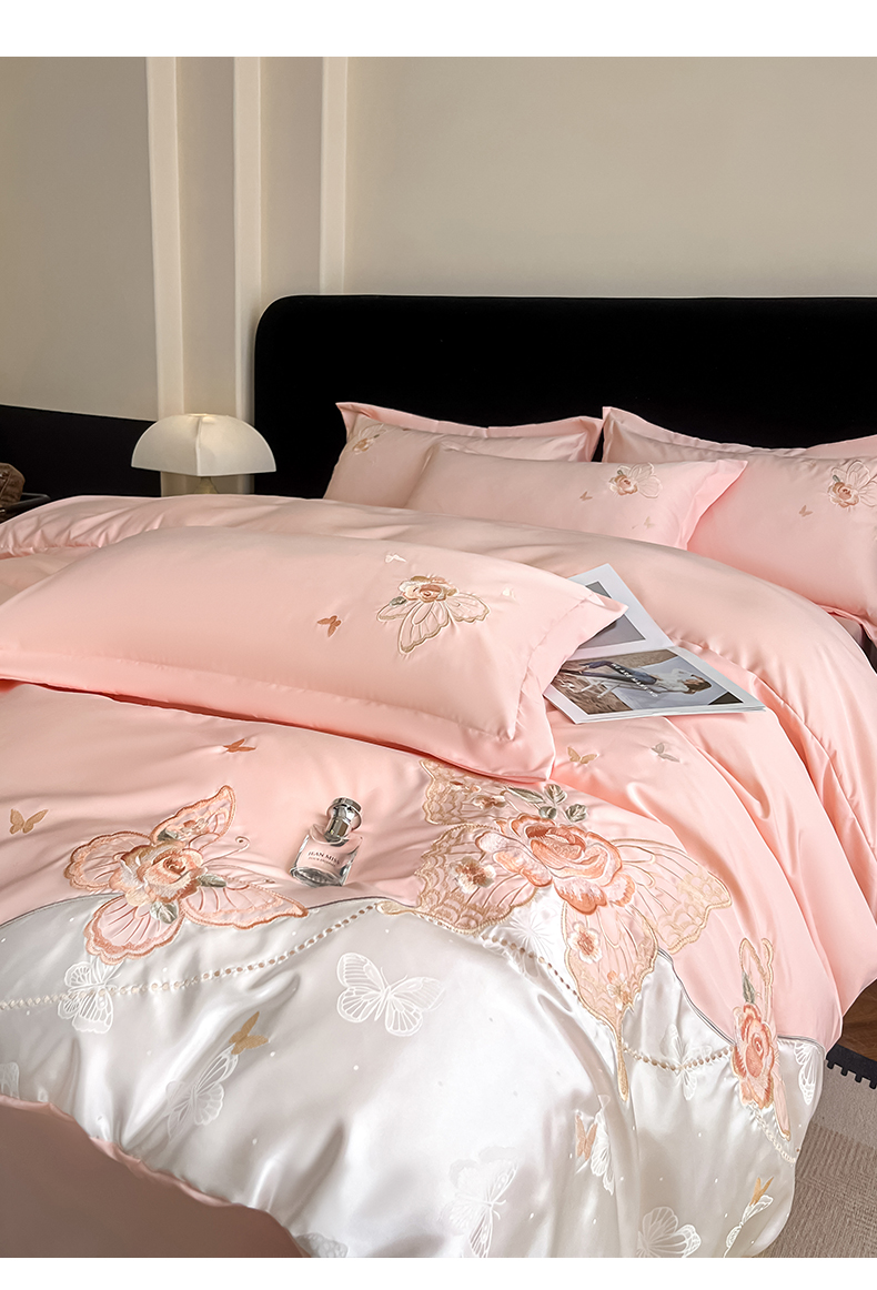 金牛座家纺 2026新款细斜纹亮丝提花贴布绣重工刺绣四件套-潘妮系列 潘妮-嫩粉
